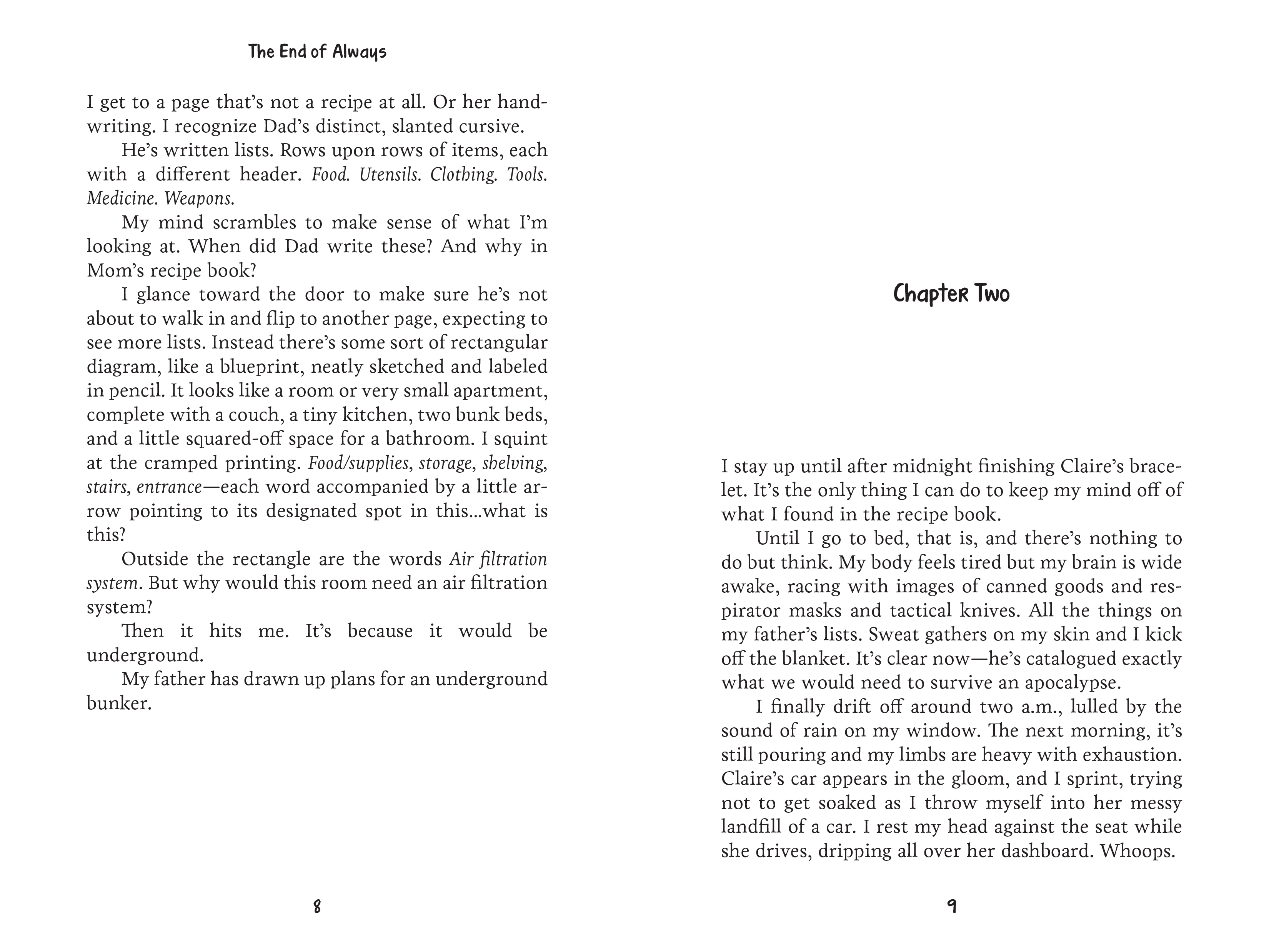Ever since Isobel’s mom died, her dad won’t stop preparing for the rest of the world to end—attending doomsday survivalist meetings, packing bug-out bags, and drawing up plans for a secret backyard bunker. He’s methodically stacked and stored countless packs of batteries and bottles of water in the basement. And thirty-six cans of tomato soup.