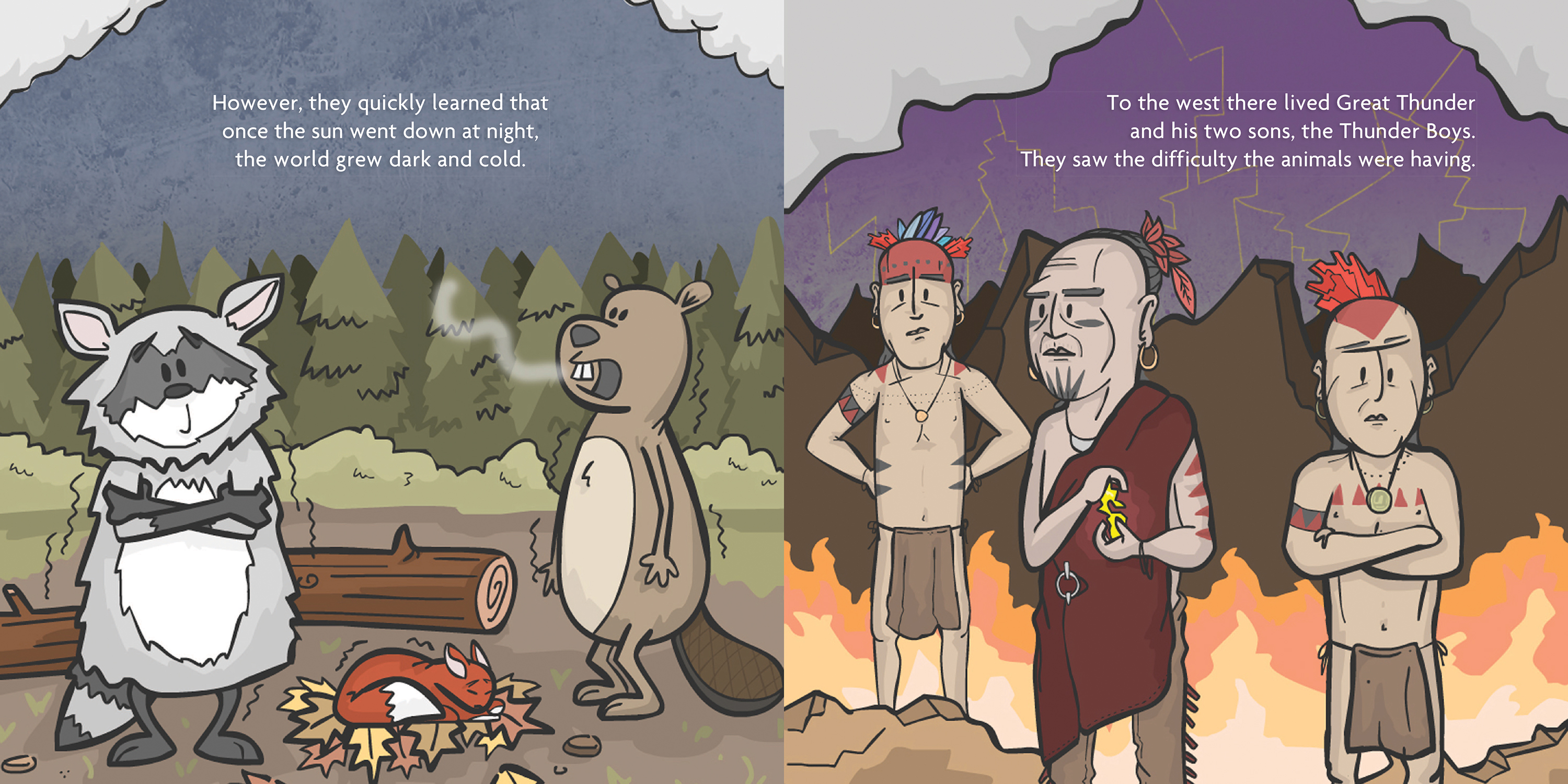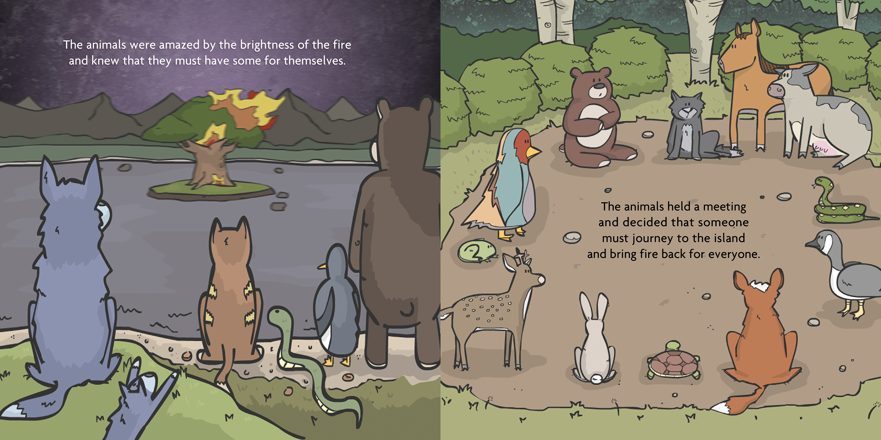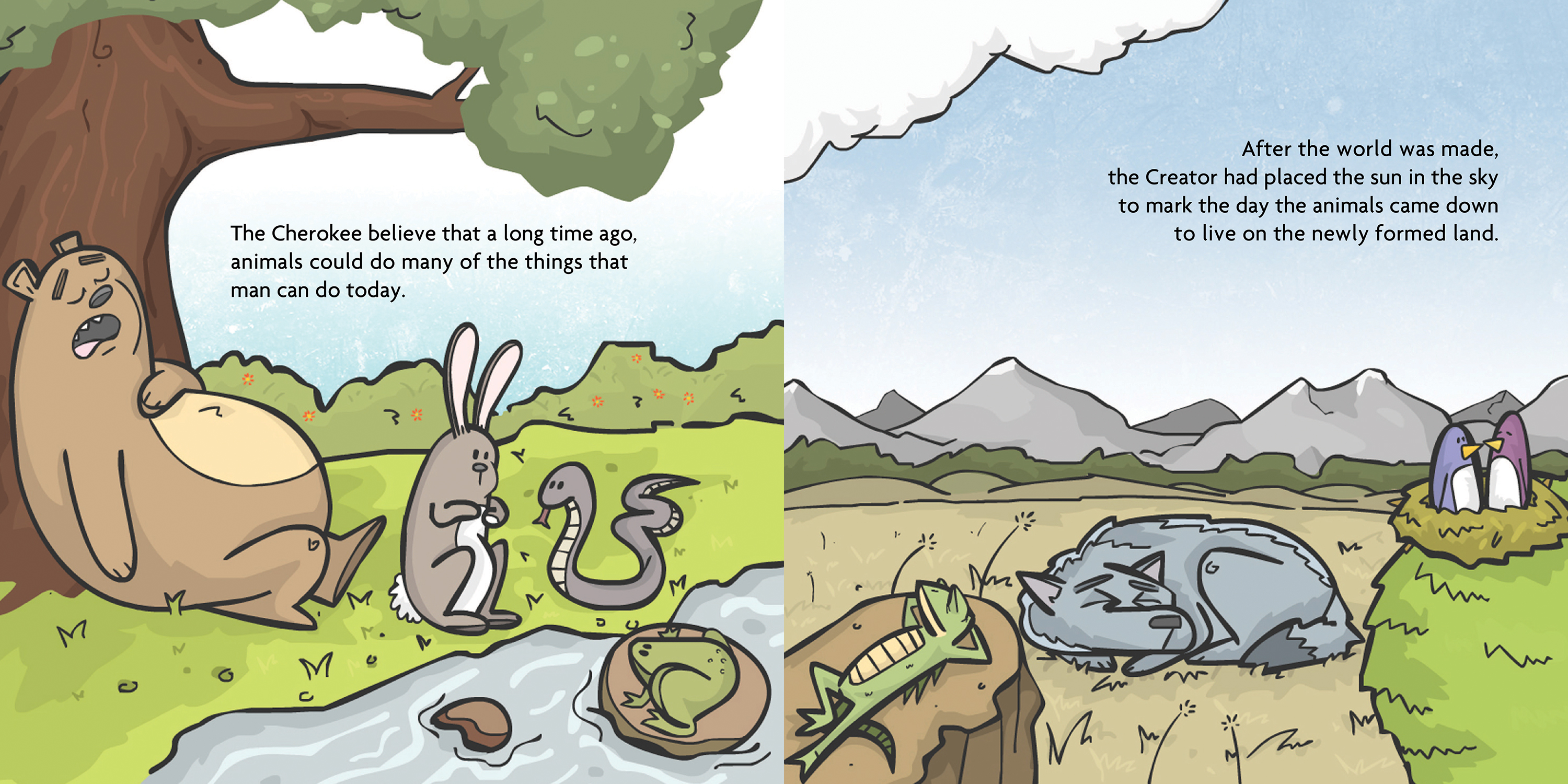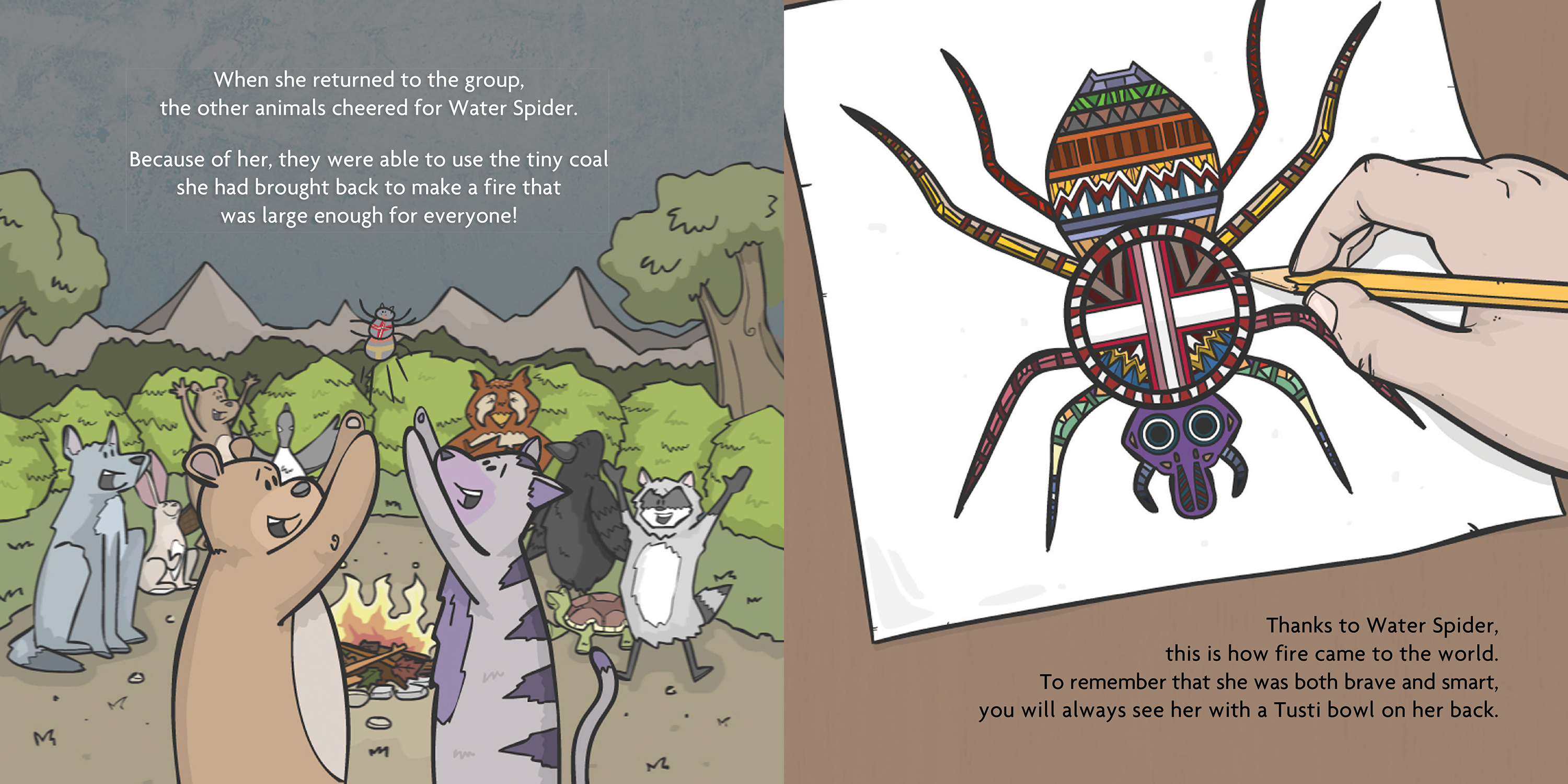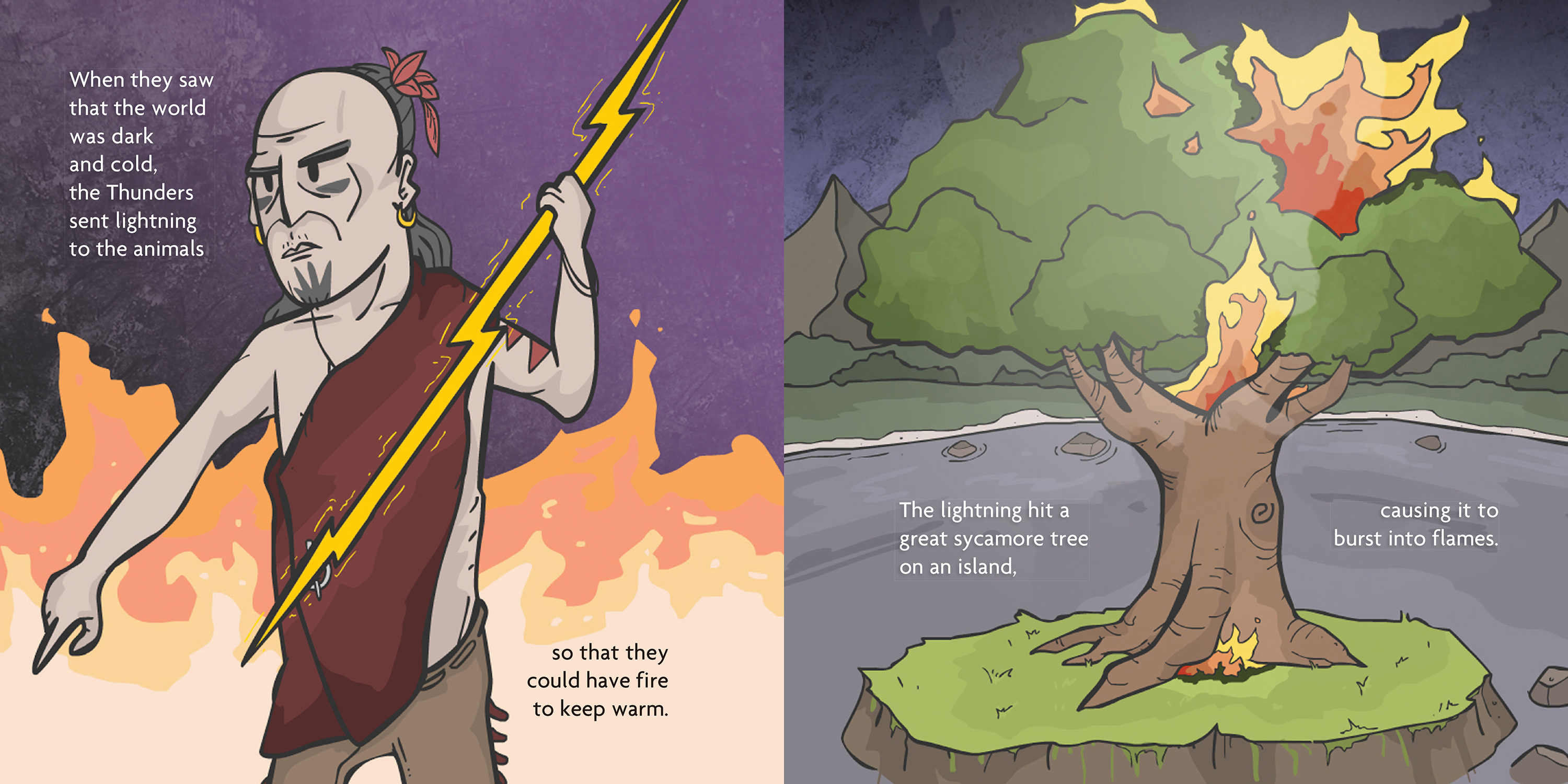 The First Fire, A Cherokee Story takes place in a time when animals could do many of the things that people do. The Creator gave the animals the world to live on, but they were without a source for heat at night. Great Thunder and his sons saw the plight of the animals so he sent lightning down to strike a tree. The tree burst into flames but the tree was on an island. Many animals tried to bring the fire over the water to the shore, but they were all unsuccessful. Then one small creature, Water Spider, volunteered. Curious, the animals said to her “We know you could get there safely, but how would you bring the fire back without getting burned?”