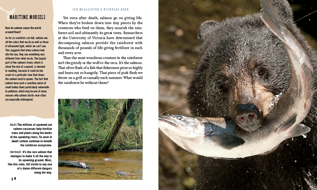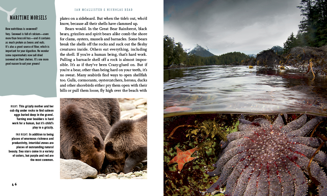 Following up the success of their first two books about the Great Bear Rainforest, The Salmon Bears and The Sea Wolves, Ian McAllister and Nicholas Read take readers on an expedition into the wondrous and mysterious underwater world of the Great Bear Sea. Filled with spectacular images of this largely unknown part of the world, the book also explores the uncertain future of the Great Bear Sea in this age of climate change, overfishing, pipelines and oil tankers. Can a rainforest full of rare spirit bears, fishing wolves and great grizzlies survive without a Great Bear Sea to feed and nourish it?