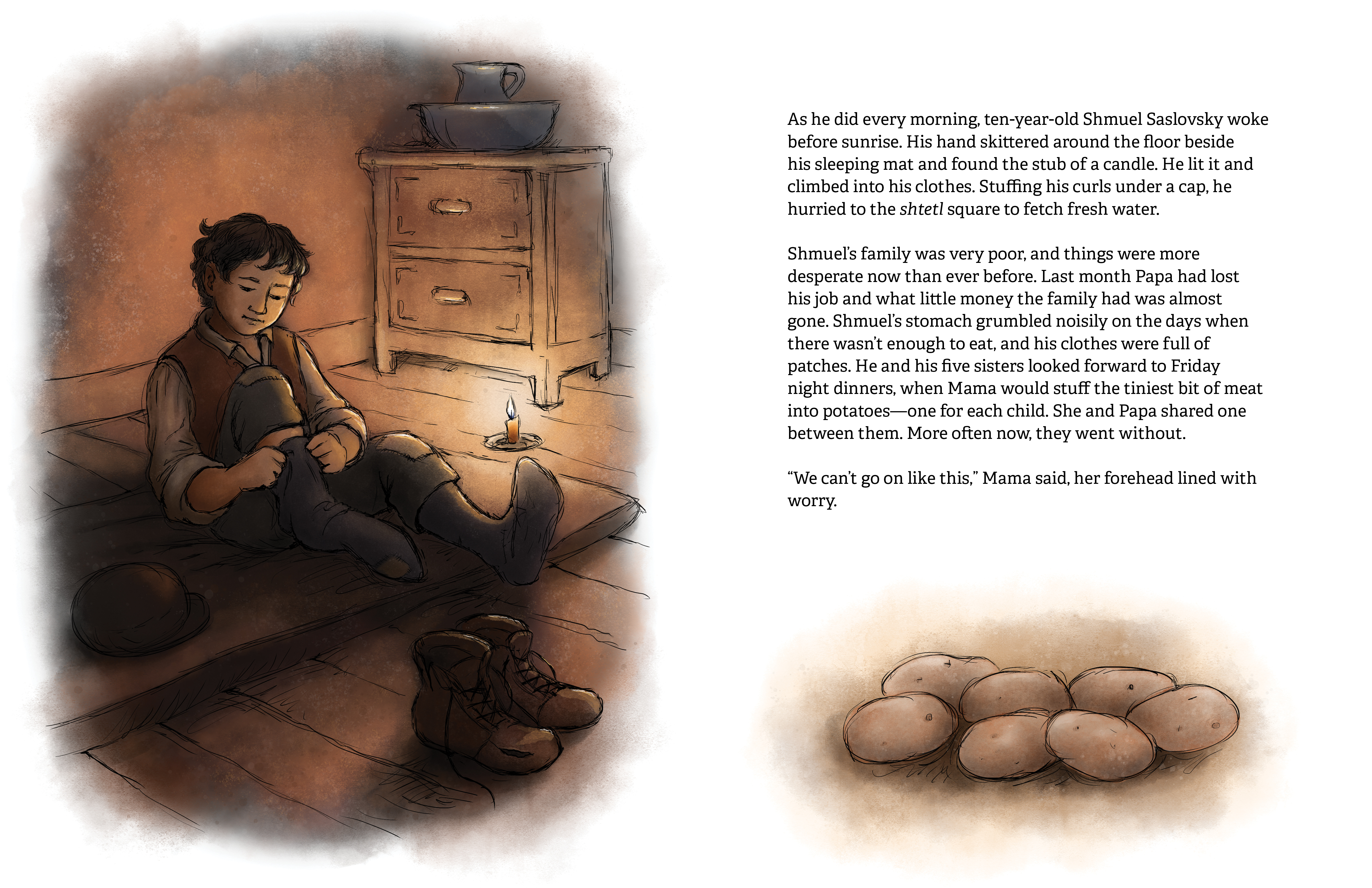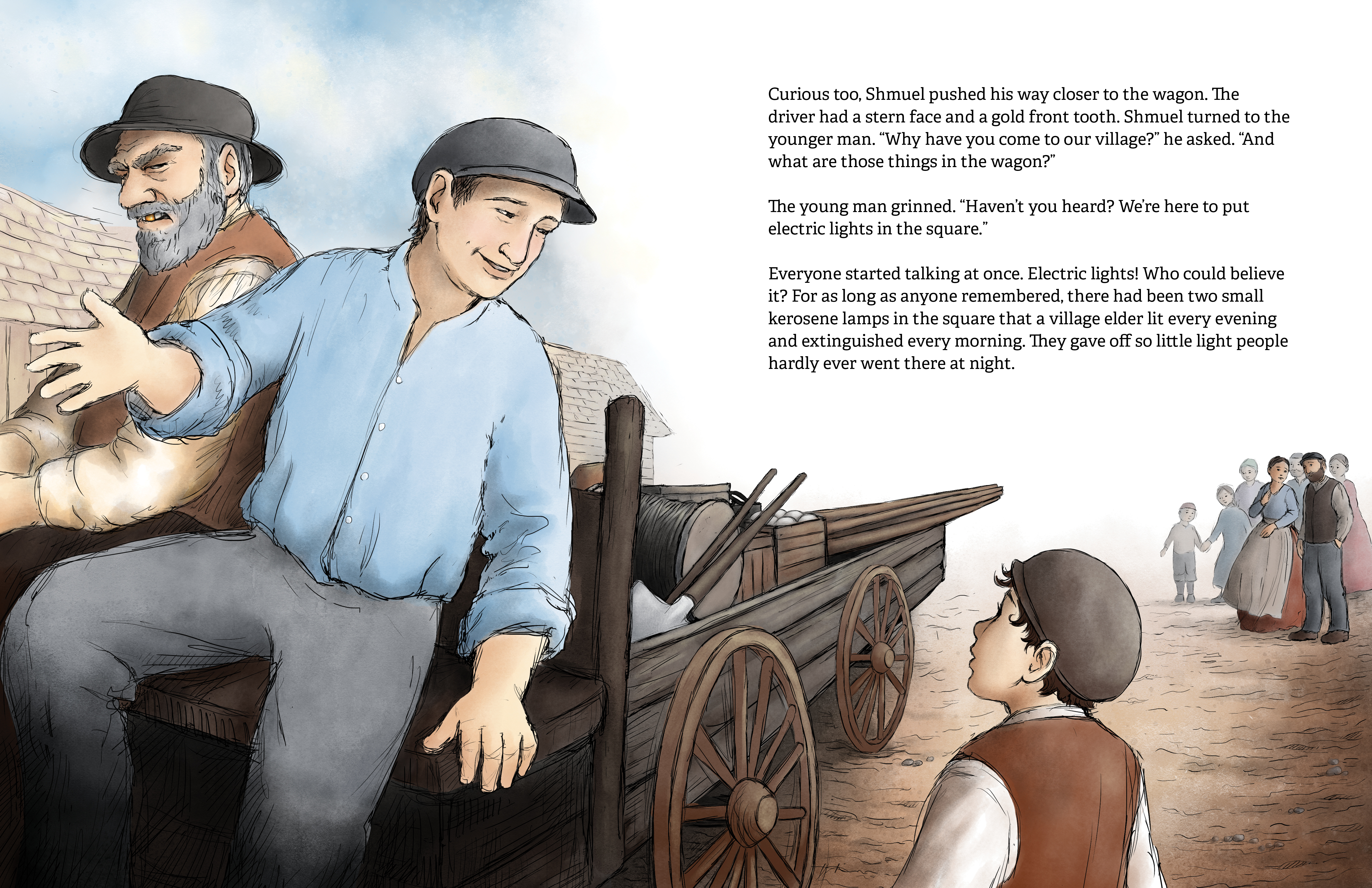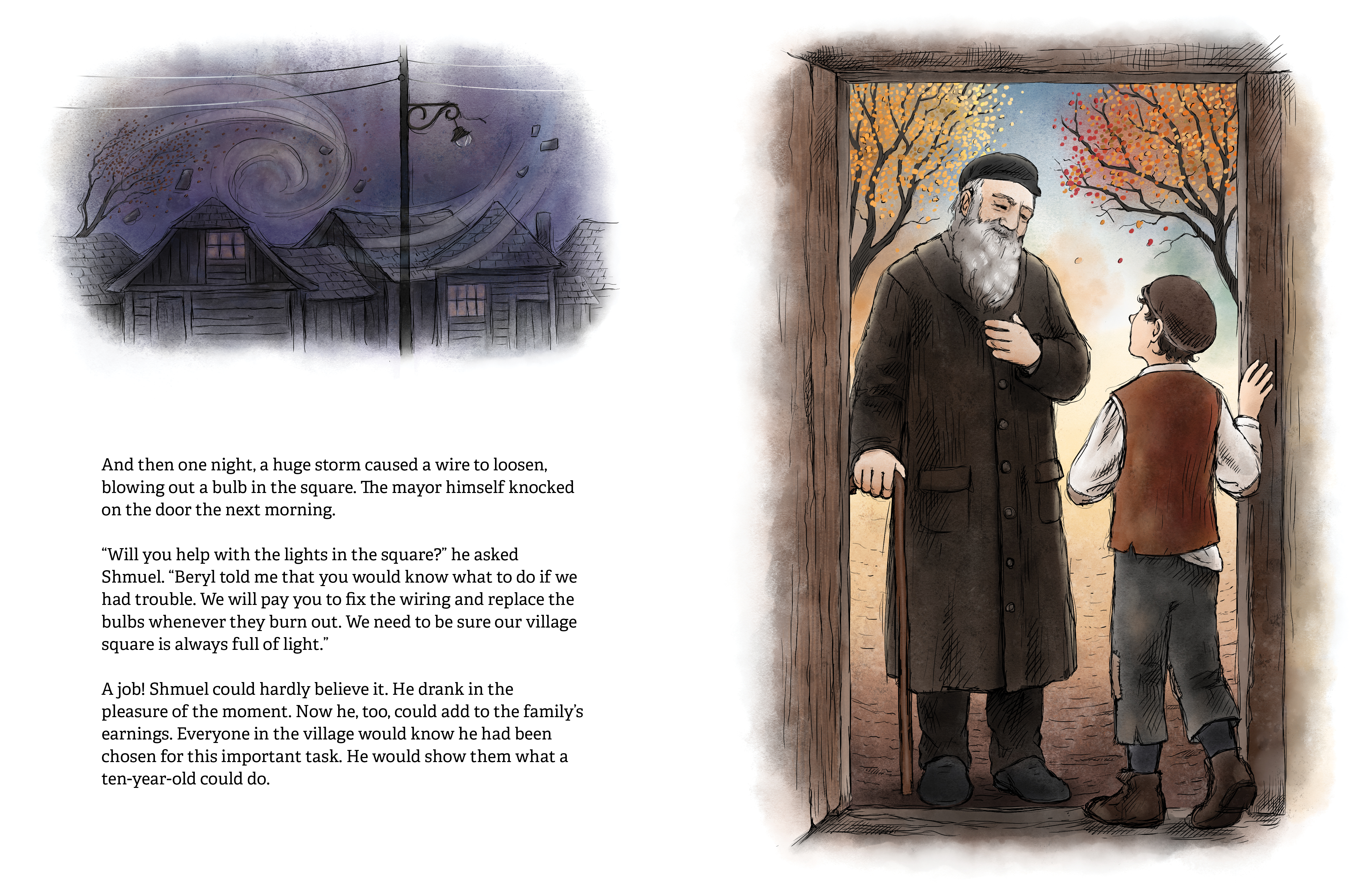 Shmuel is eager to help support his poor family, but no one in his shtetl is interested in hiring a ten-year-old boy. One day, the village installs new electric lamps, bringing light to their square and dazzling away the dark. Until a lamp breaks during a storm—and Shmuel is the only one who can fix it. Will Shmuel be able to conquer his fear of heights and bring light back to his town?