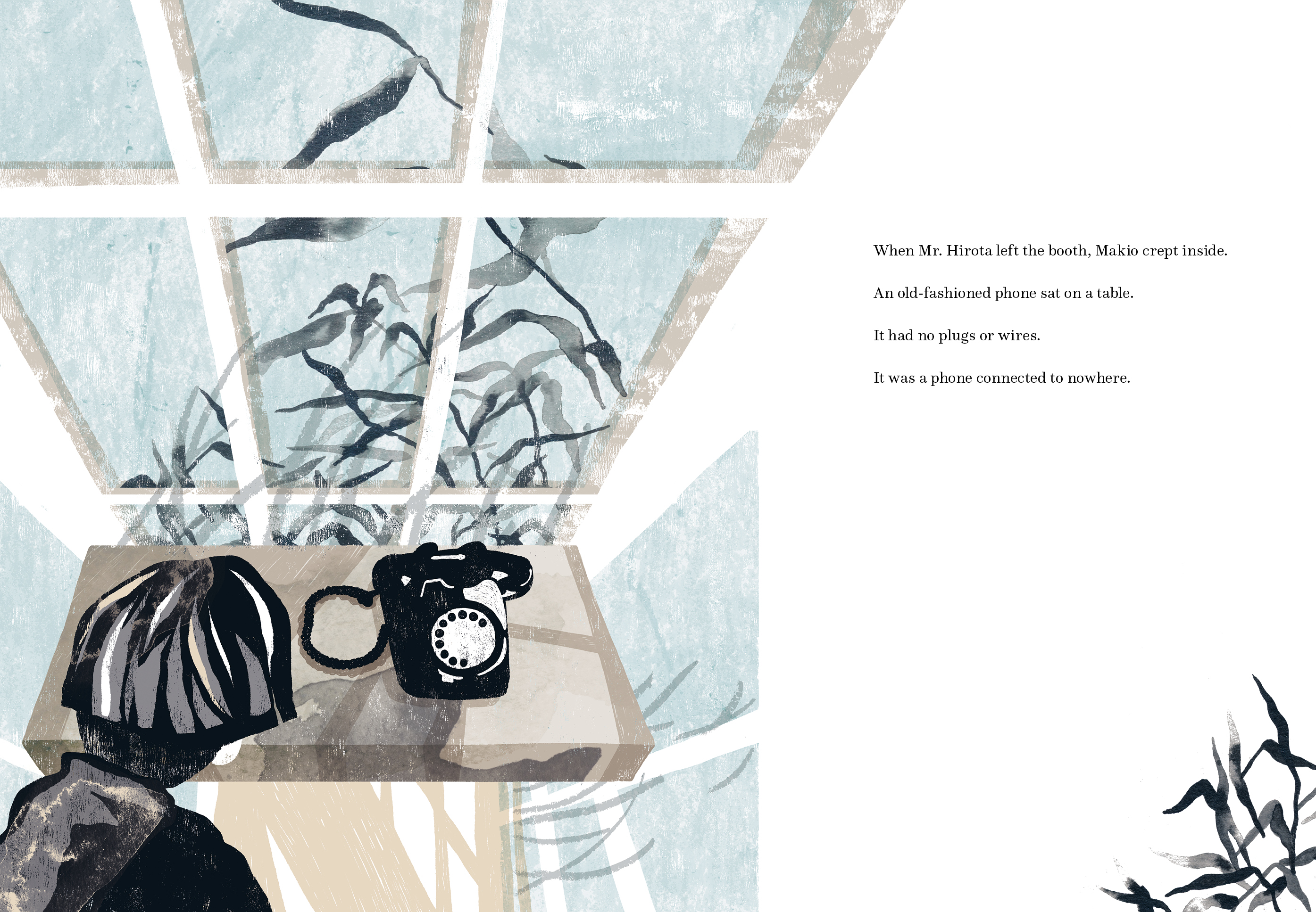 The Phone Booth in Mr. Hirota's Garden is inspired by the true story of the wind phone in Otsuchi, Japan, which was created by artist Itaru Sasaki. He built the phone booth so he could speak to his cousin who had passed, saying, "My thoughts couldn't be relayed over a regular phone line, I wanted them to be carried on the wind." The Tohoku earthquake and tsunami in 2011 destroyed the town of Otsuchi, claiming 10 percent of the population. Residents of Otsuchi and pilgrims from other affected communities have been traveling to the wind phone since the tsunami.