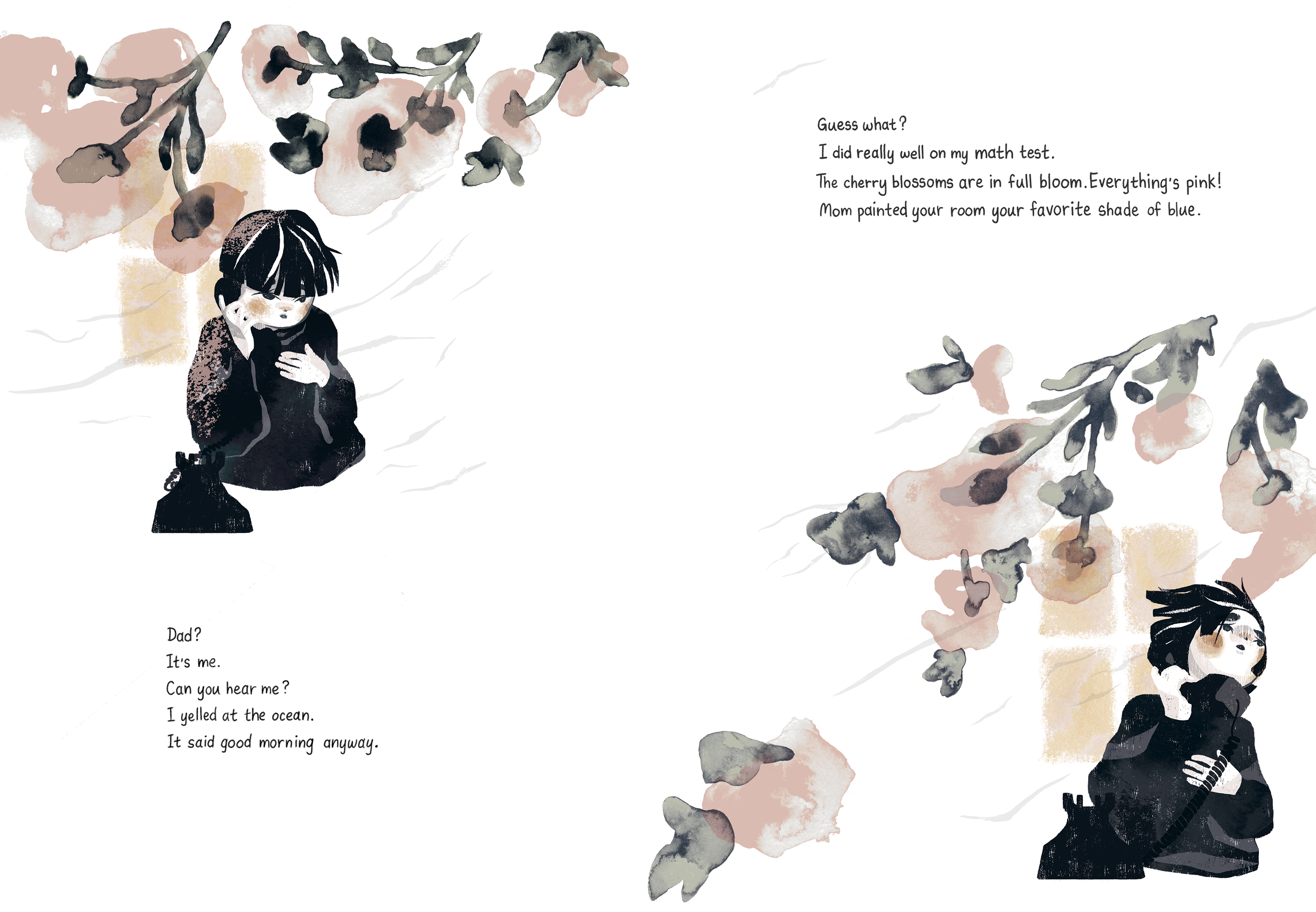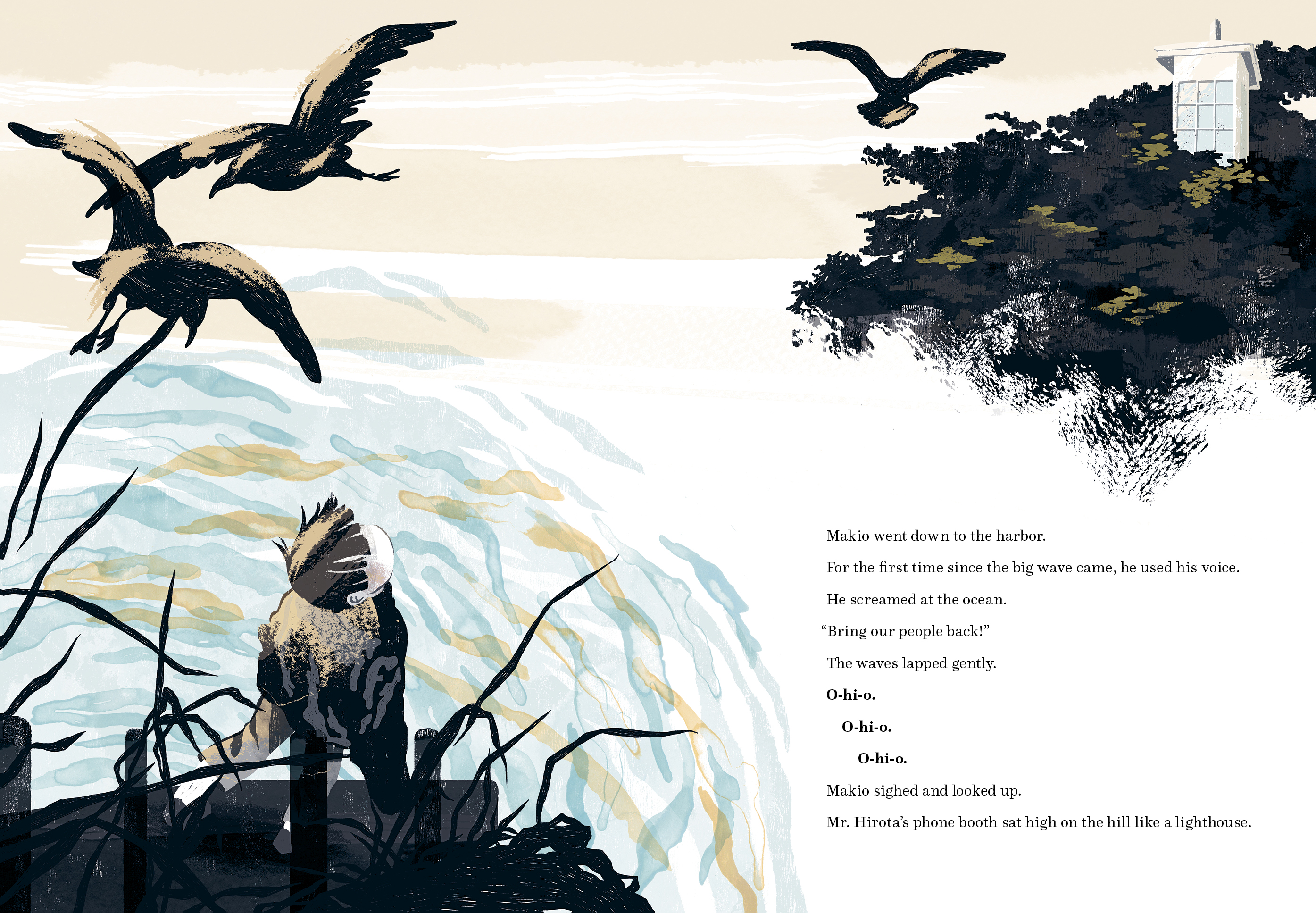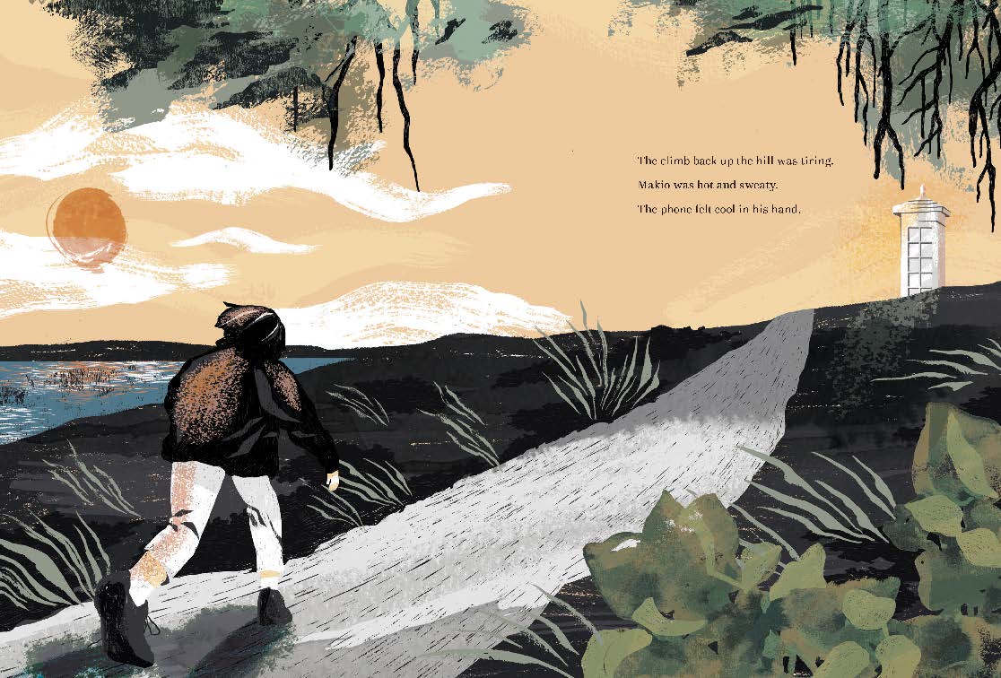 When the tsunami destroyed Makio's village, Makio lost his father . . . and his voice. The entire village is silenced by grief, and the young child's anger at the ocean grows. Then one day his neighbor, Mr. Hirota, begins a mysterious project—building a phone booth in his garden. At first Makio is puzzled; the phone isn't connected to anything. It just sits there, unable to ring. But as more and more villagers are drawn to the phone booth, its purpose becomes clear to Makio: the disconnected phone is connecting people to their lost loved ones. Makio calls to the sea to return what it has taken from him and ultimately finds his voice and solace in a phone that carries words on the wind.
