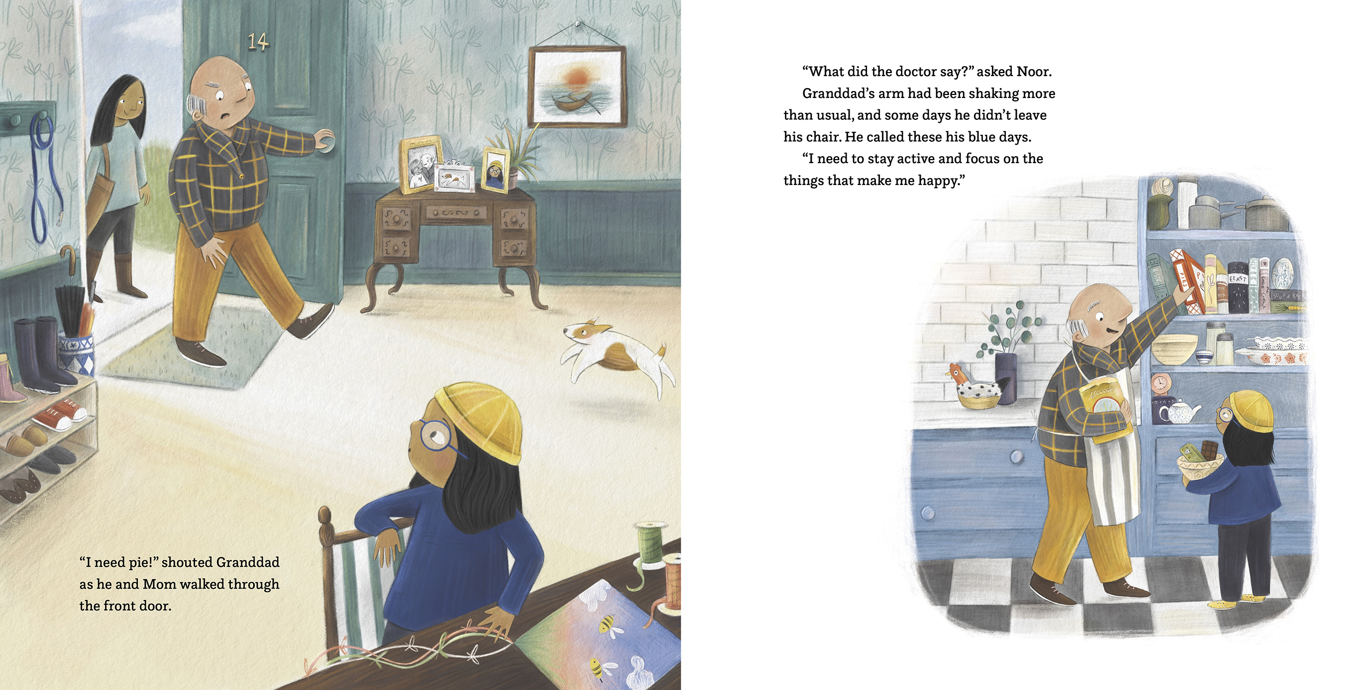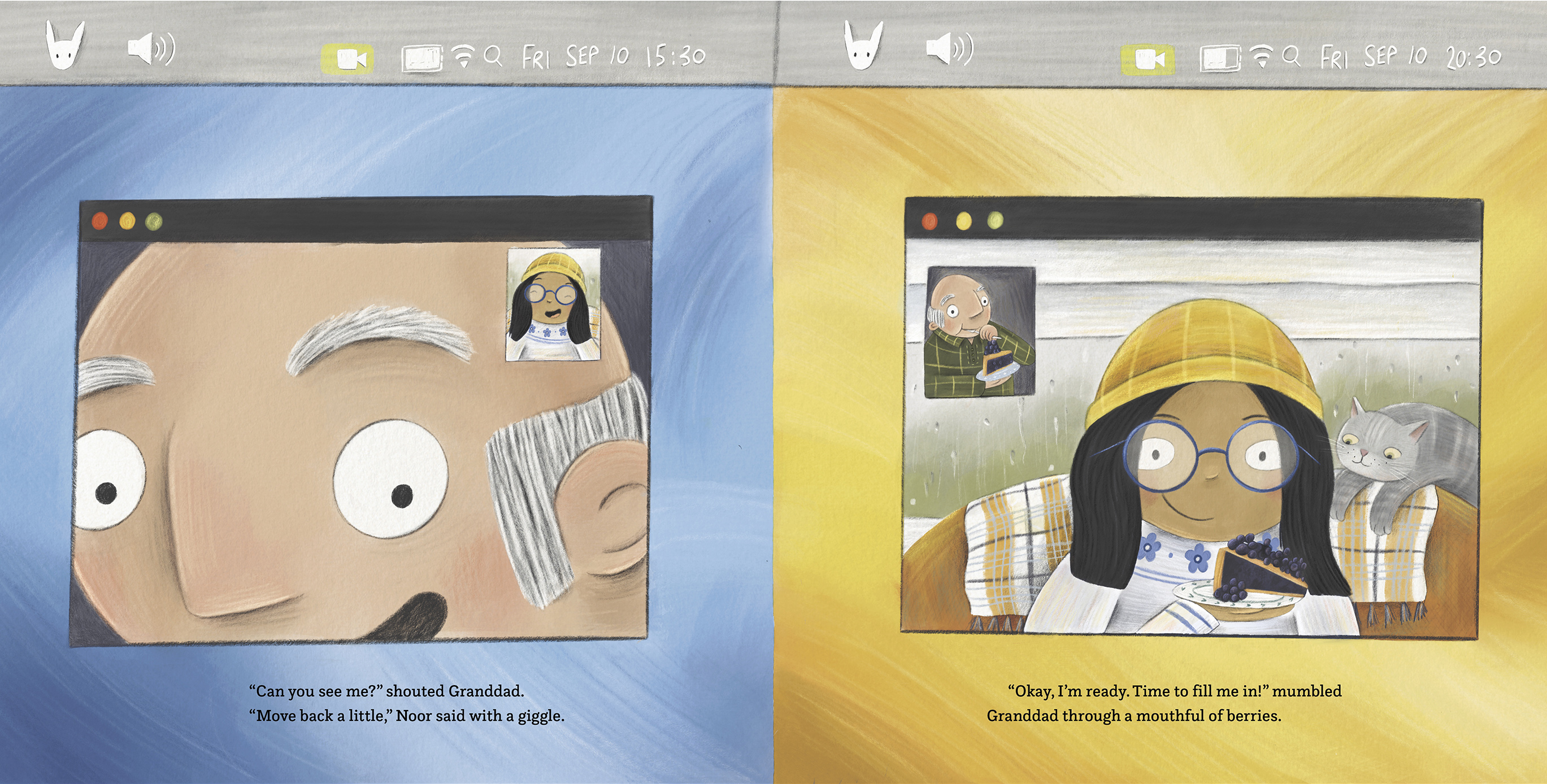 Then one day, Granddad doesn't log in. He's experiencing more blue days and doesn't feel like talking. Noor decides to write down her pie reports, holding space for Granddad until he feels ready.