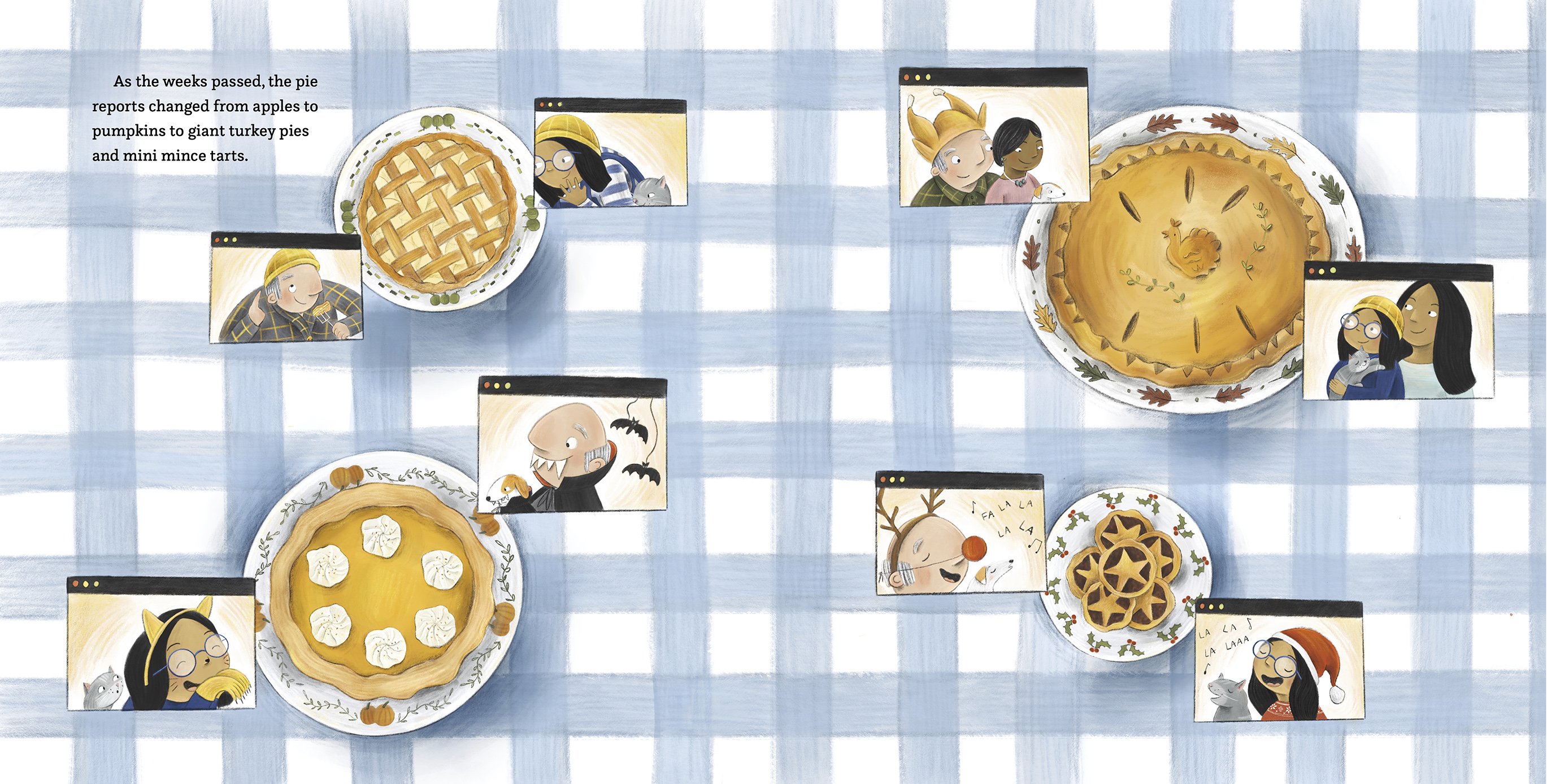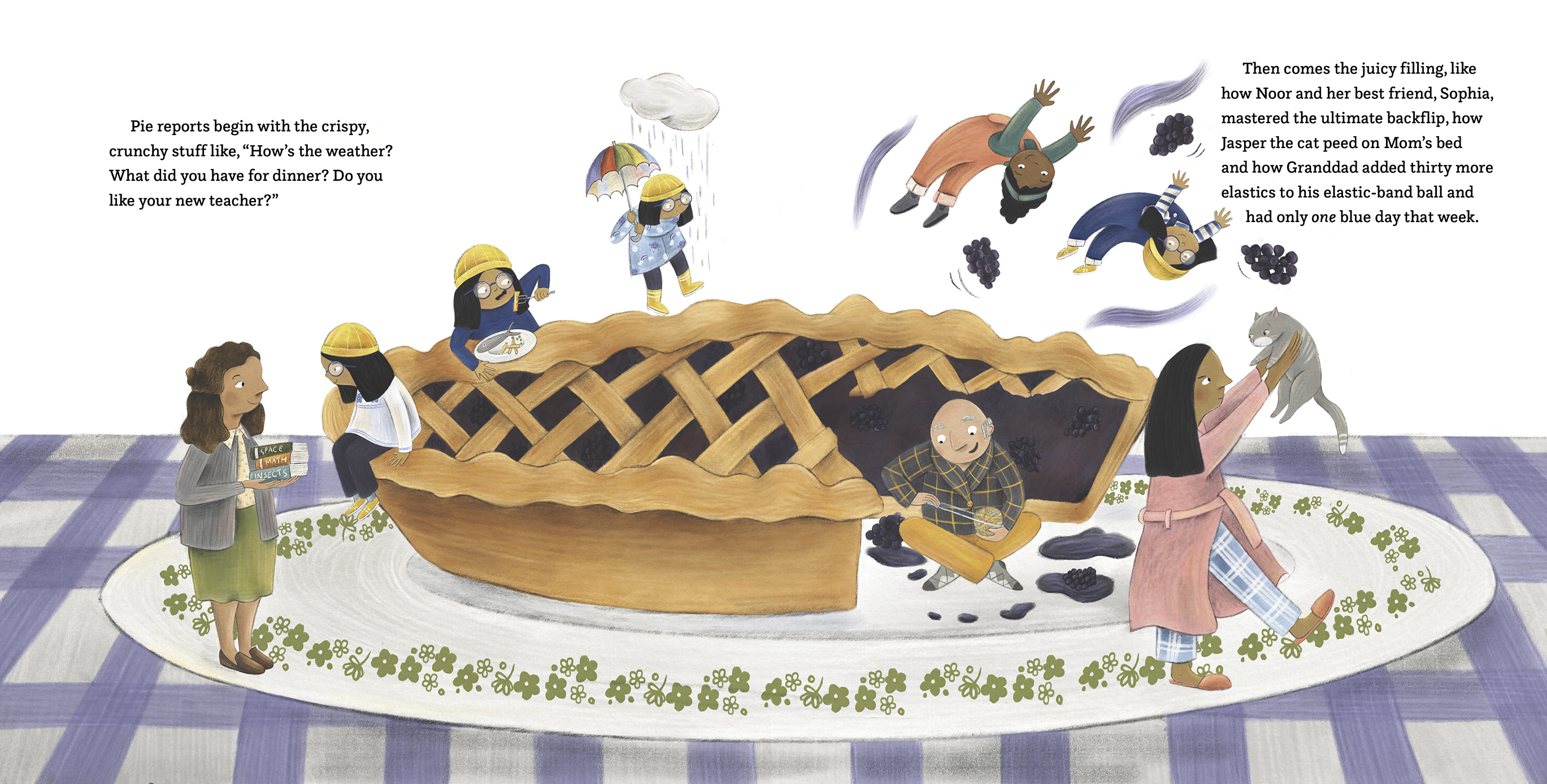 Noor and Granddad love pie. Lemon meringue, blueberry crisp, chocolate cream...they have a pie for every occasion and spend a wonderful summer together trying each one. When vacation ends, Noor must say goodbye and fly home. But despite an ocean of distance between them, and Granddad's declining health, the pair continue to connect through their shared passion for pastry by meeting for video chats. These weekly pie reports let them chat about what's new and, of course, discuss and eat pie!