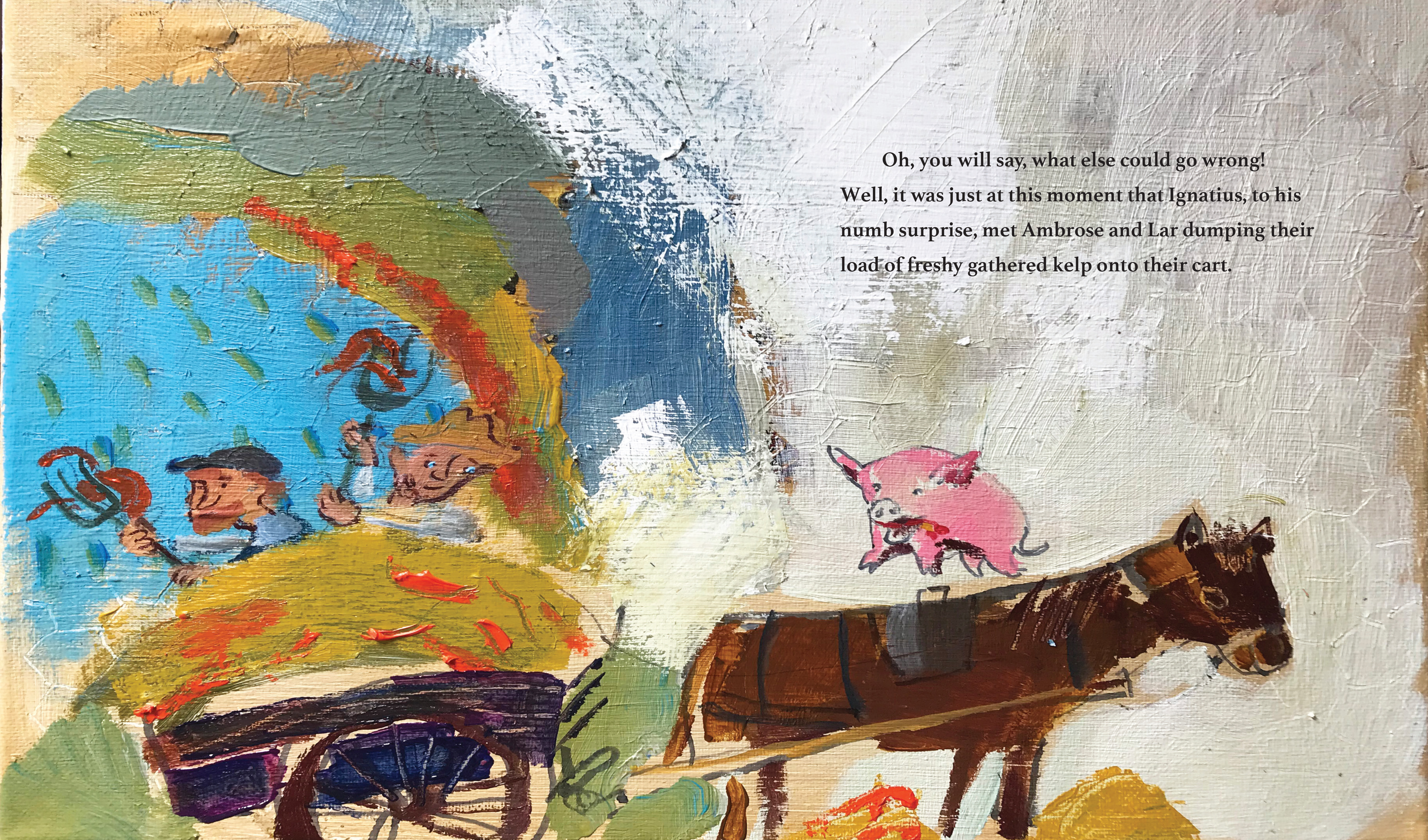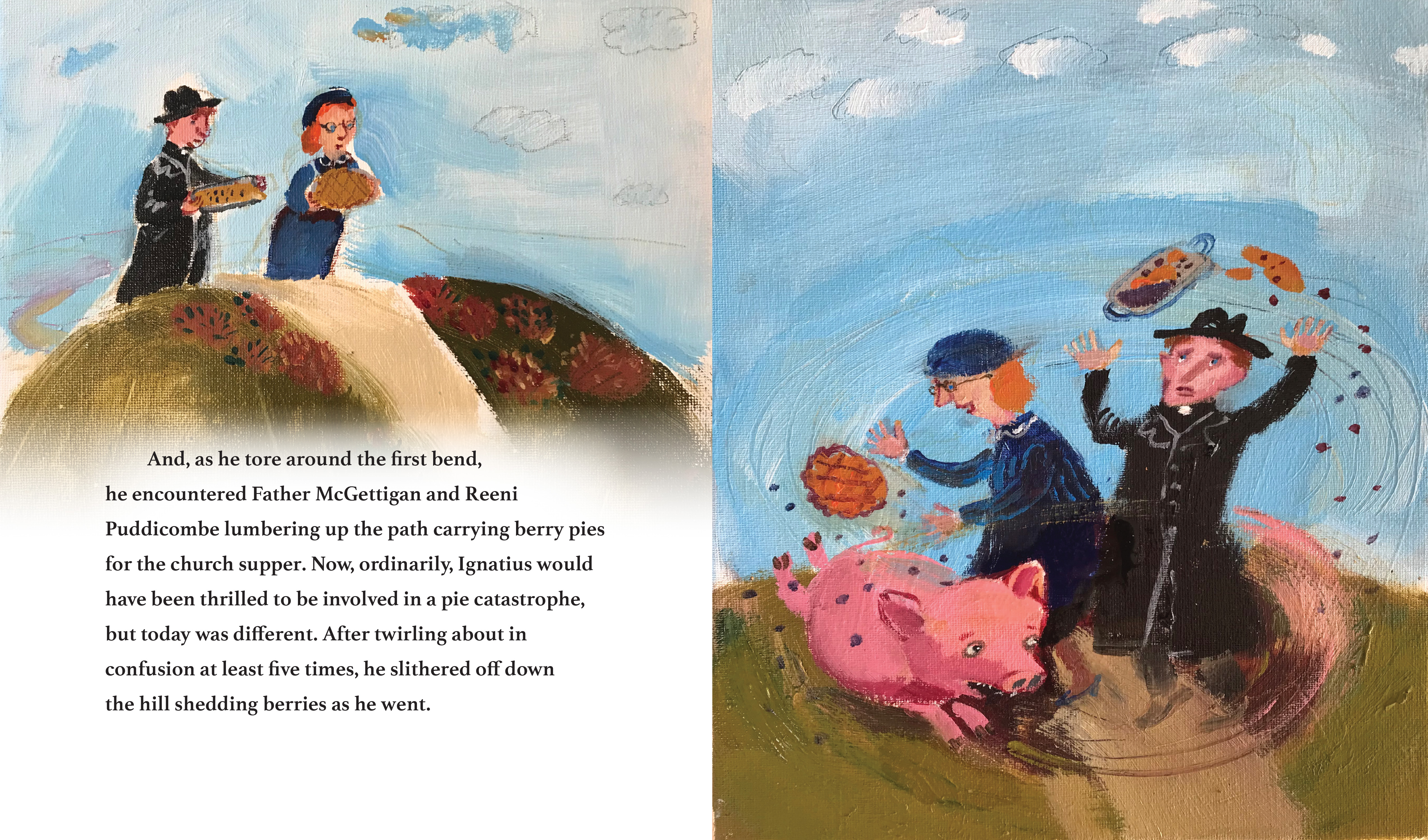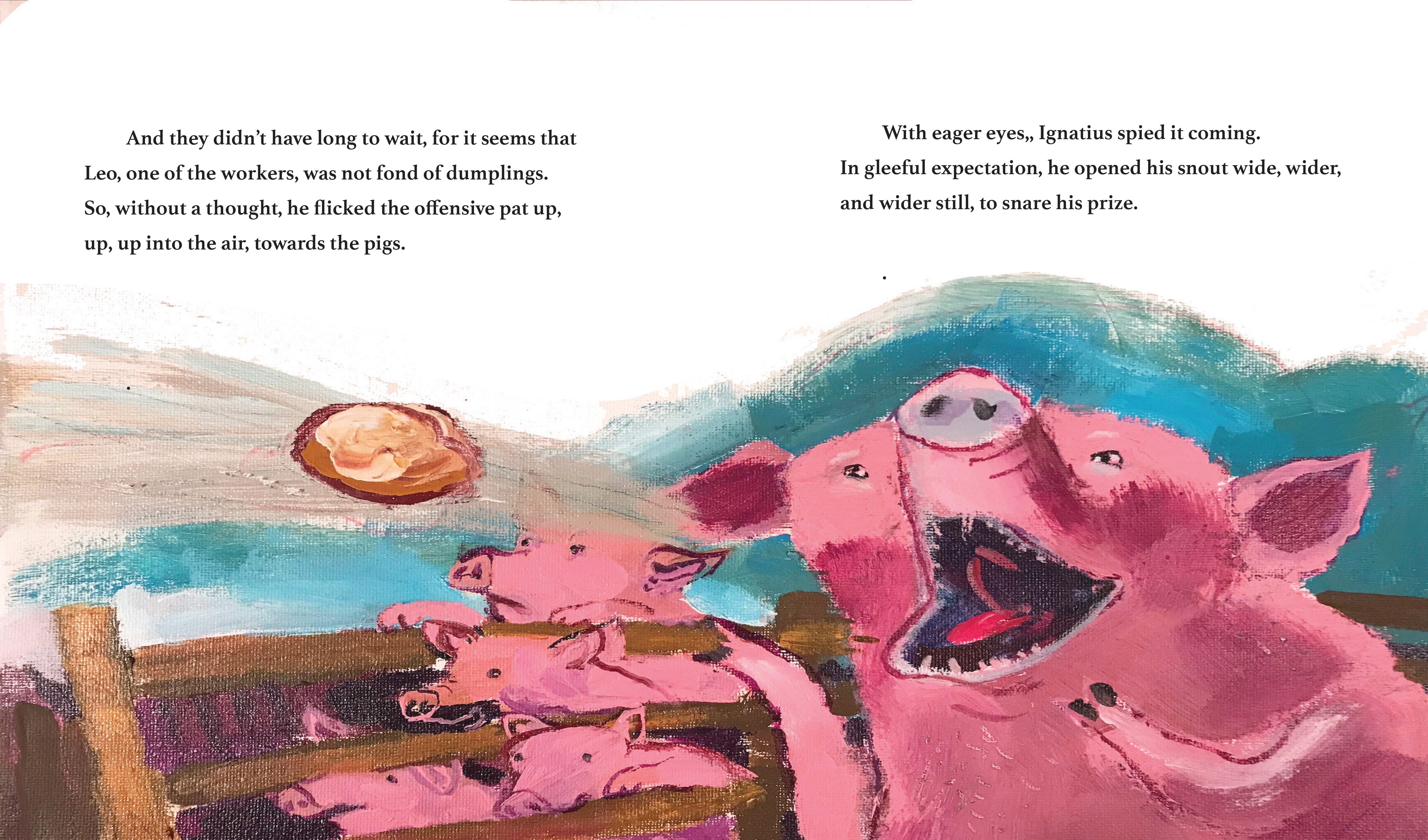 Ignatius is a pig with a big appetite and very little patience. When someone tosses a fresh dumpling his way, he grabs it in mid-air and swallows. That dumpling is big and it is hot, and very quickly it is stuck—right in Ignatius’s throat! Desperate for relief, the poor pig races through his little community to reach the cooling water of the ocean. And careening on his way to the sea, he has plenty of near misses, and a few collisions, with local village folk. How much trouble can one pig cause? A playful story with a “you-can’t-catch-me” spirit that celebrates small rural communities, simple living, and silly pigs.