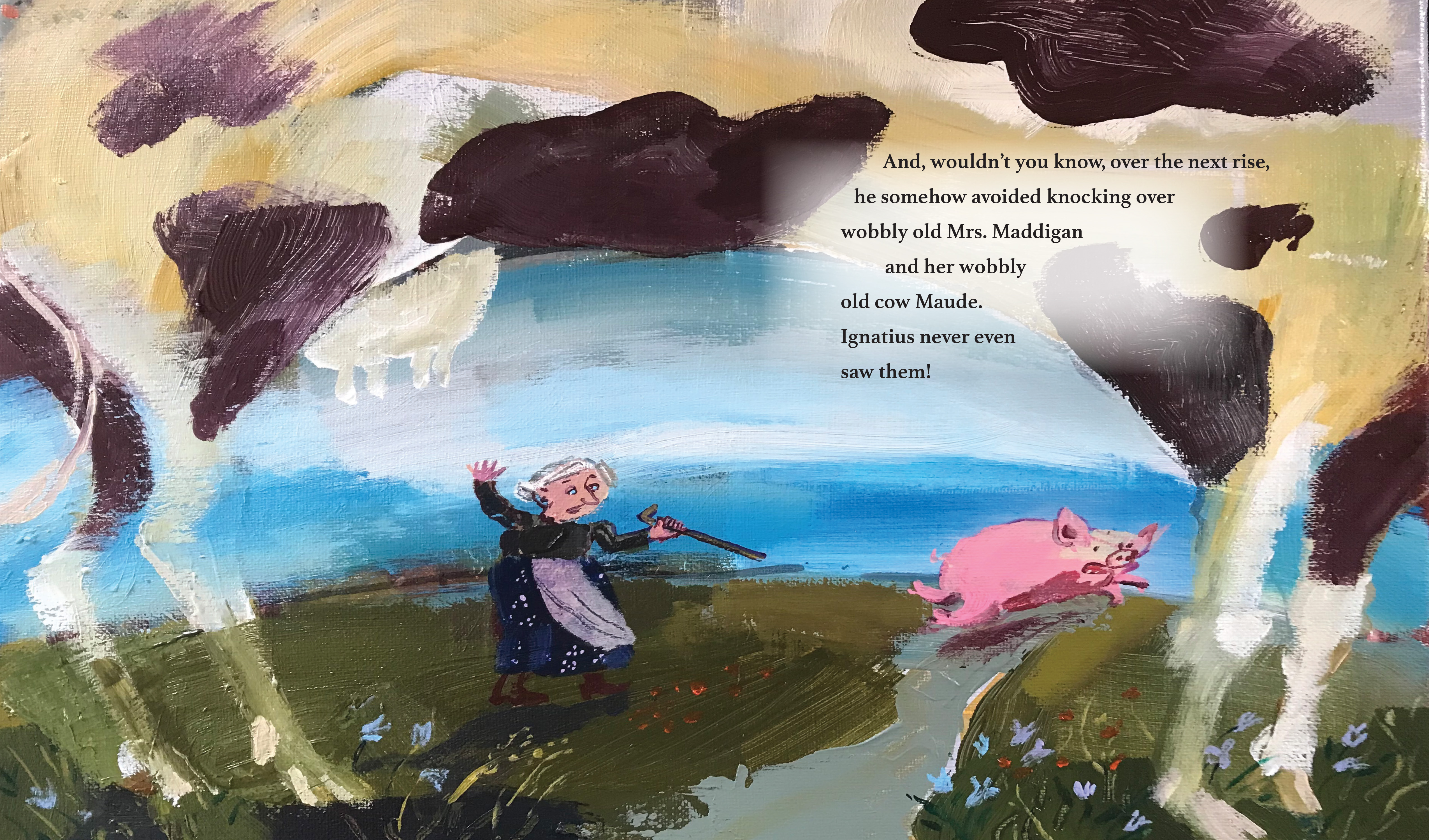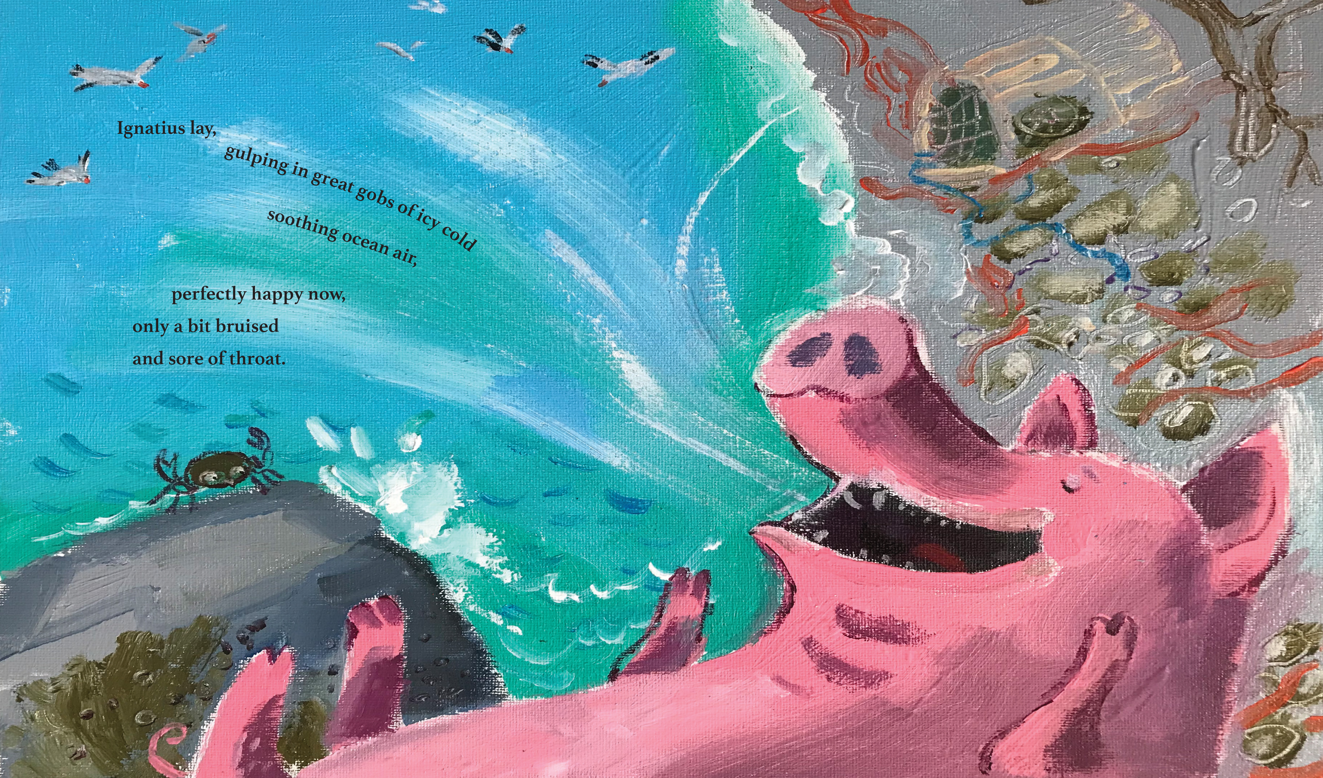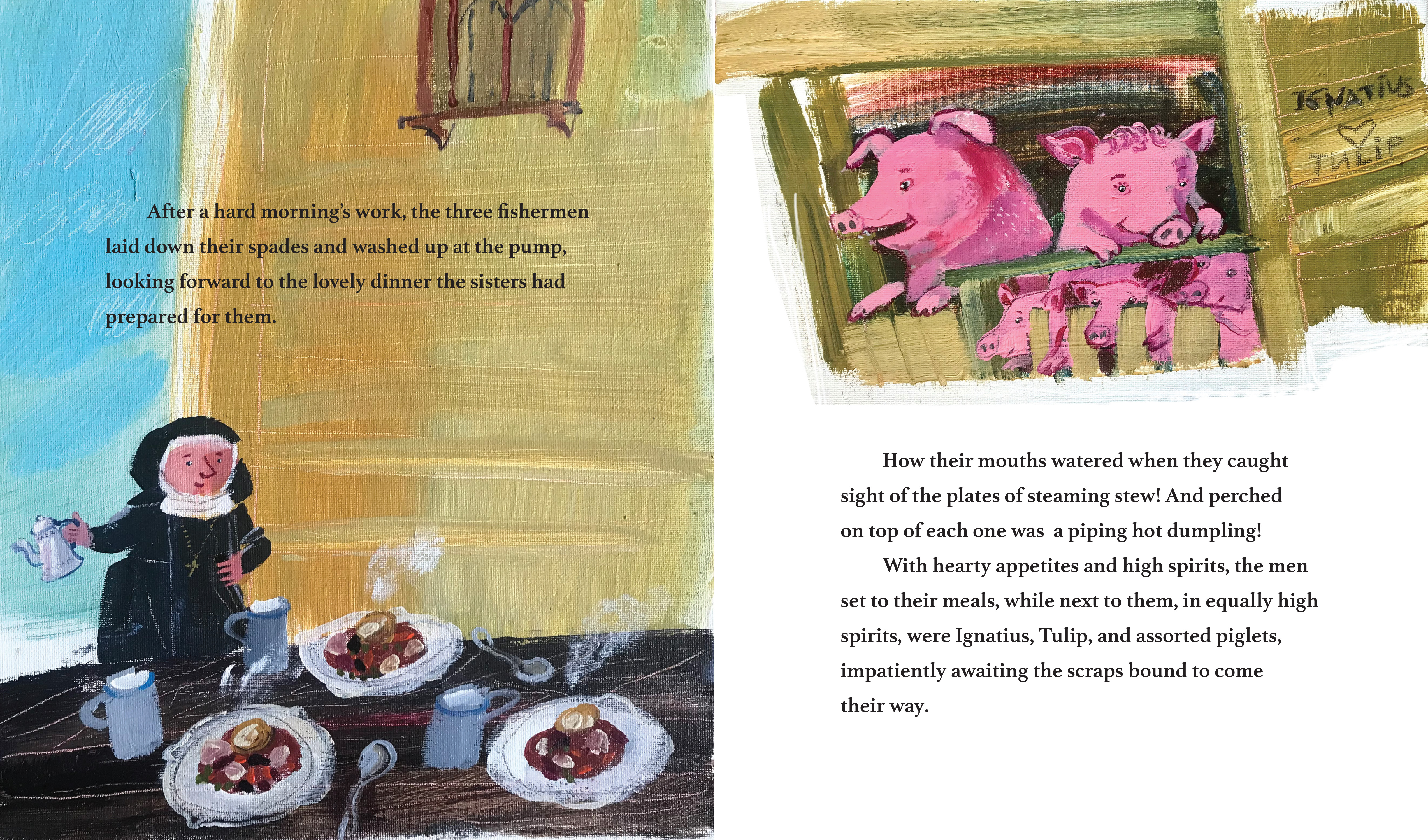 Ignatius is a pig with a big appetite and very little patience. When someone tosses a fresh dumpling his way, he grabs it in mid-air and swallows. That dumpling is big and it is hot, and very quickly it is stuck—right in Ignatius’s throat! Desperate for relief, the poor pig races through his little community to reach the cooling water of the ocean. And careening on his way to the sea, he has plenty of near misses, and a few collisions, with local village folk. How much trouble can one pig cause? A playful story with a “you-can’t-catch-me” spirit that celebrates small rural communities, simple living, and silly pigs.
