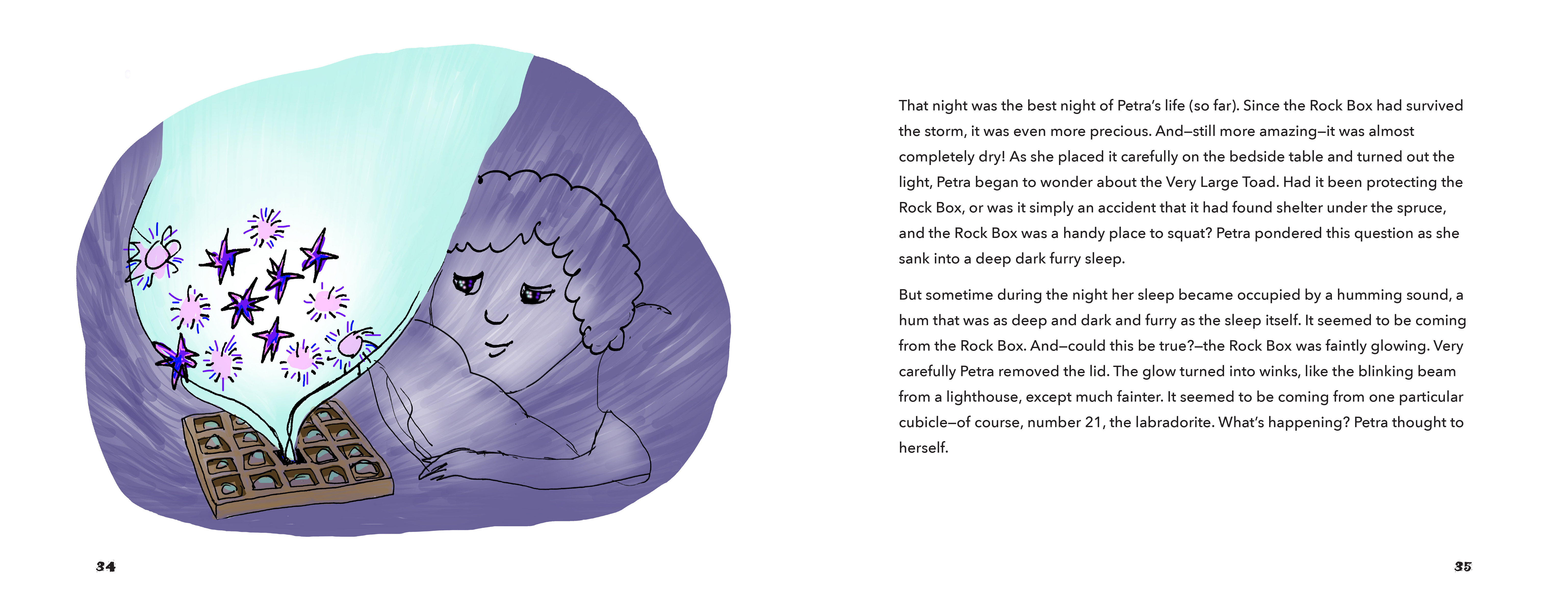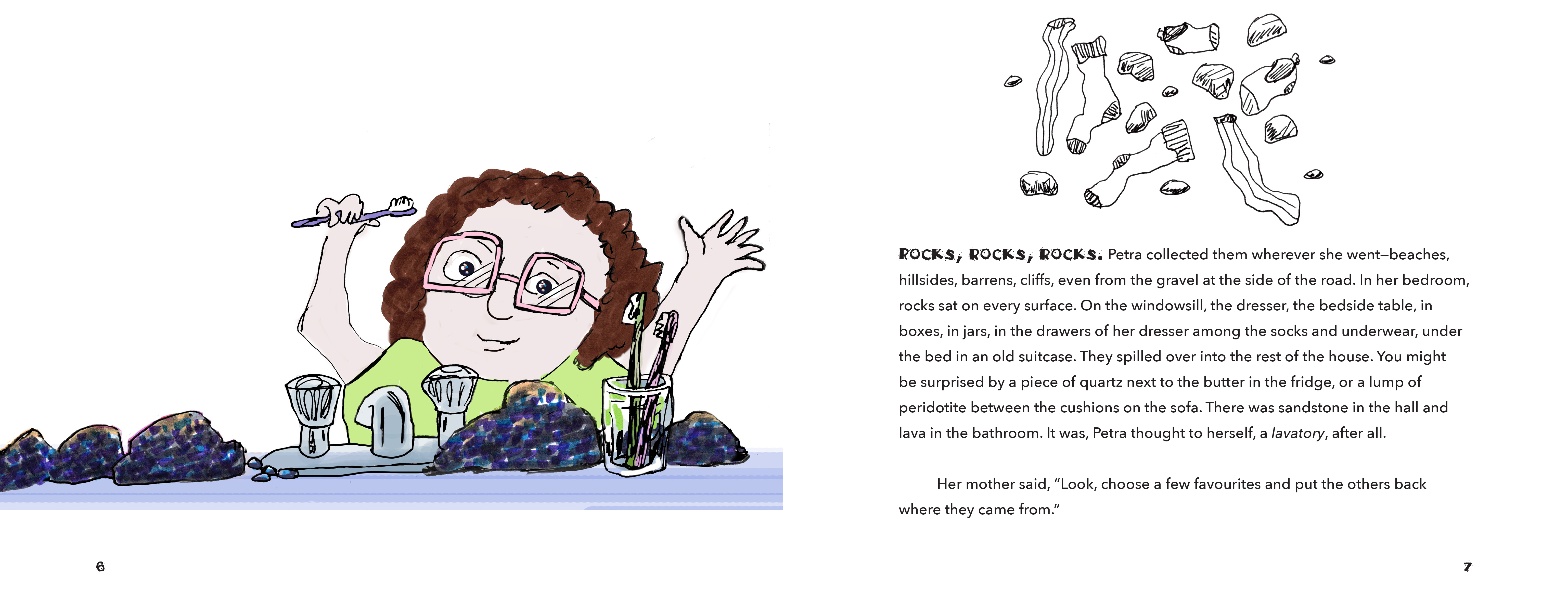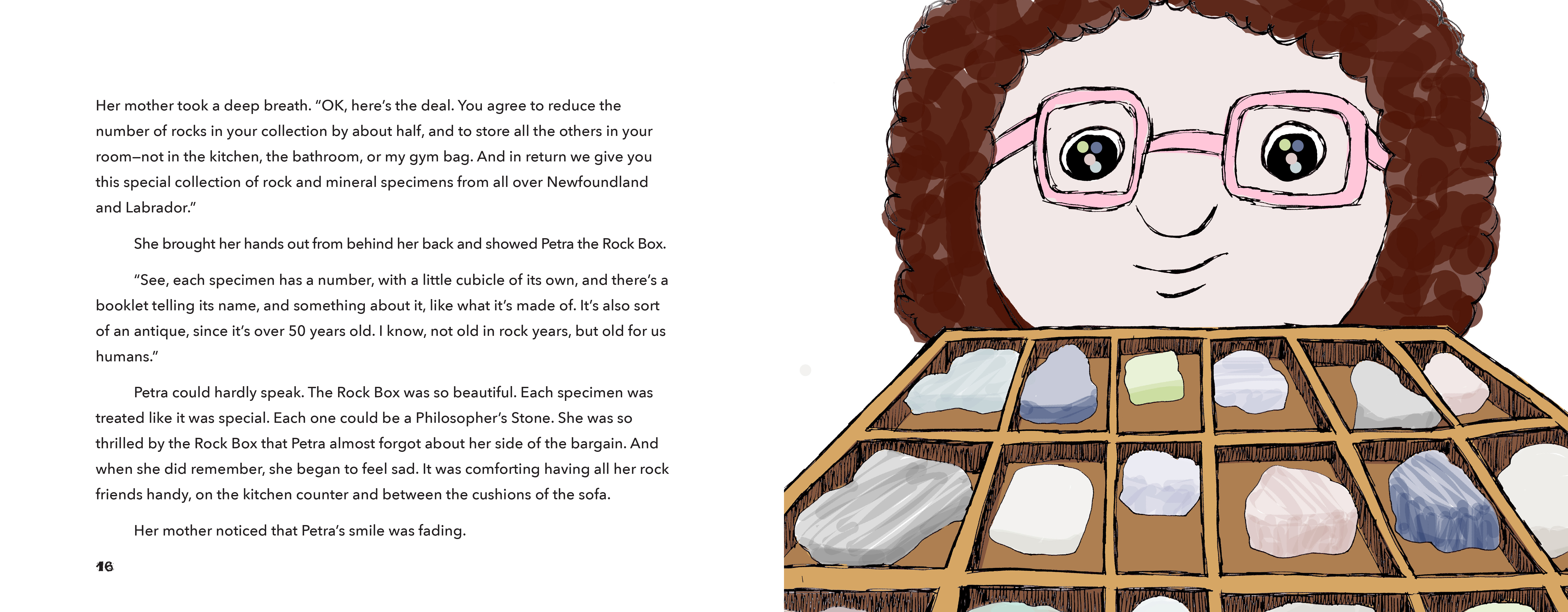 Petra loves rocks, and collects them with a passion. She keeps them in her bedroom, in the kitchen cupboards, between the cushions of the living-room sofa, even in the bathroom medicine cabinet. Petra’s parents do not love rocks. At least, not as much as Petra does. To convince her to winnow down her collection, her parents offer her a wonderful treasure—a rock box, with a selection of the rocks and minerals found in her home province of Newfoundland and Labrador. But, wait, is one of those rocks winking at her? Acclaimed Canadian poet Don McKay creates a charming tale of geology and deep time and connection in his first children’s book.