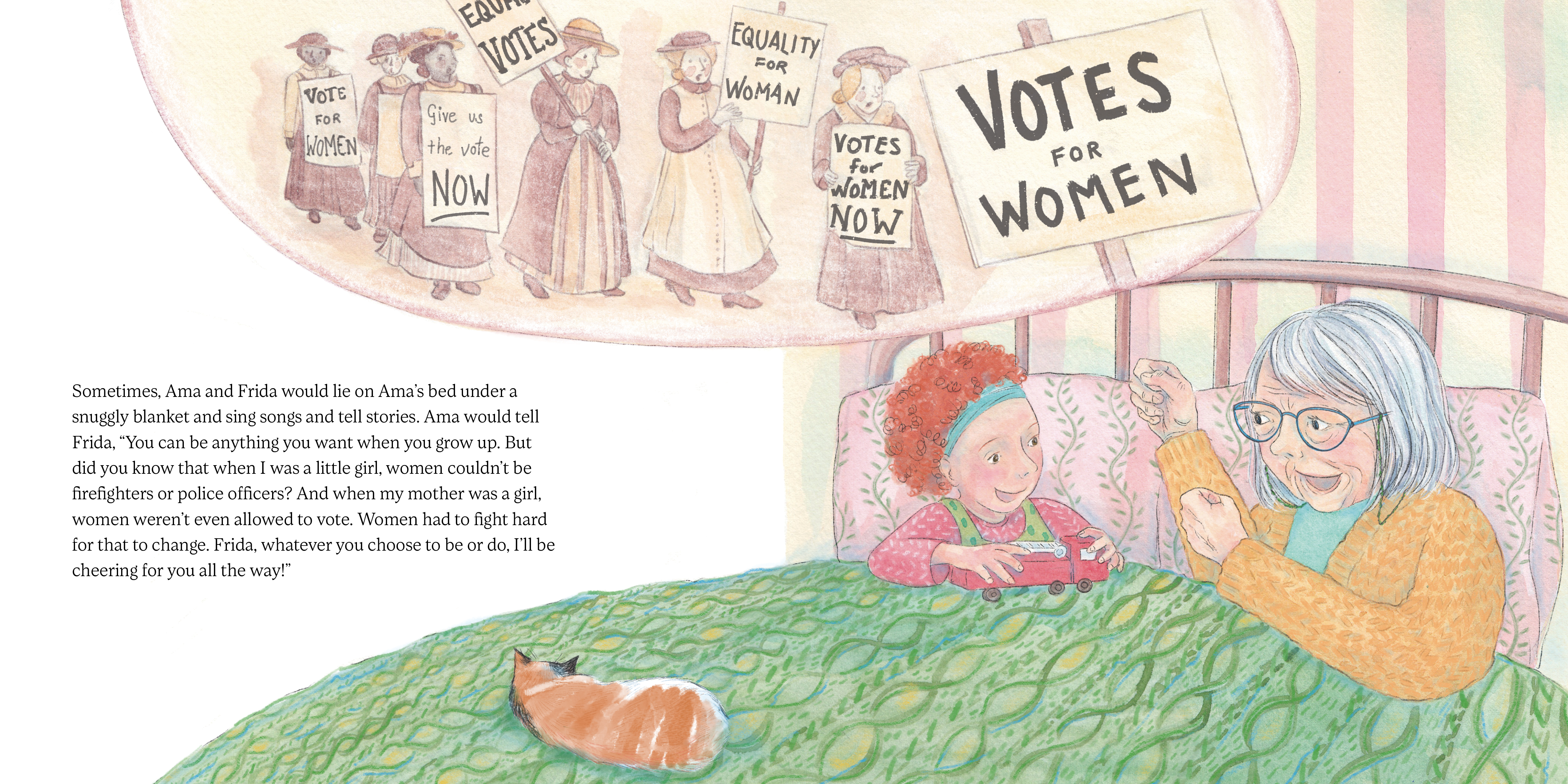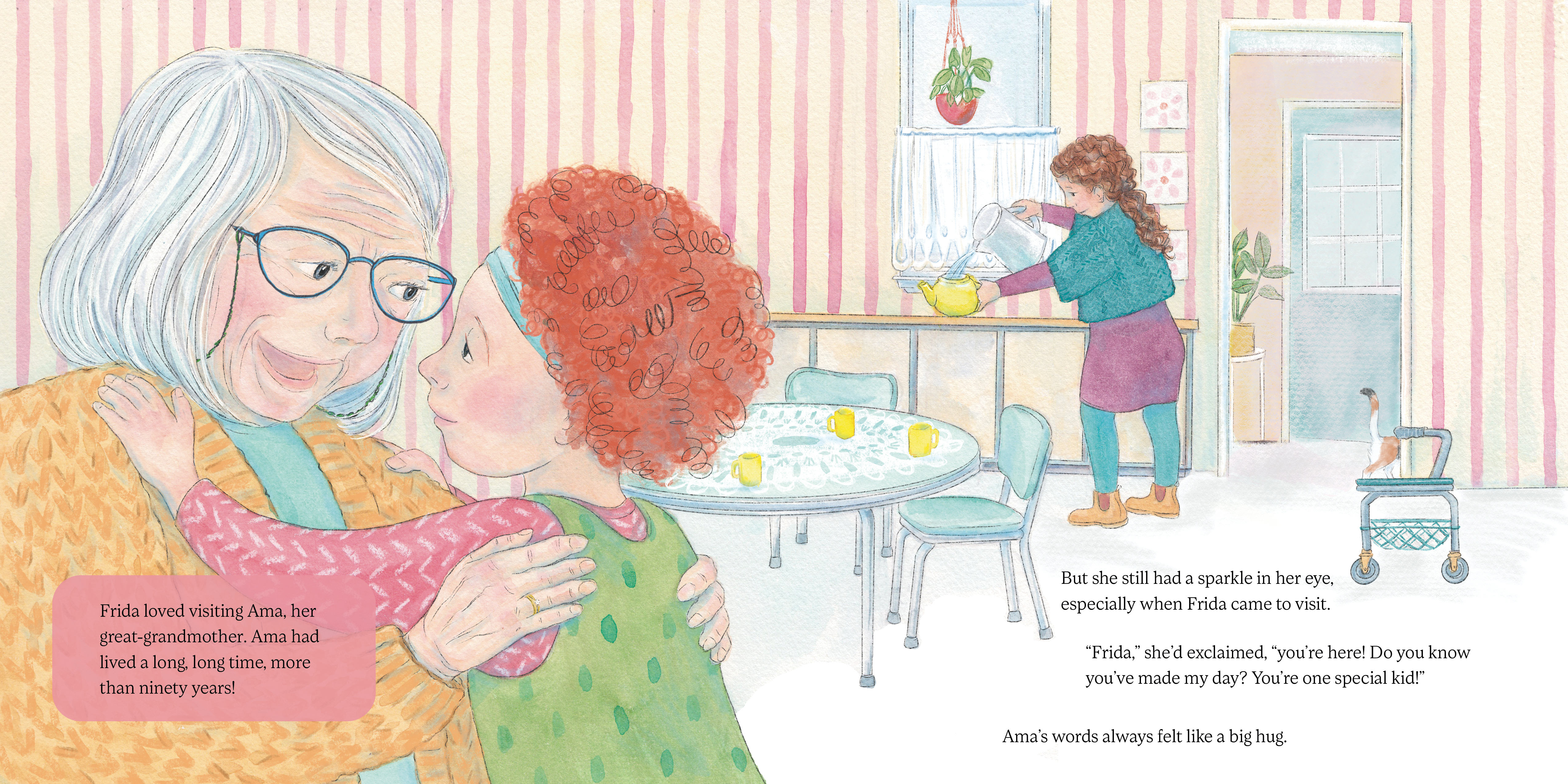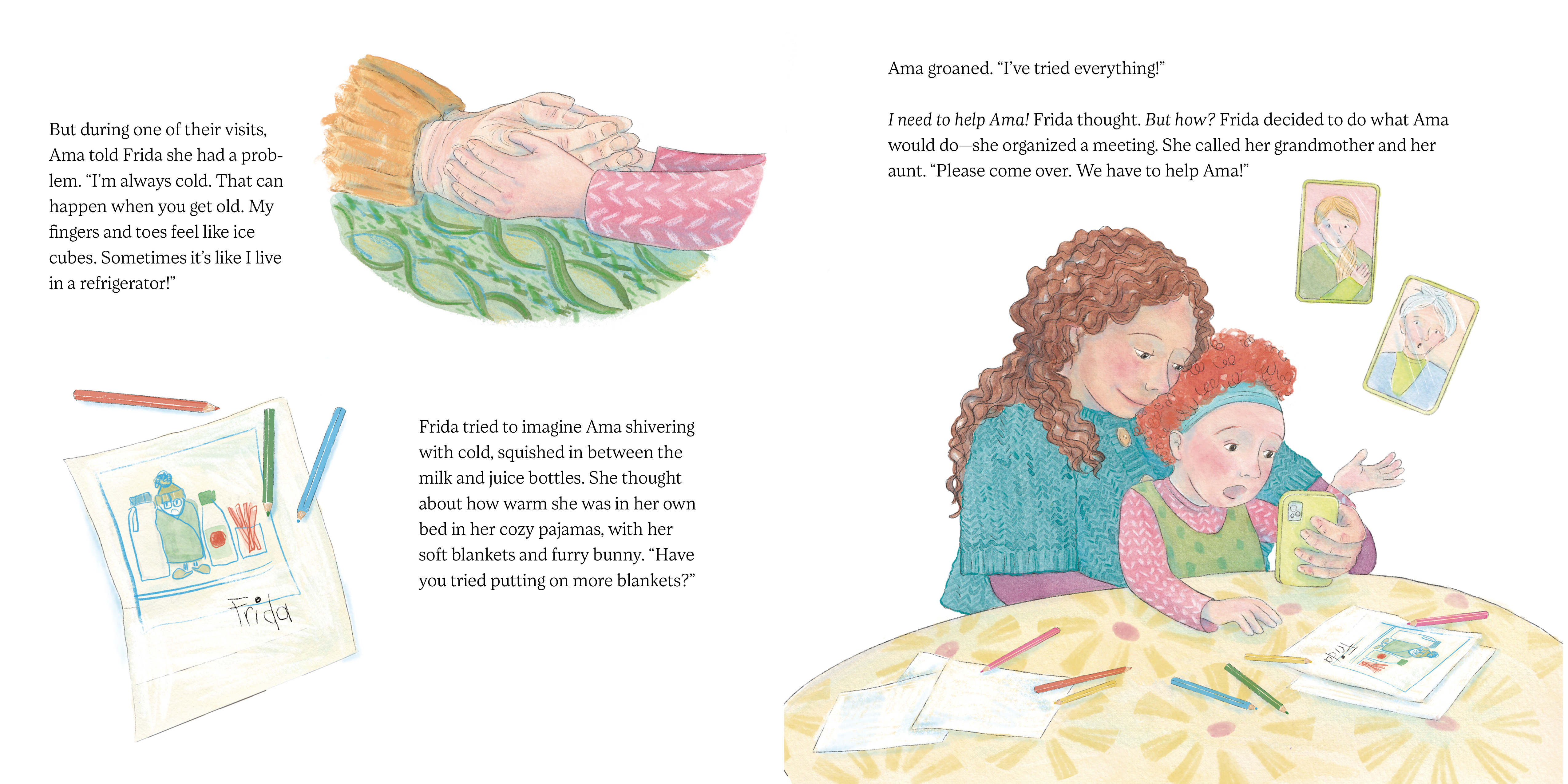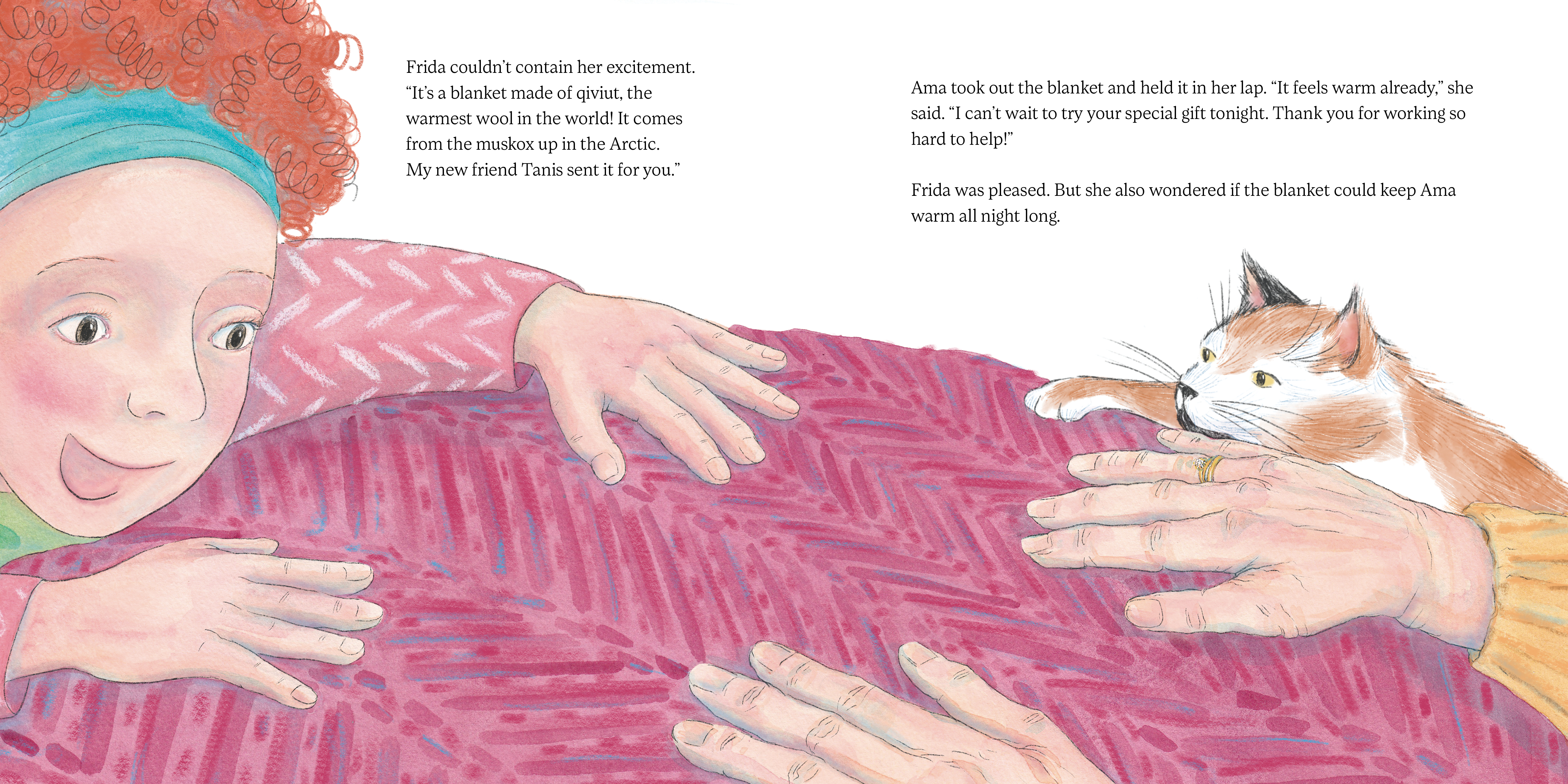 Frida loves spending time with her great-grandmother, Ama, and listening to her inspiring stories of activism. Ama believes in helping people, especially children and families. But Ama has one big problem. She is always cold. Her fingers feel like ice cubes, and sometimes, she feels like she lives inside a refrigerator. Frida has to do something to help, just like Ama taught her. With the help of a kind person named Tanis, and a special kind of wool called qiviut, Frida finds the perfect way to keep Ama warm!
