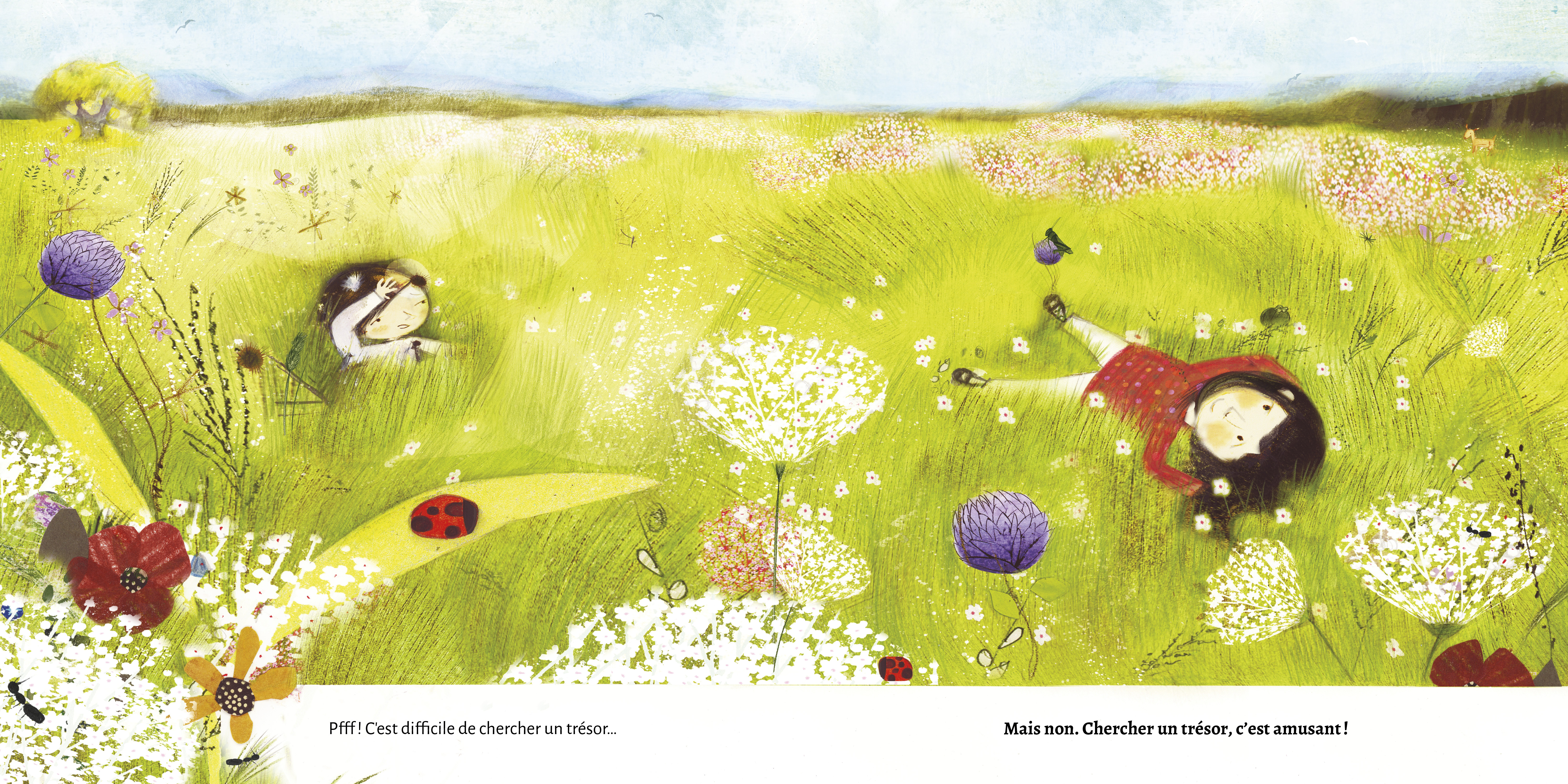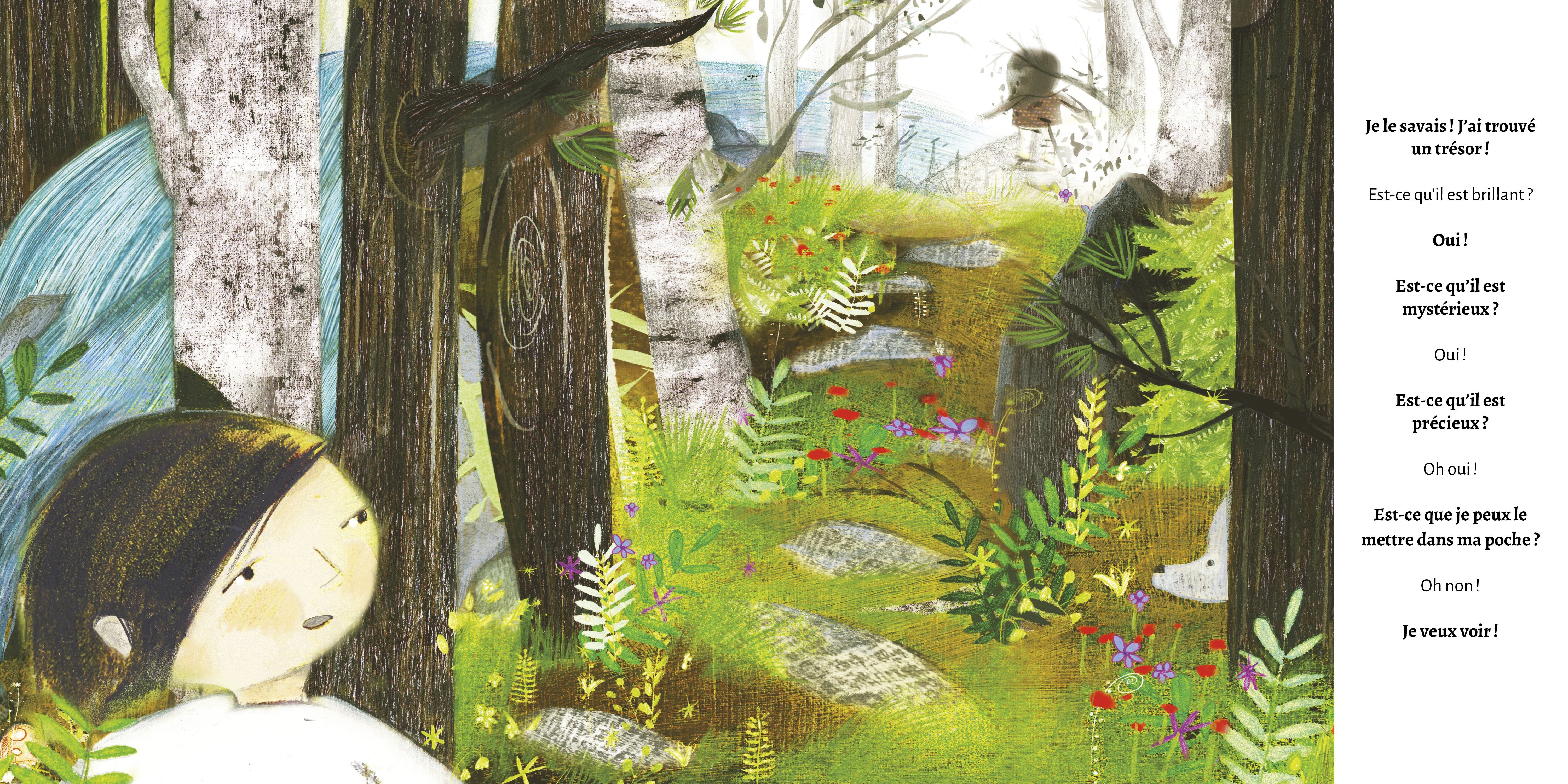 Alors qu'ils explorent la forêt, le petit frère trouve des objets qui pourraient être des trésors : une plume d'oiseau, une noisette et une gousse d'asclépiade. Mais la sœur n'est pas facilement impressionnée. Après un moment, le frère commence à douter des ambitions de sa sœur, mais leur curiosité est récompensée quand ils découvrent le plus grand, le plus brillant, le plus mystérieux et le plus précieux des trésors, caché au sommet d'une colline.Raconté exclusivement par l'entremise d'un dialogue, ce récit encourage les lecteurs à rechercher les petits trésors quotidiens qui nous entourent. Superbement illustré, Trésor exhale un sentiment d’émerveillement devant la nature et souligne les qualités magiques qu'il y a à regarder à travers les yeux d'un enfant.Ègalement disponible en anglais sous le titre Treasure.Ce livre audio adapté comprend des descriptions textuelles des images, y compris de la page de couverture.