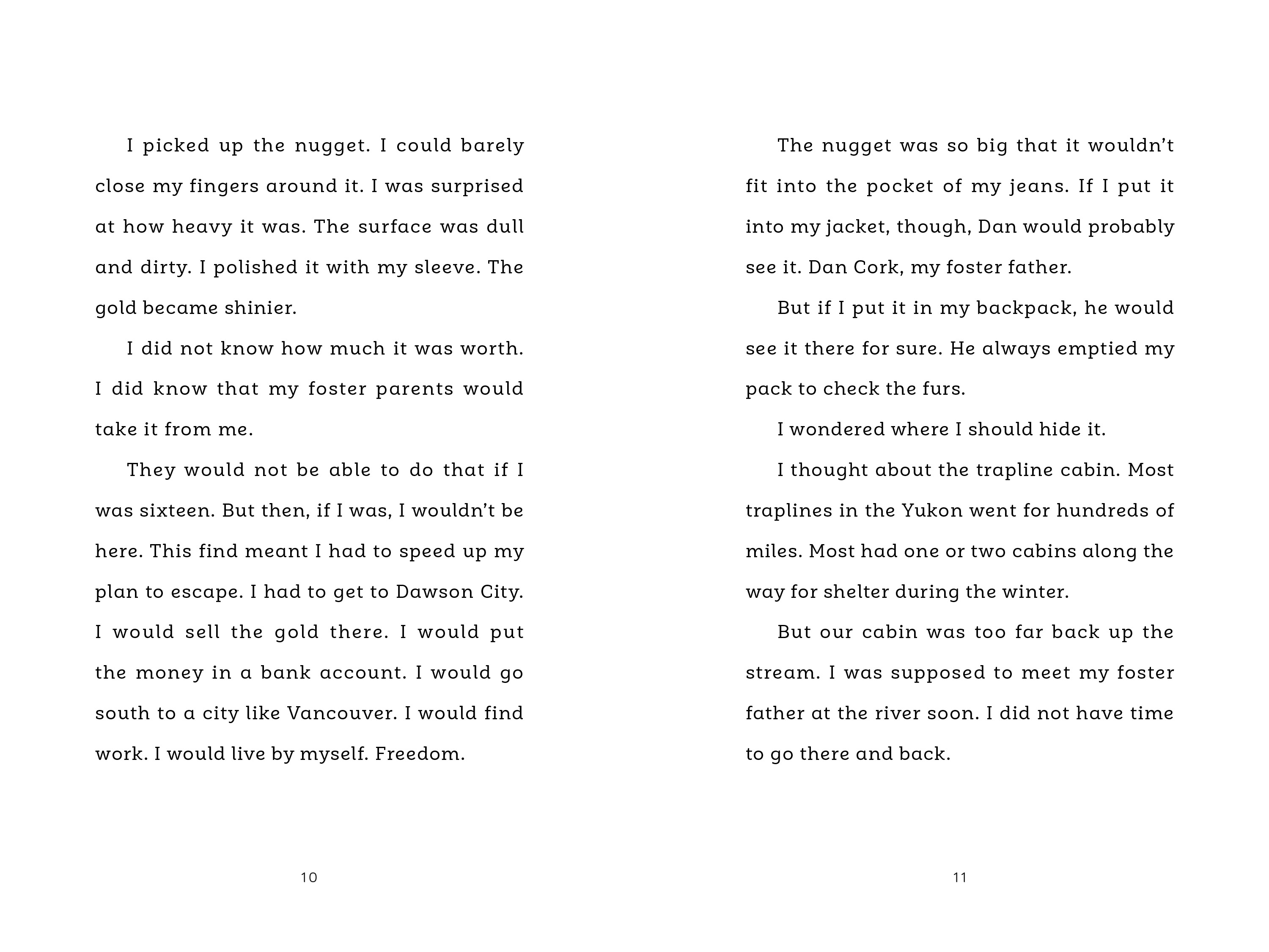 He's been living with his foster parents in Yukon River valley in their isolated cabin. His plan is to leave and never come back. He is done with the harsh lifestyle and helping his abusive foster dad, Dan, run the traplines so he can make money selling animal furs. He can't wait to start a new life on his own in the city. But when Matt discovers a big and valuable gold nugget, everything changes. What seems like a dream come true and an easy way out quickly turns into a nightmare that will test Matt's wilderness survival skills to the fullest.