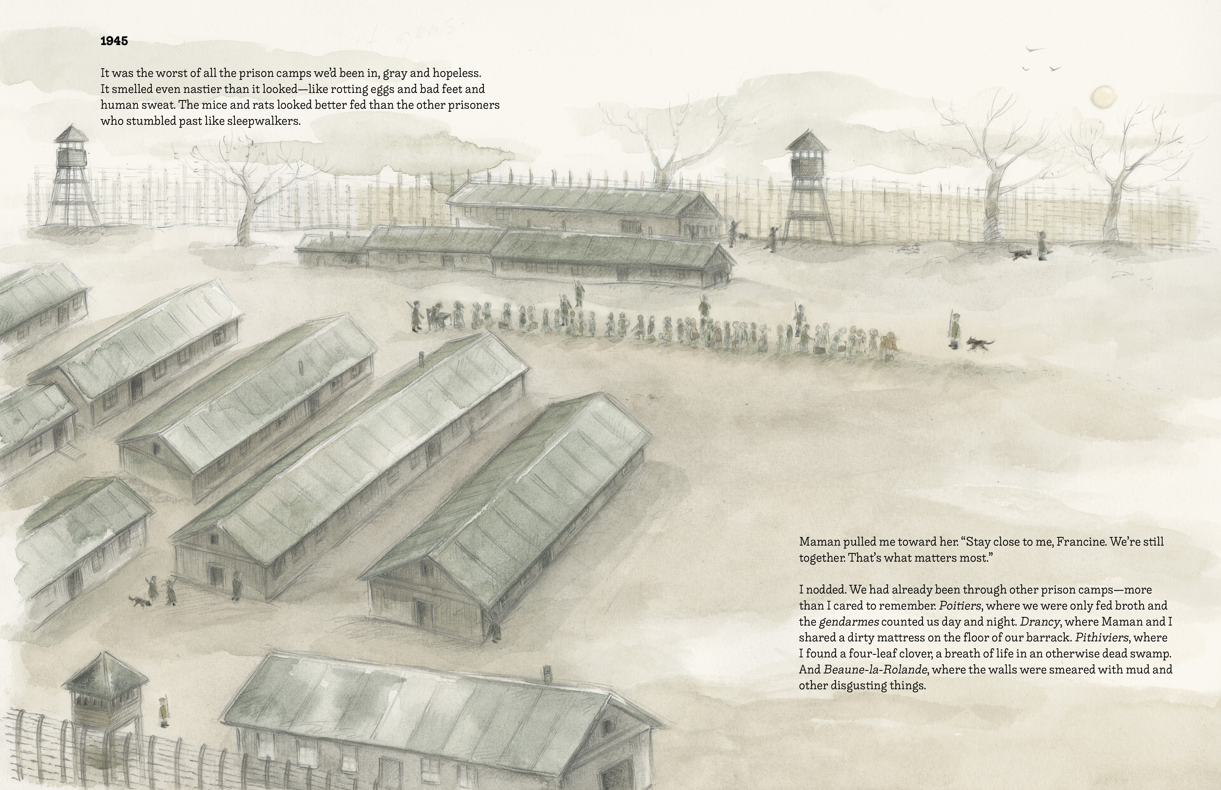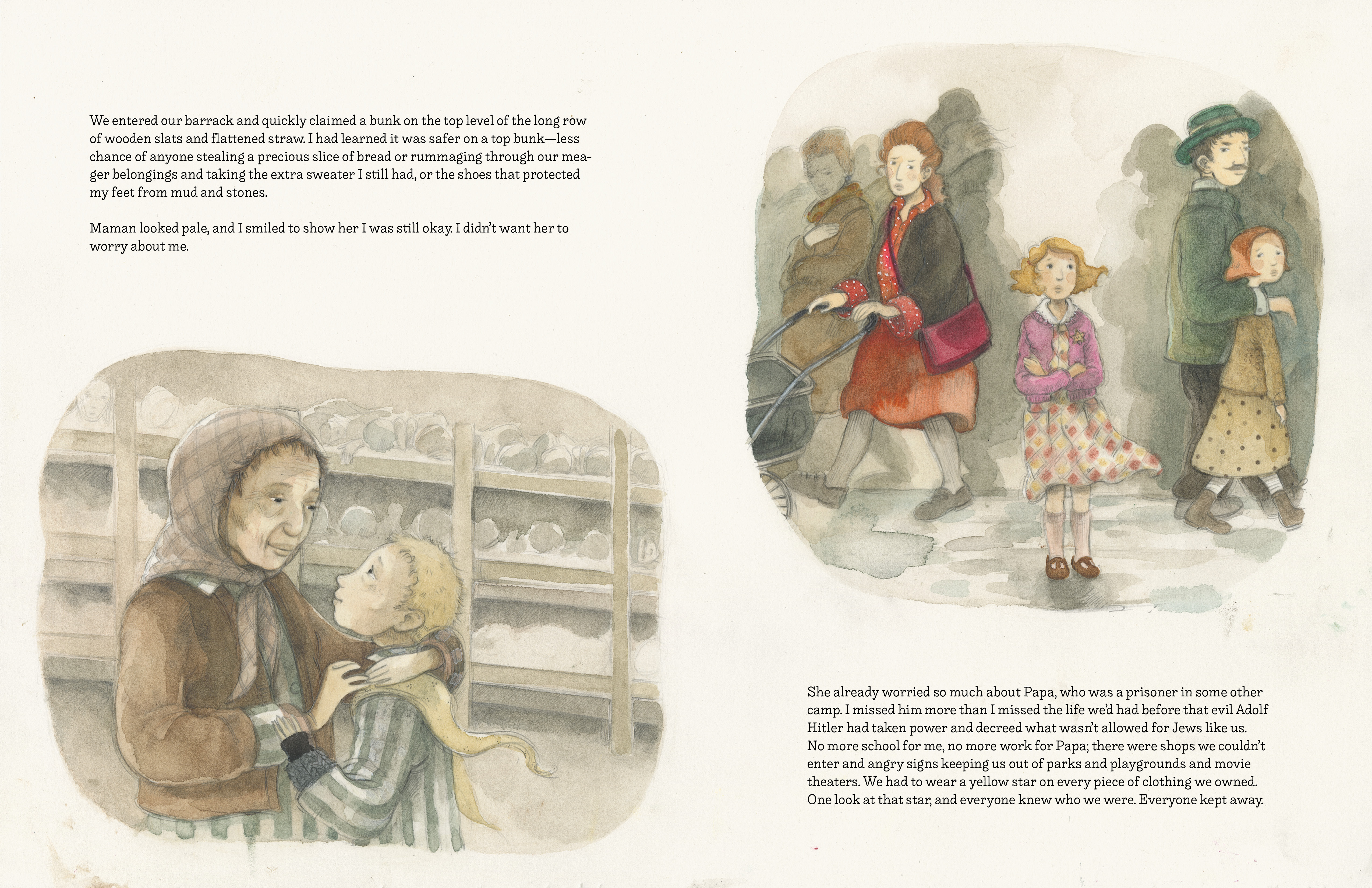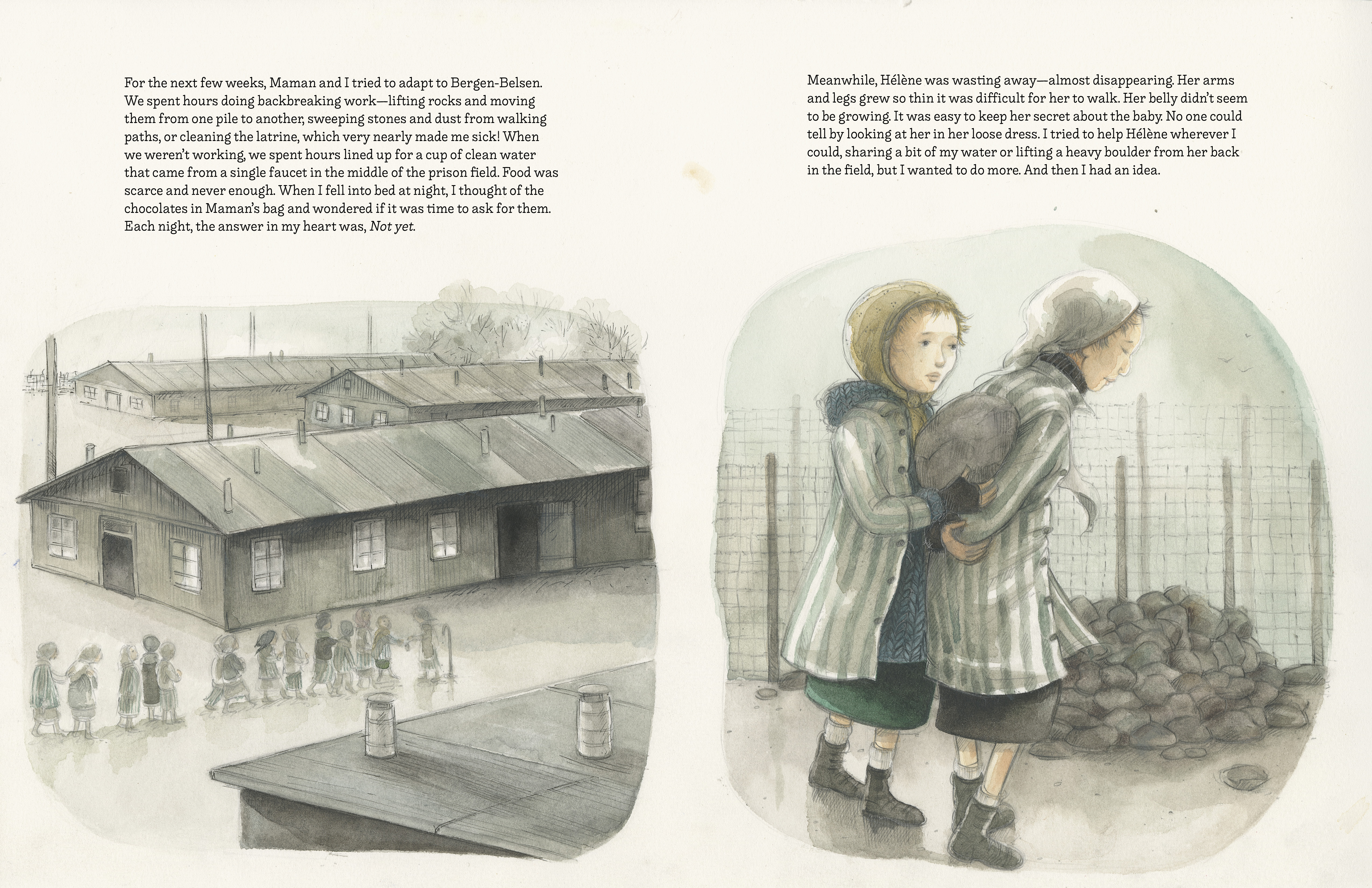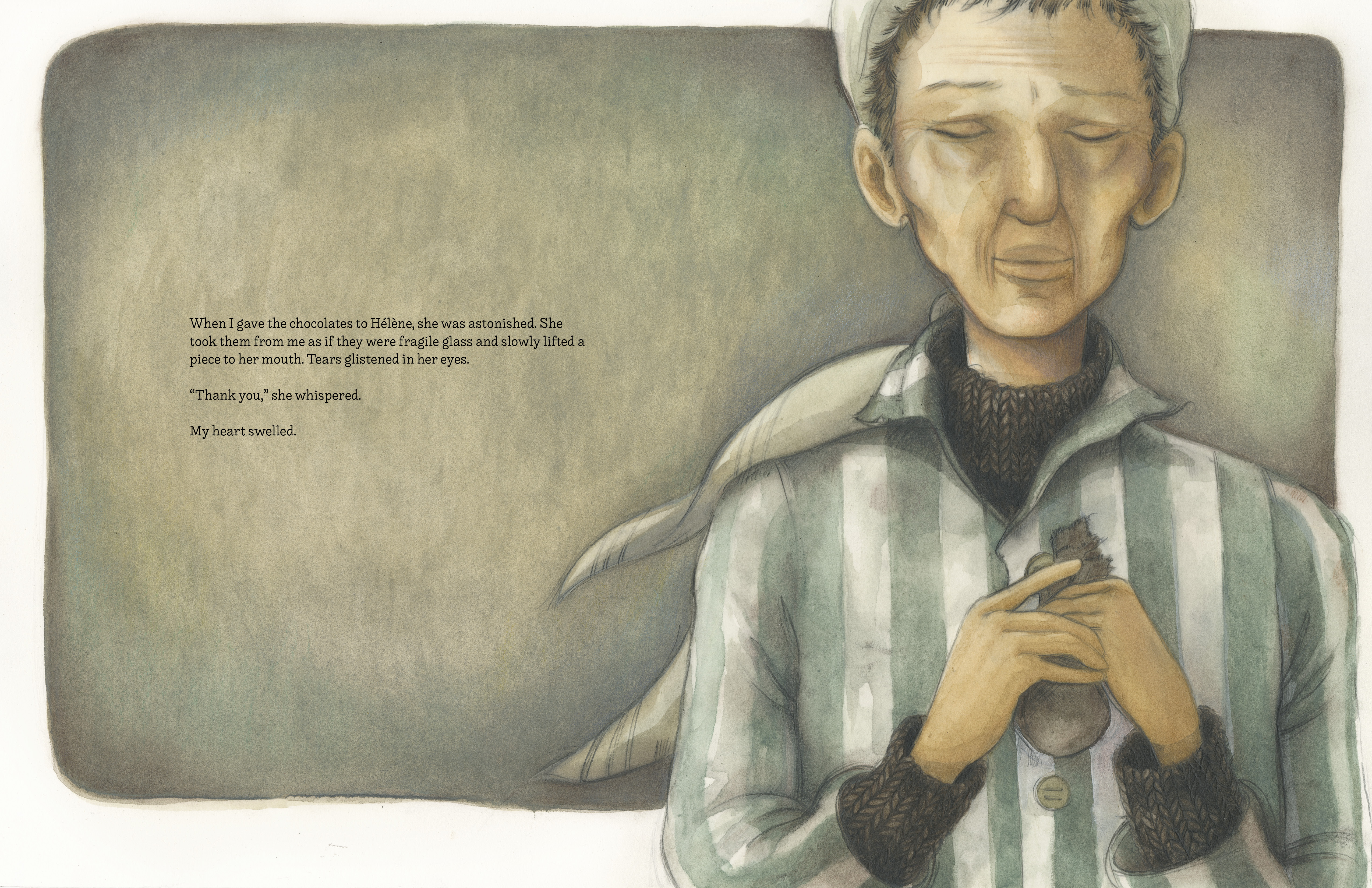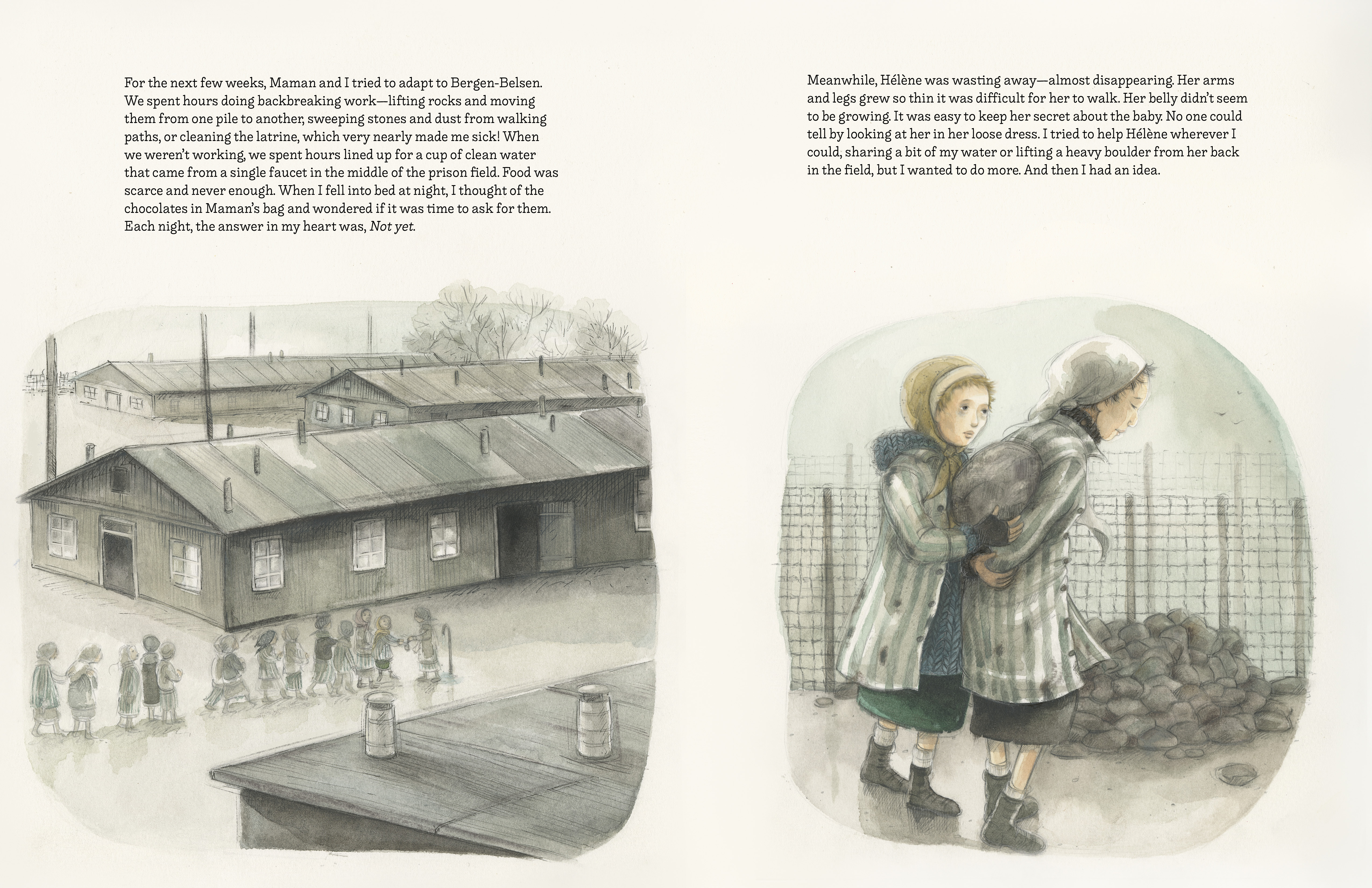 In 1945, young Francine and her maman are sent to the Bergen-Belsen Nazi prison camp, where life is gray and hopeless. Determined to lift Francine’s spirits, Maman shares a secret: hidden inside her bag are two pieces of chocolate. They’re the first sweets Francine has seen in years, but Maman tells her not to eat them. “One day, when I see that you really need them…that’s when I’ll give the chocolates to you.”