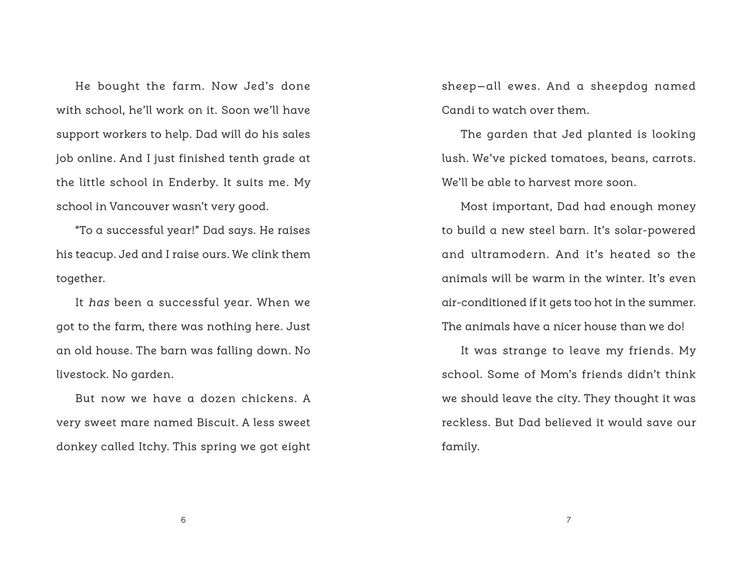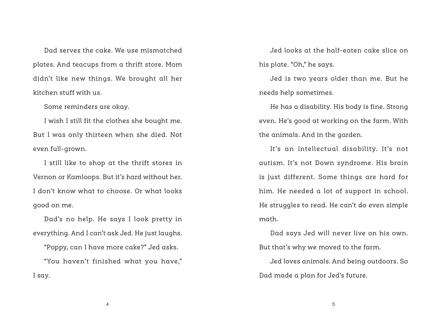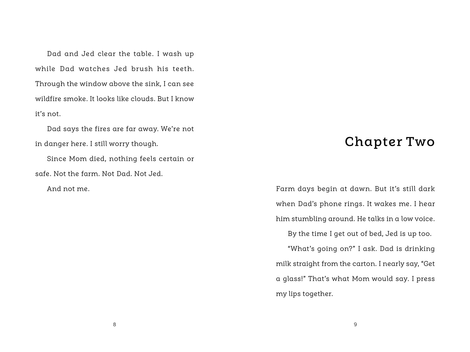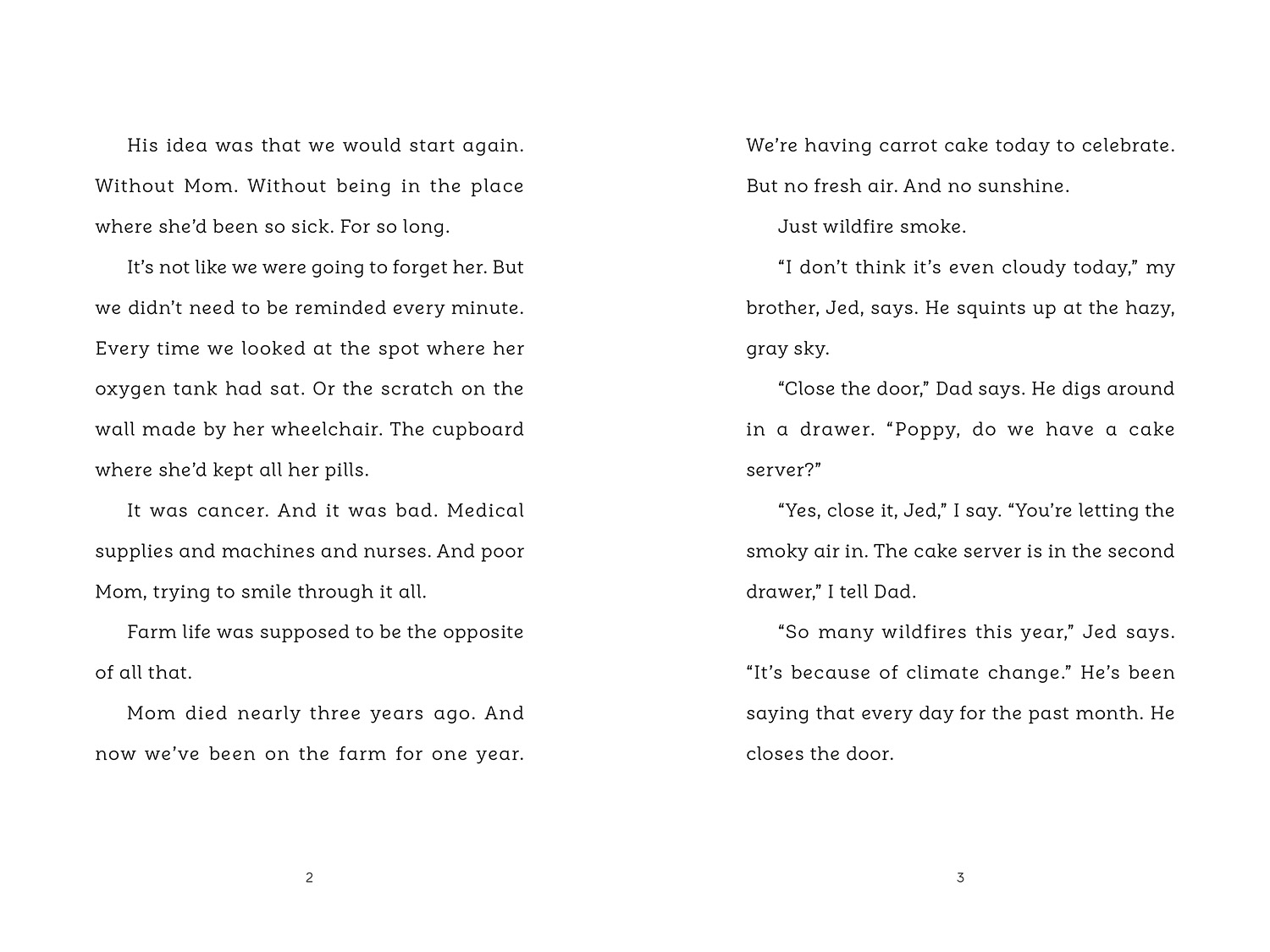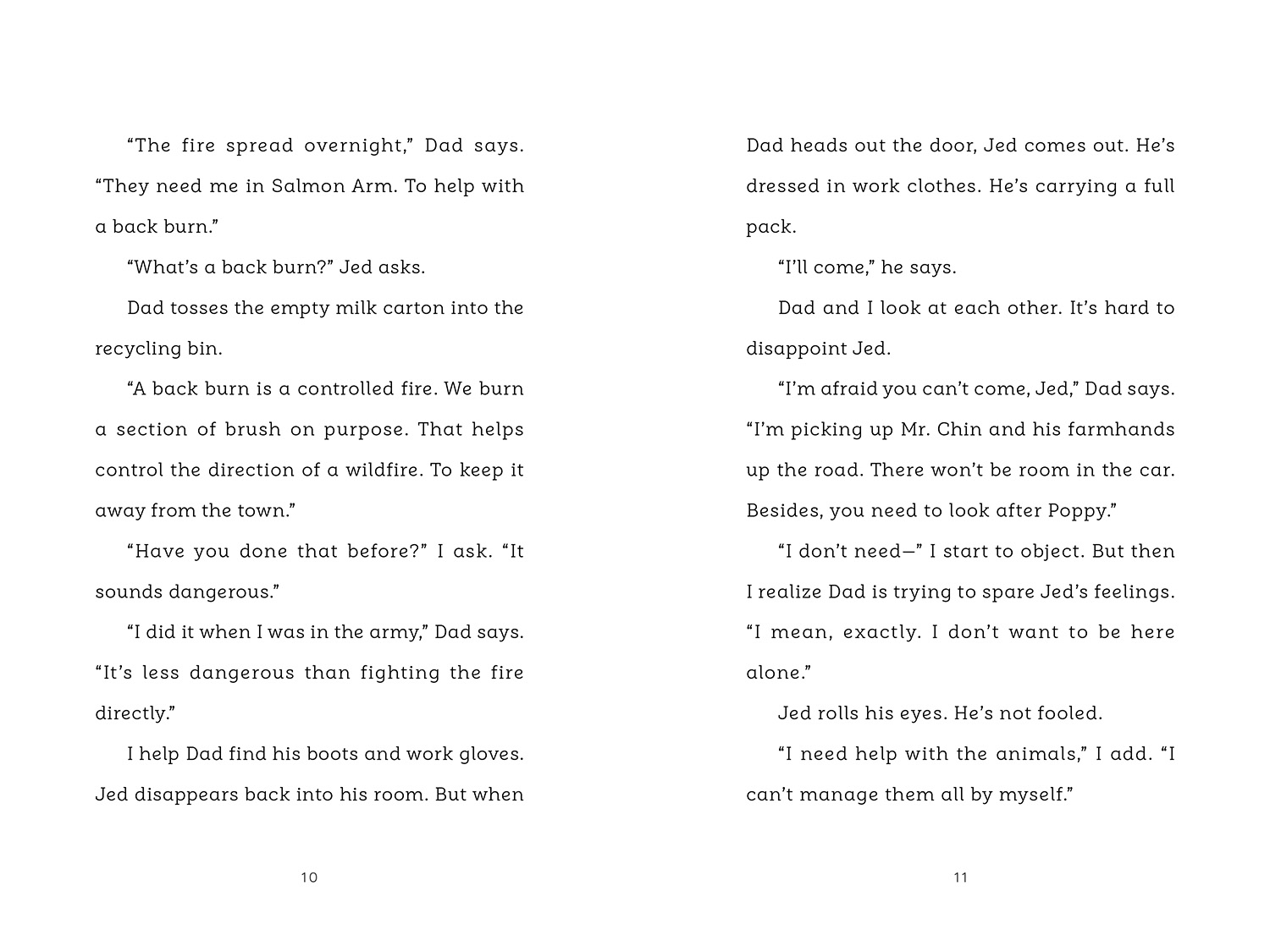 So when Poppy's widowed dad leaves her and her brother while he helps fight a distant wildfire, she’s confident she can manage. Her brother Jed has a disability and sometimes needs support, but there’s plenty to keep them both busy around the house and the farm. They’ll be fine. Then the wind changes and the wildfire heads straight for the farm. With no word from their dad, Poppy and Jed know they should get to safety, but what will they do with the farm animals? As the air fills with smoke and flames flicker on the horizon, Poppy and Jed must gather their unlucky collection of animals and make a desperate escape.