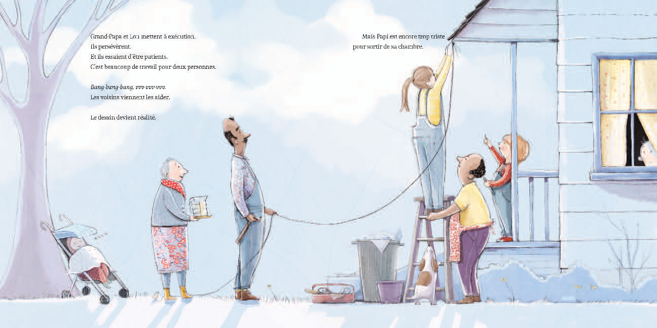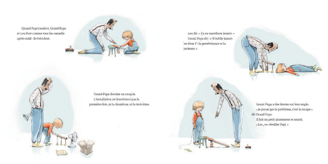 Lou passe tous ses samedis avec Grand-Papa et Papi. Ils se rendent à la bibliothèque main dans la main, comme une guirlande de personnages en papier. Grand-Papa lit des livres sur la science et le design, Papi écoute des disques de rock and roll et Lou va de l’un à l’autre. Mais un jour, tout bascule. Papi fait une chute qui a des conséquences terribles: il sera confiné à un fauteuil roulant pour toujours, tout le temps. Incapable d’accepter son état, il se renferme et ne sort plus de sa chambre. En entendant Grand-Papa essayer d’égayer Papi, Lou a une idée. En utilisant des compétences qu’il a apprises de Grand-Papa et avec un peu d’aide des voisins, Lou élabore un plan pour Papi.
