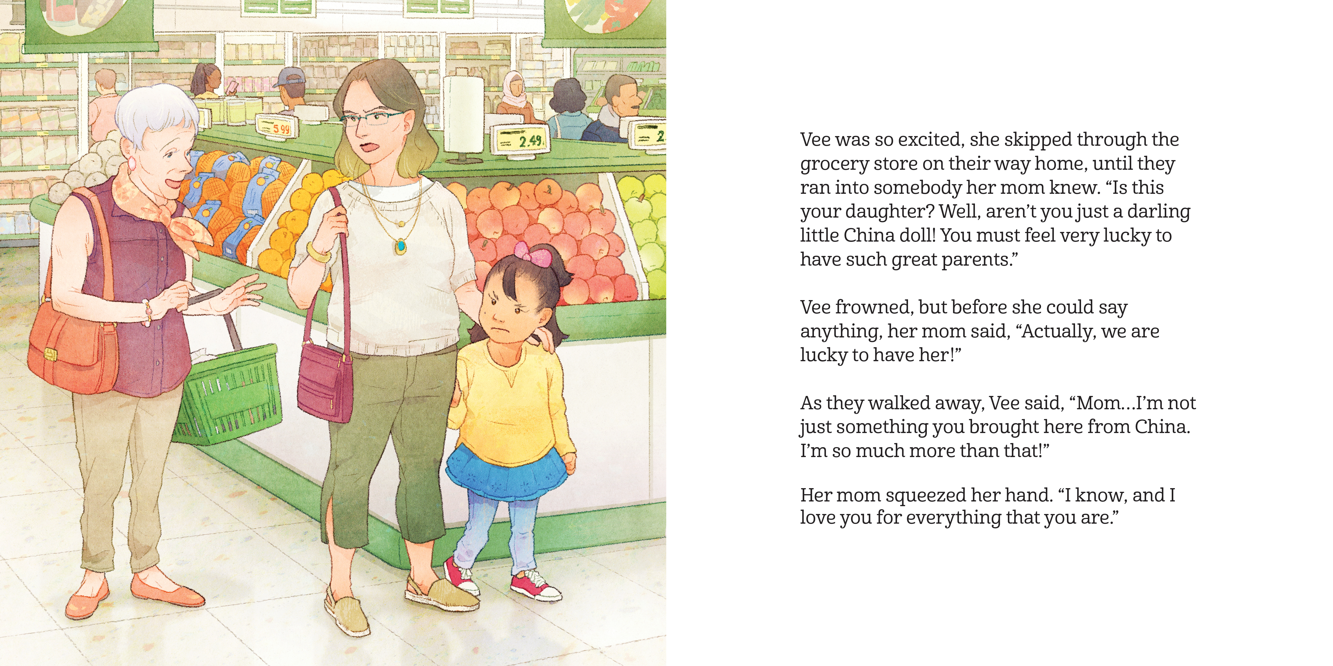 Vee’s favorite bedtime story is the night she met her parents. When Vee was nine months old, they flew to China to bring her home. But when she struggles to keep up in Chinese dance class and a woman at the grocery store makes Vee feel like she doesn’t belong, her white parents don’t always understand. Vee wants to embrace every part of herself, but it’s hard when it feels like she has to choose. With help from another adoptee, can Vee find a way to celebrate being in between?