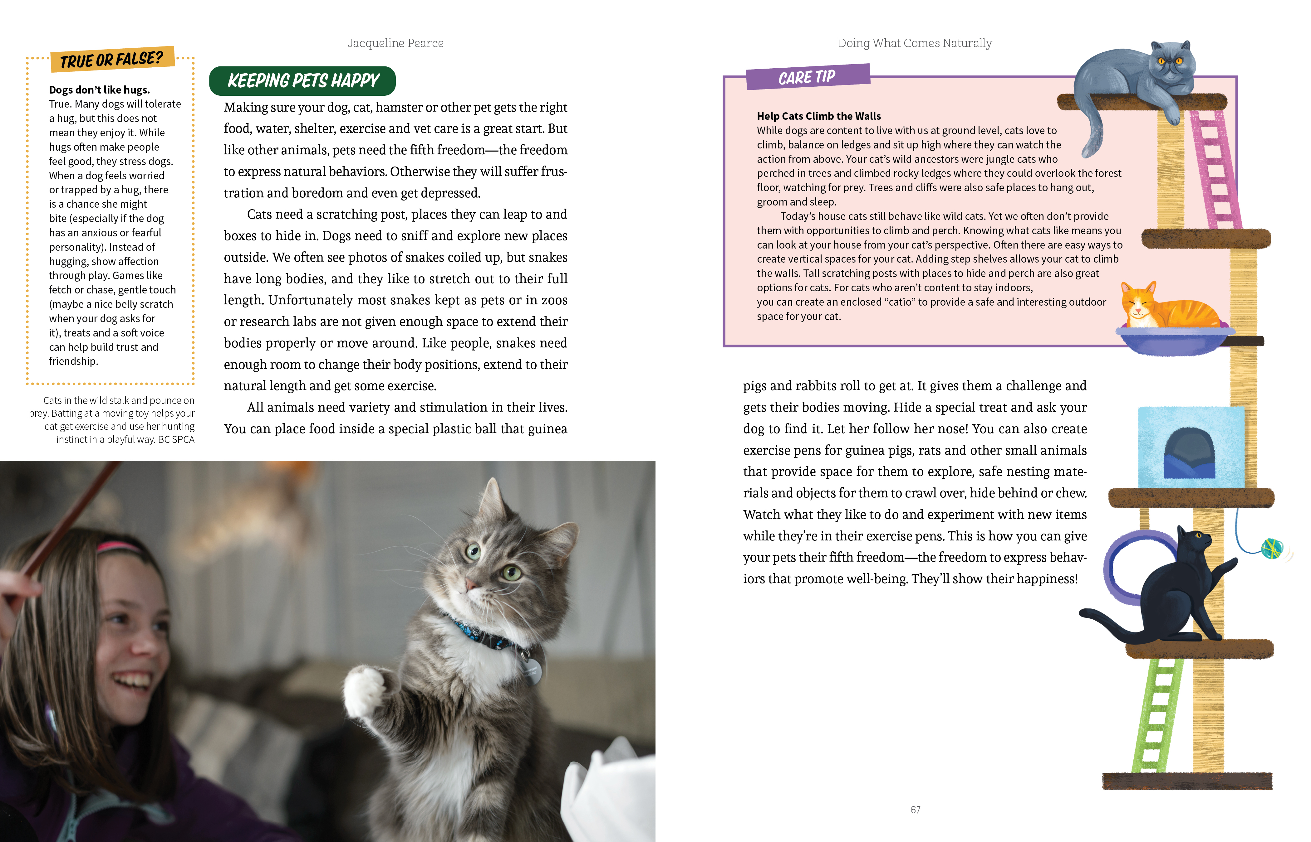 Modern science tells us that animals experience a wide range of emotions—from fear and anxiety to friendship and happiness. What Animals Want is an animal-care book with a difference. It introduces young readers to the Five Freedoms and helps them think about their pets’ physical and emotional needs, providing a framework for thinking about the welfare of all animals in human care, including farm, exotic and wild animals. Author Jacqueline Pearce wrote this book in consultation with the British Columbia Society for the Prevention of Cruelty to Animals (BC SPCA), an organization internationally recognized for its innovative humane education and animal welfare work.