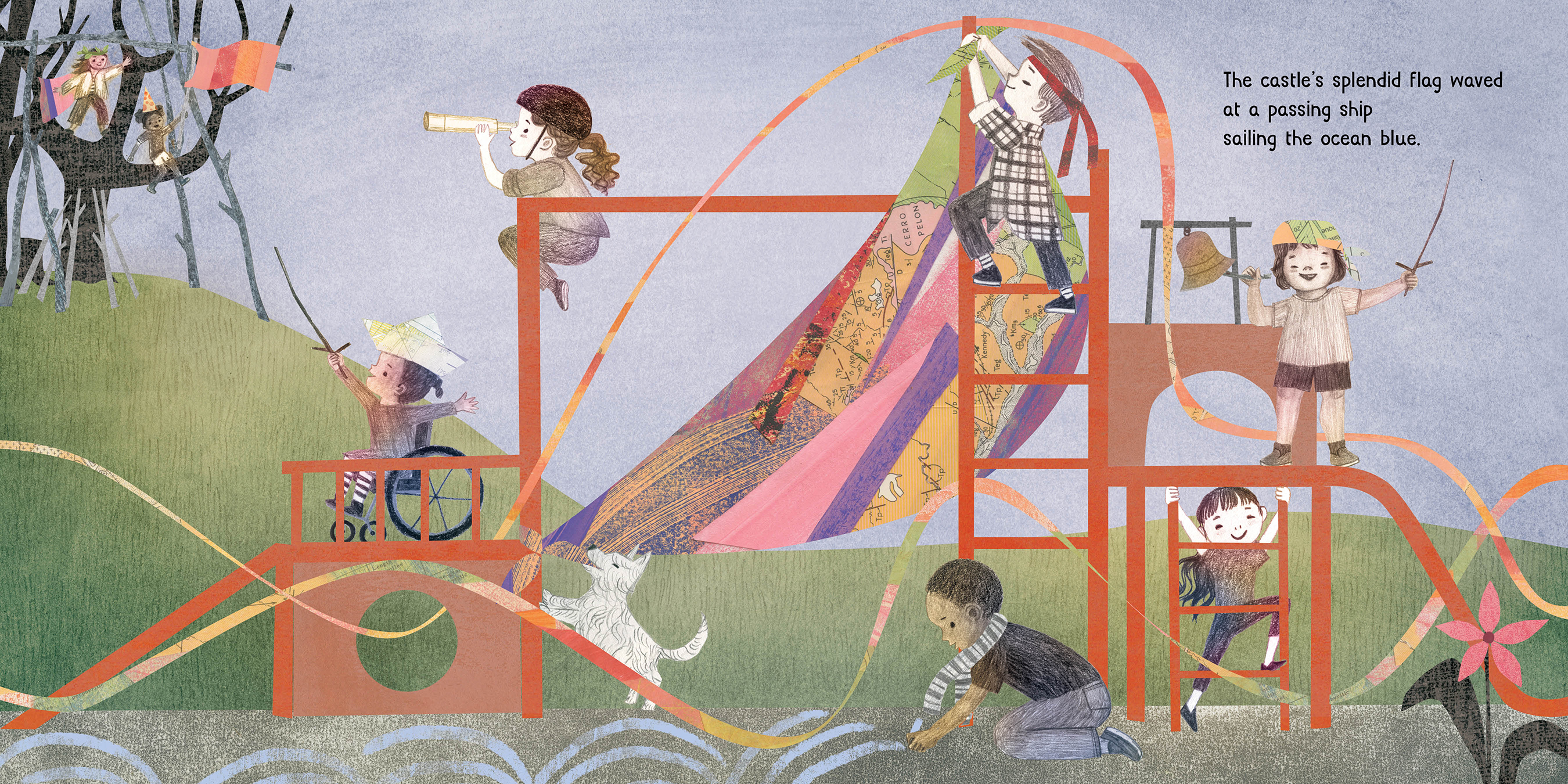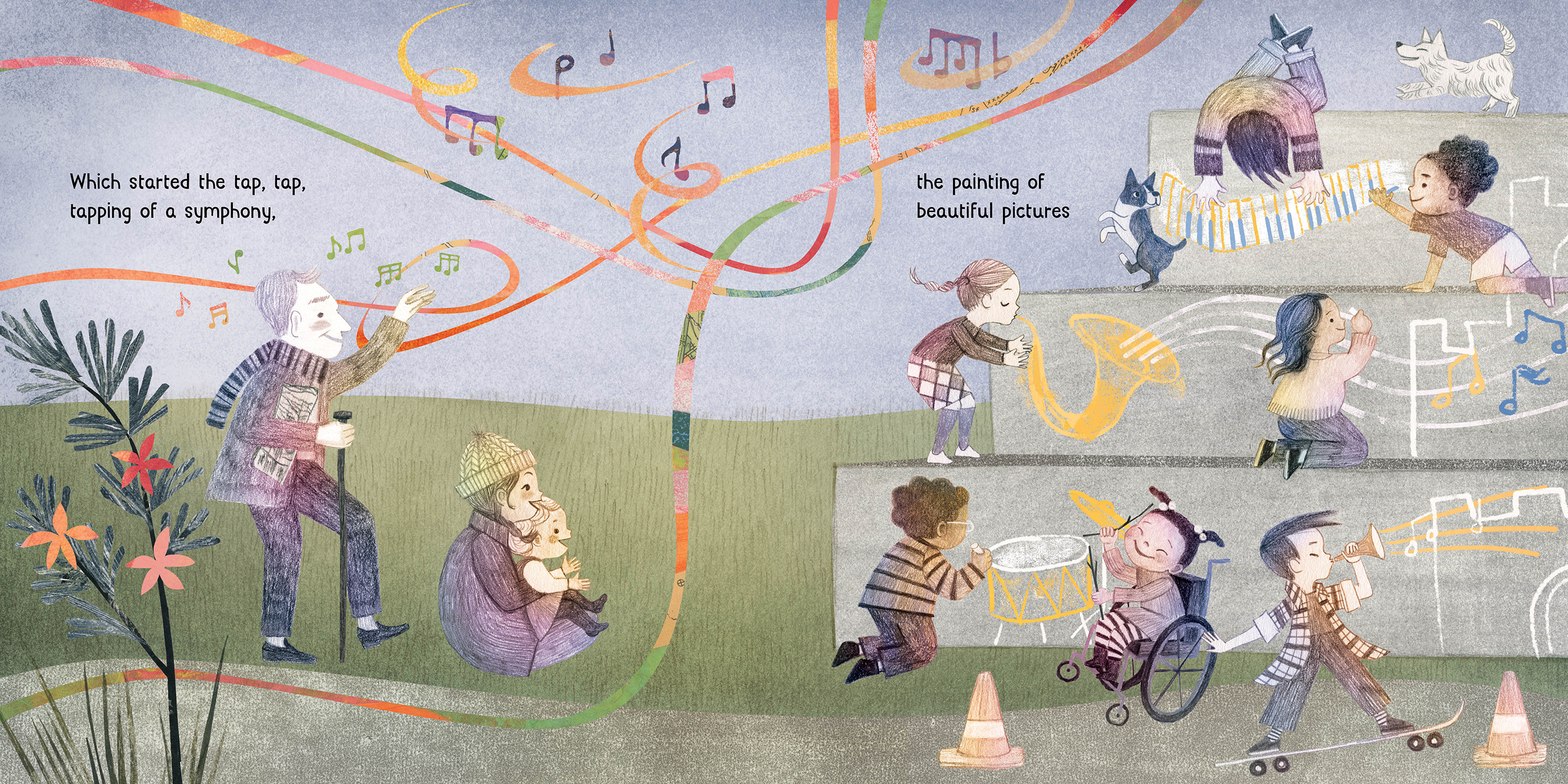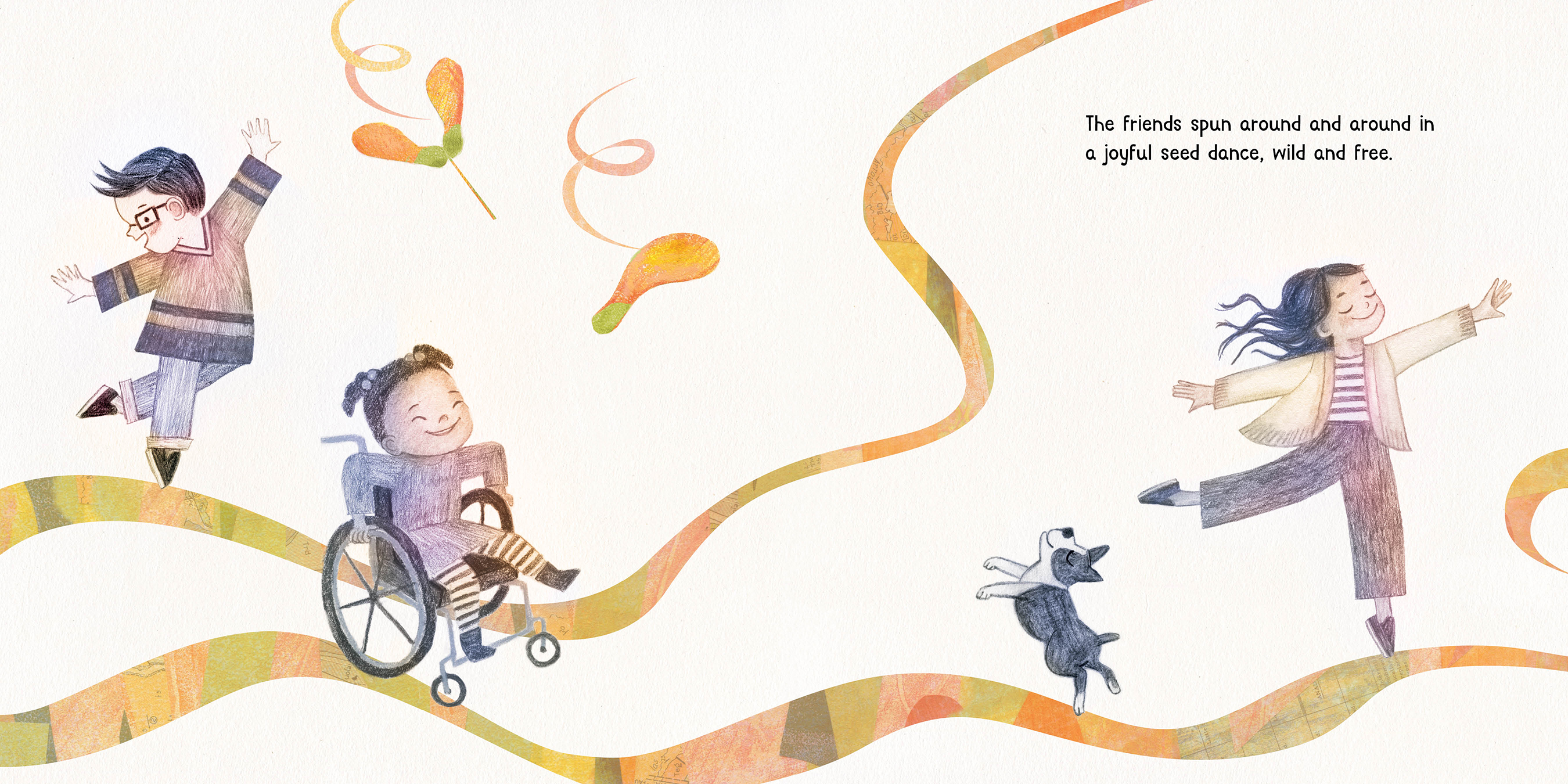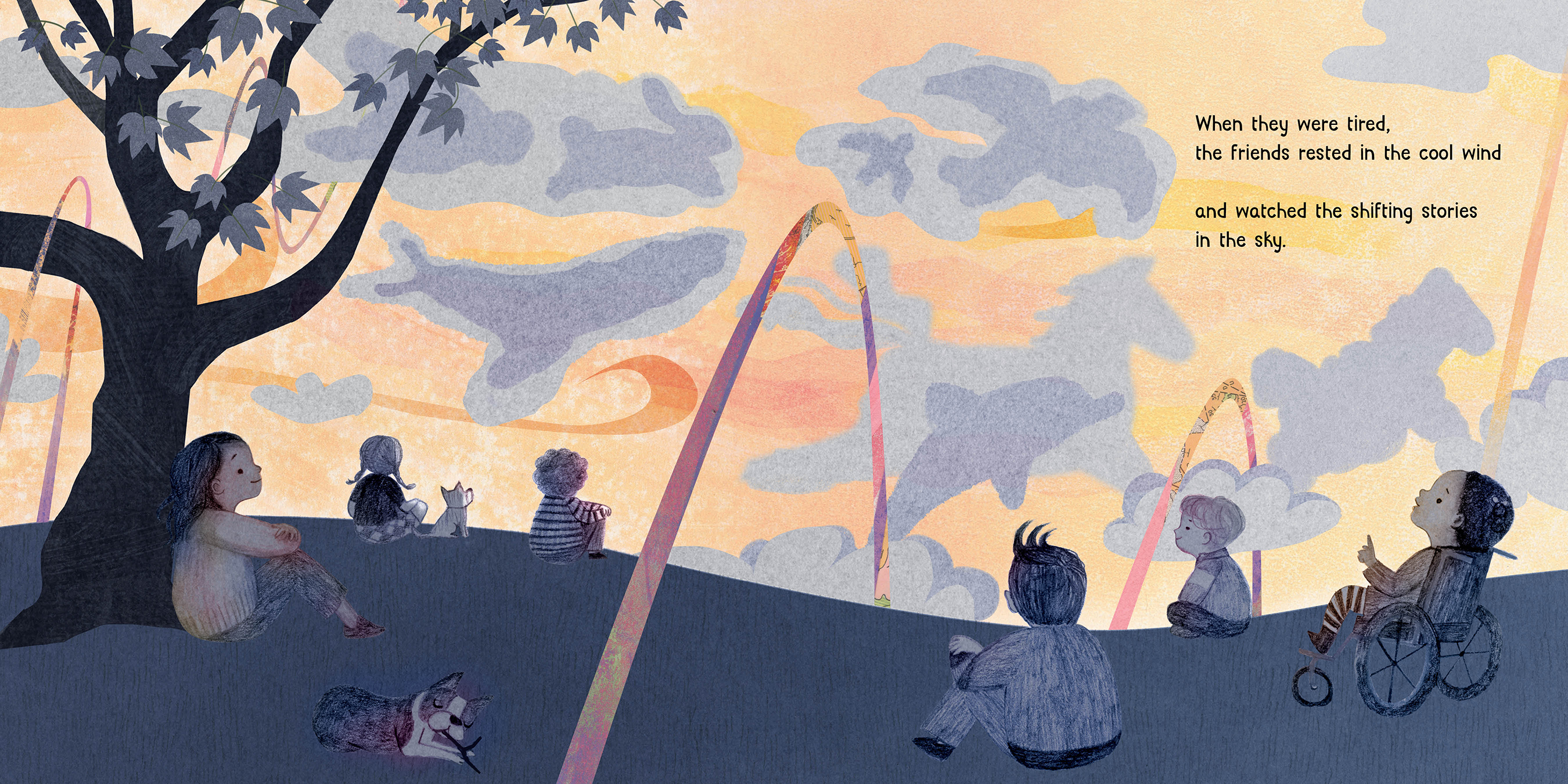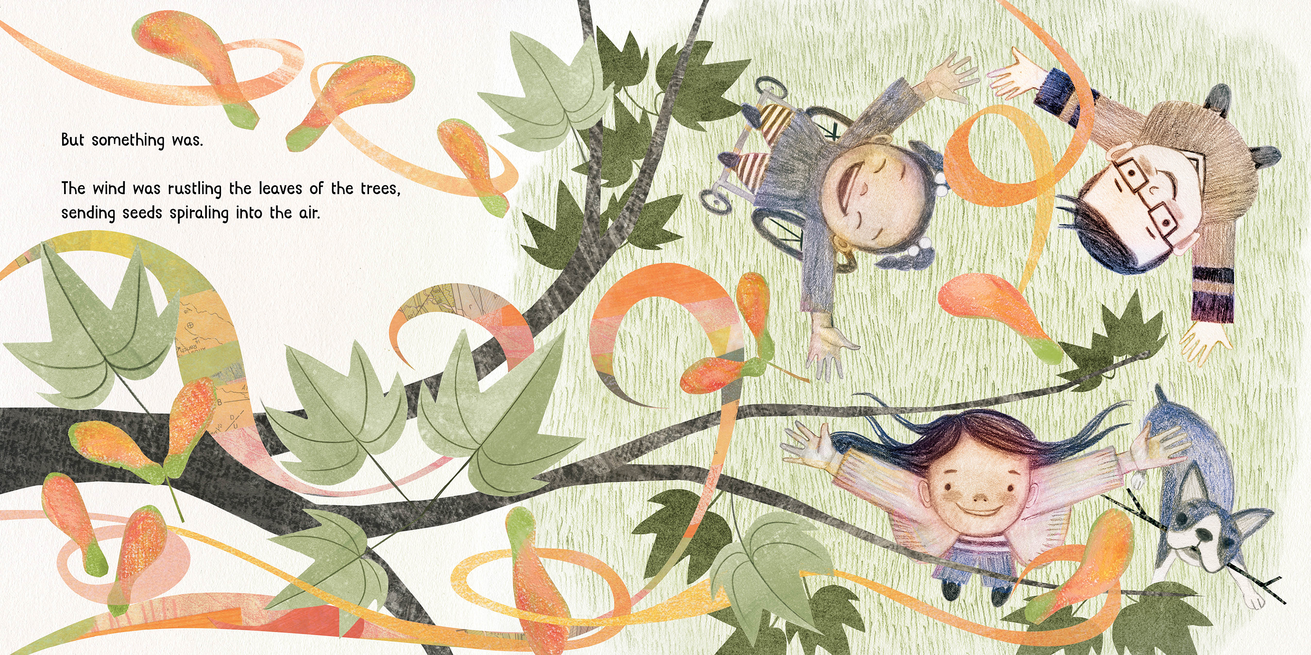 The wind is stirring the trees and sending maple keys spiralling down through the air, inspiring the children to whirl and spin...which makes a baby laugh and clap, and a man tap a rhythm with his cane. Soon, the kids and those around them are part of a domino effect of creativity from painting and building castle forts to having daring adventures and sailing the imaginary seas, and finally staging a colorful parade and watching stories unfurl in the clouds.