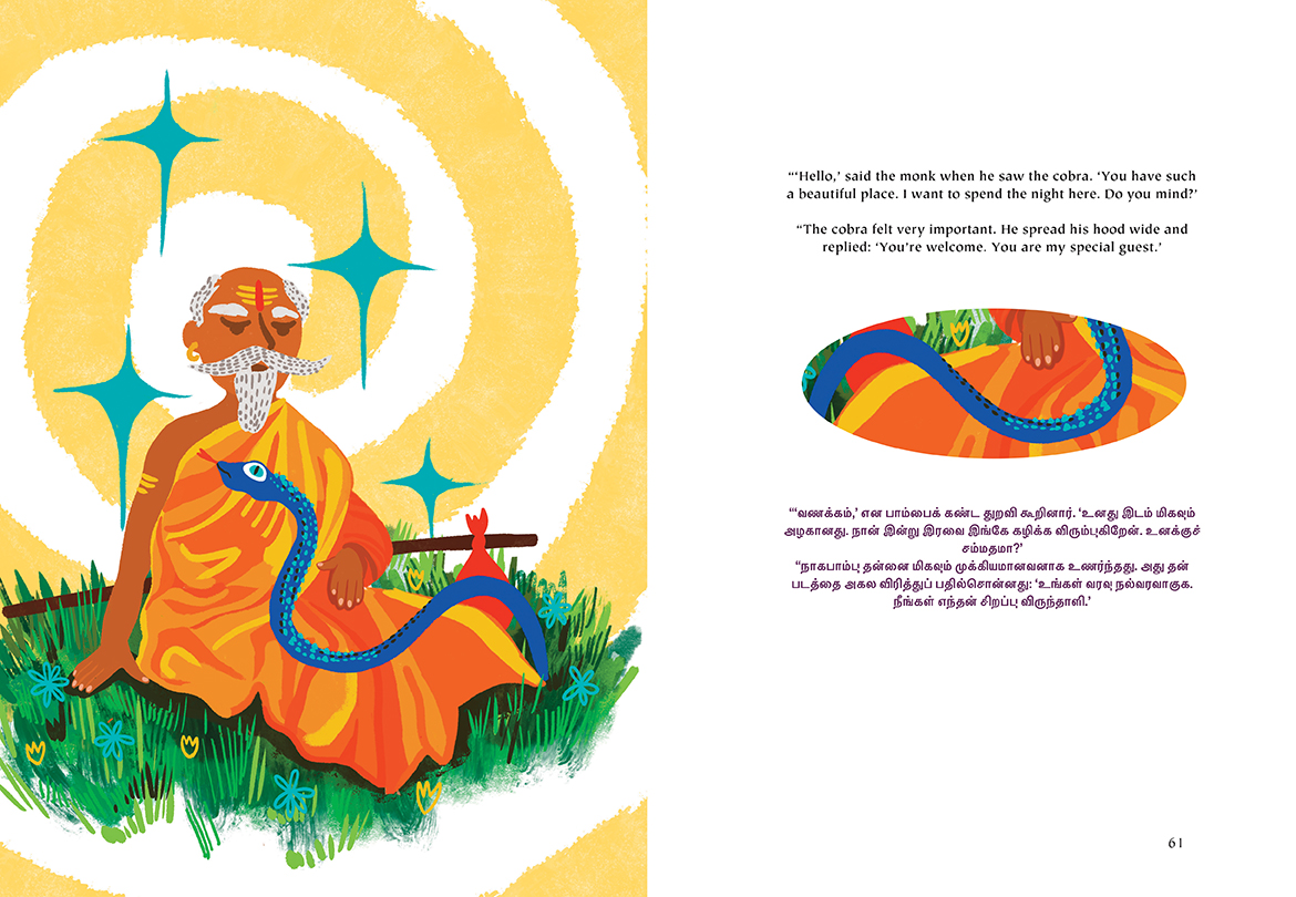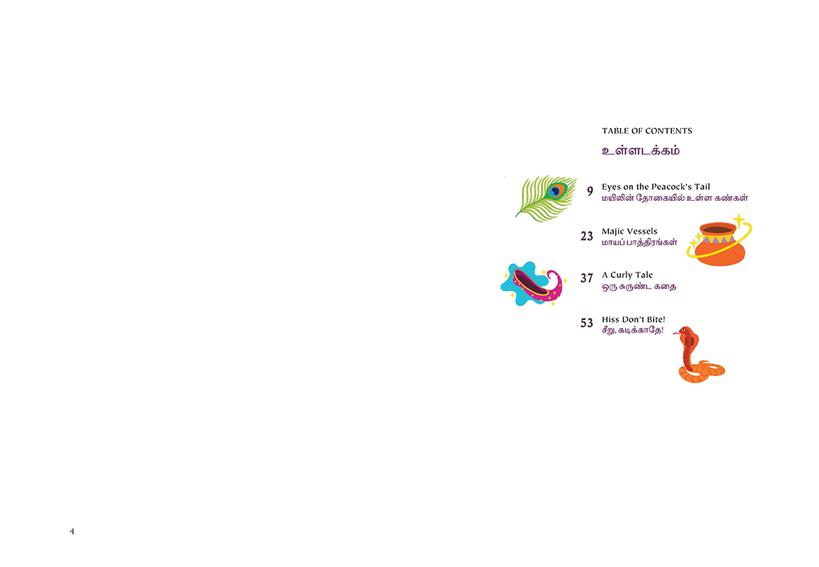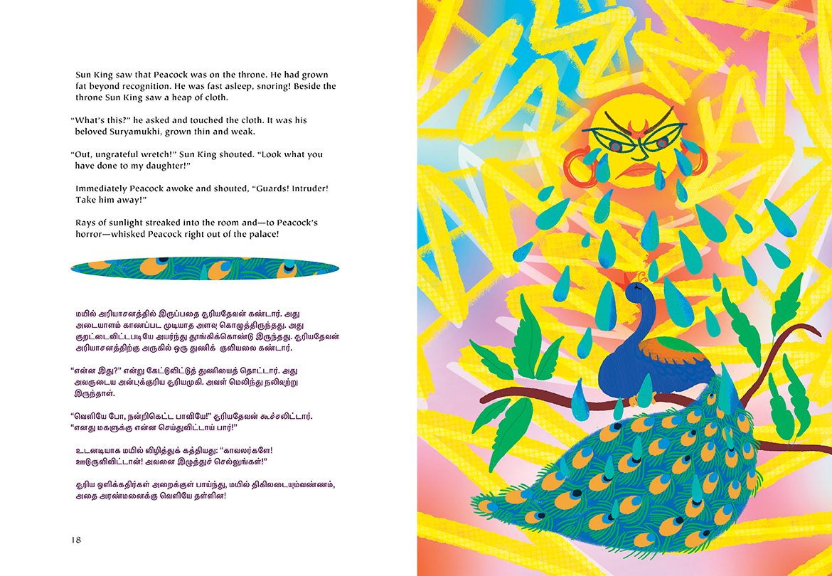 Acclaimed South-Asian-Canadian storyteller Sharada Eswar retells four fun and fascinating folktales from across India. Whether she’s telling how the vain peacock came to have eyes on his tail or of a poor family suddenly blessed with abundance, of a powerful ghost that faces an unexpected challenge or the wisdom a monk gifts to a snake, Eswar’s tales are engaging and full of life. The book features a full translation in Tamil, and includes bright and playful illustrations. This collection, which includes a tale from Rajasthan, Tamilnadu, Bihar, and Bengal, is a wonderful way to celebrate an important element of our multicultural identity.