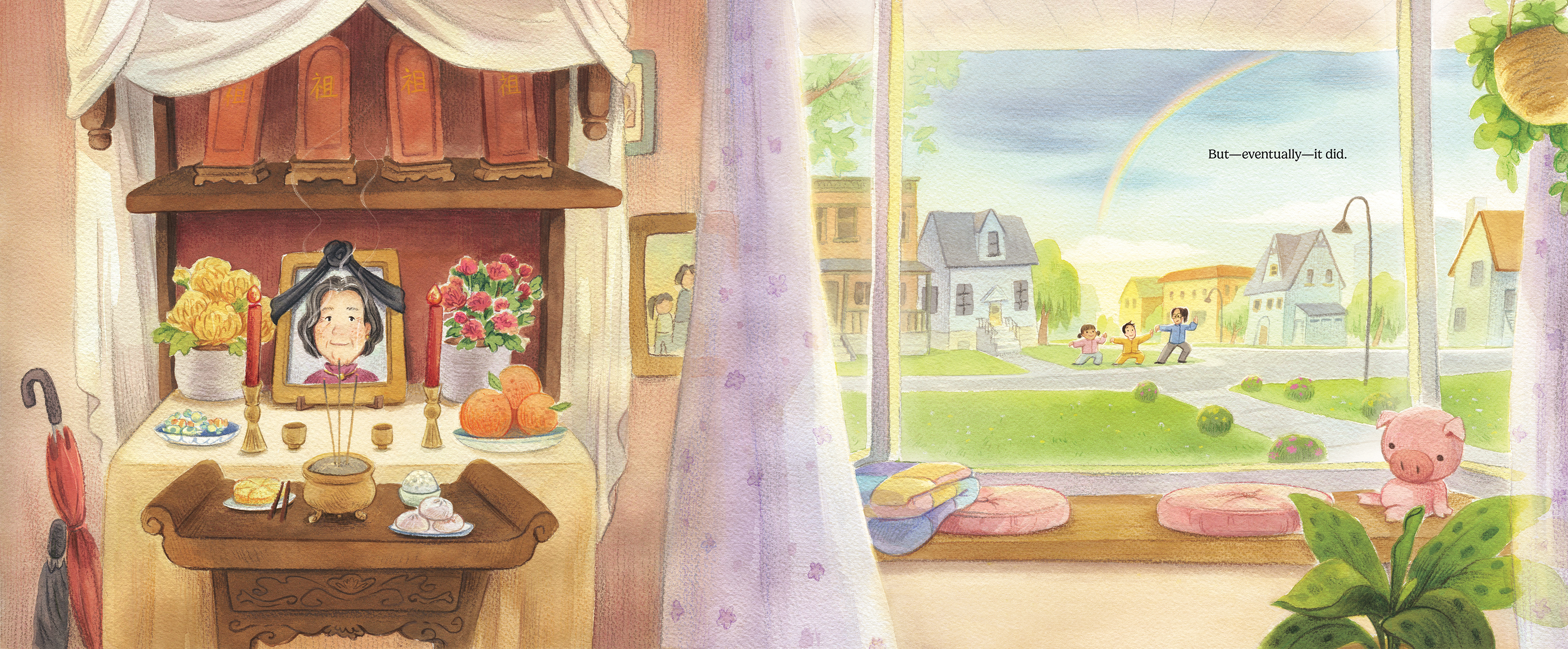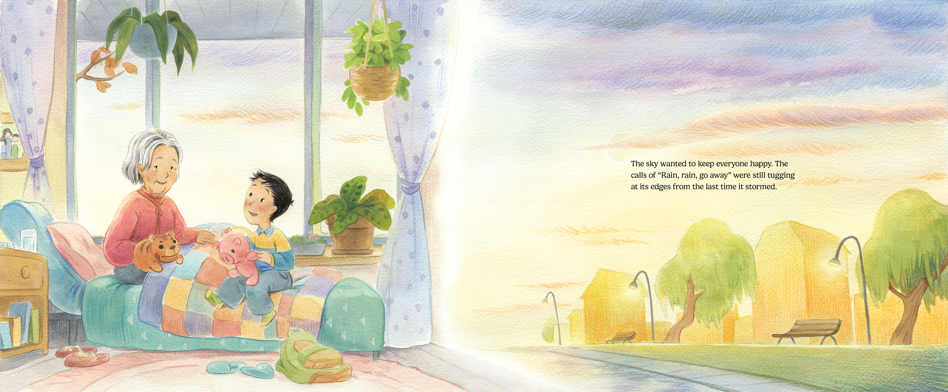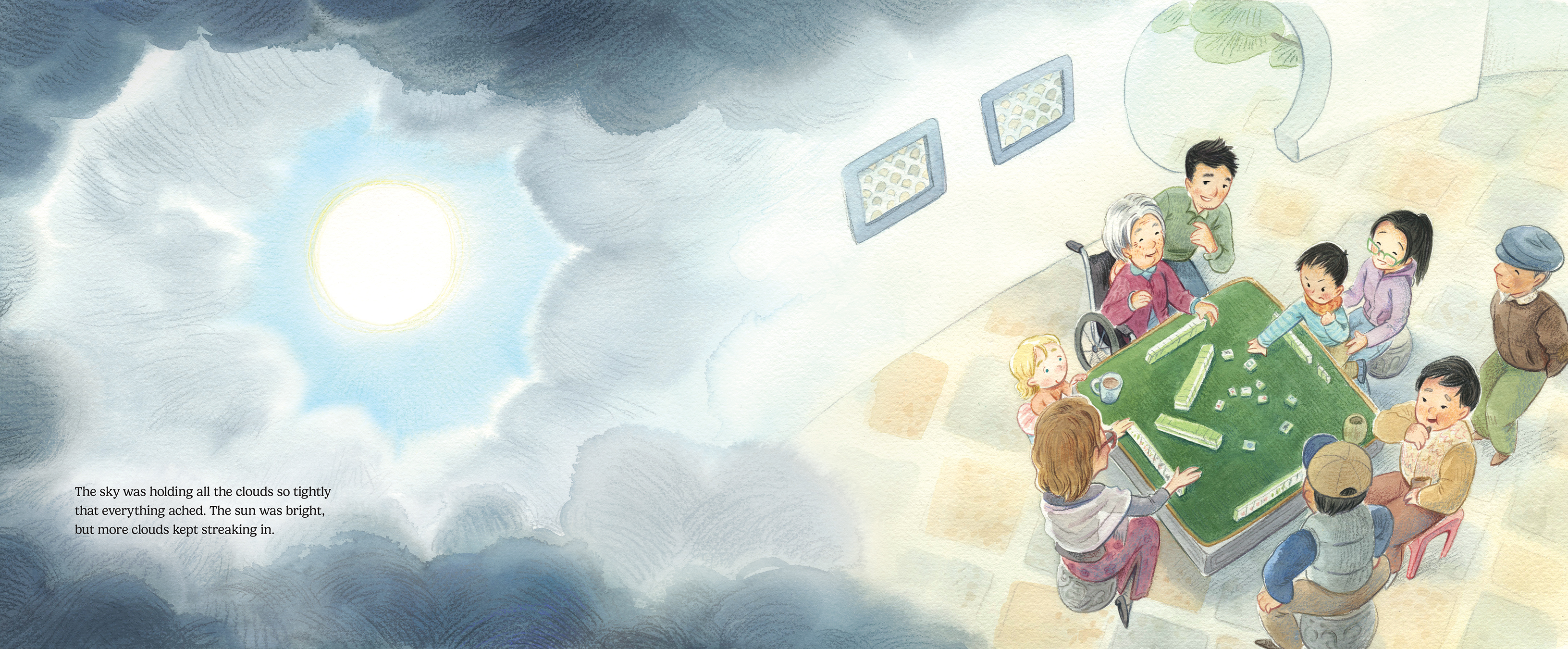 It does its best to contain the clouds and rain so the boy and his grandma can have a picnic together, eating bao. Or do Tai Chi, or play mahjong in the park. But his grandma hasn’t been well lately. And the sky isn't sure it can hold the clouds back anymore…like when the ambulance comes. And then when Grandma doesn’t come home.