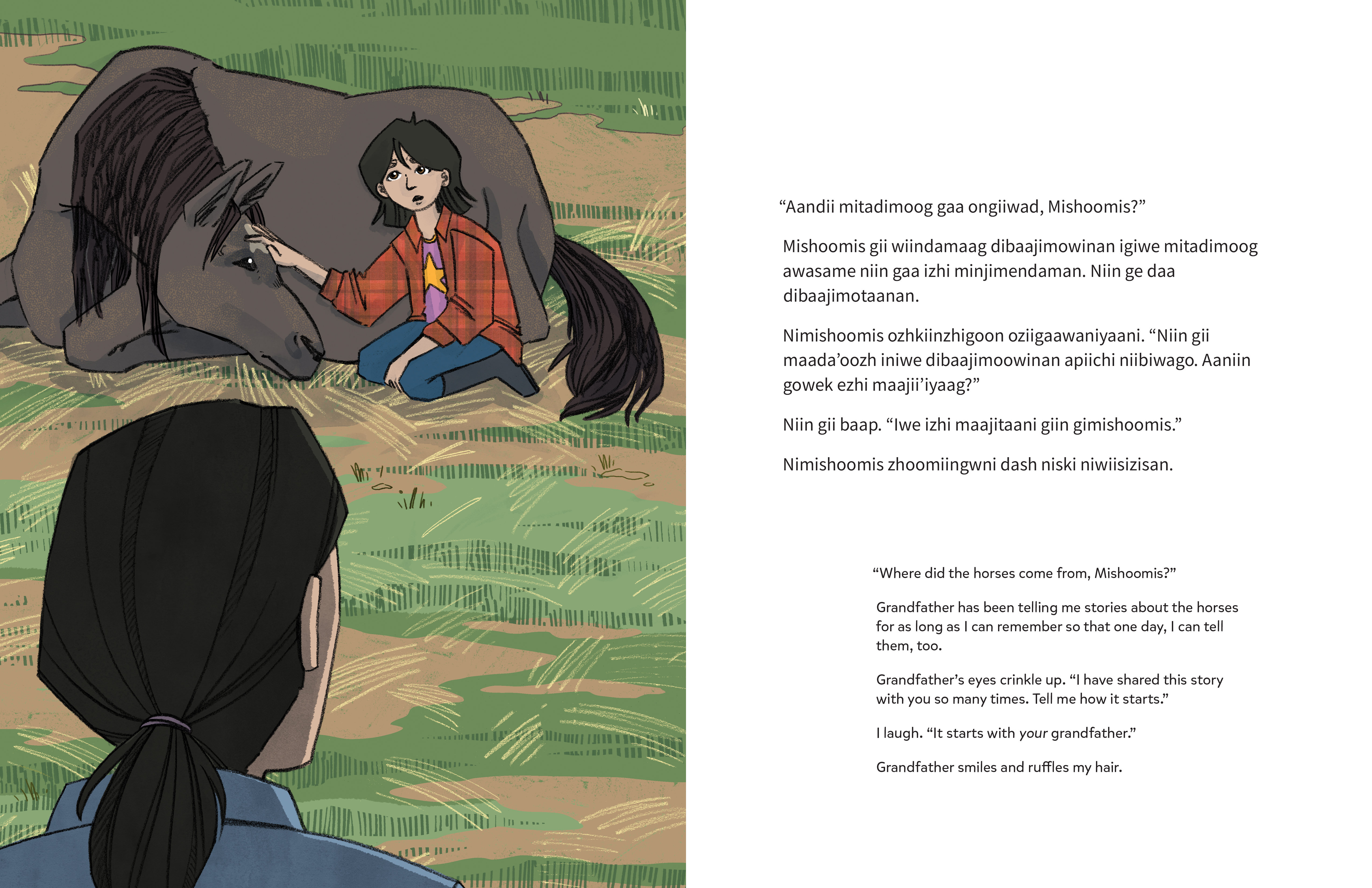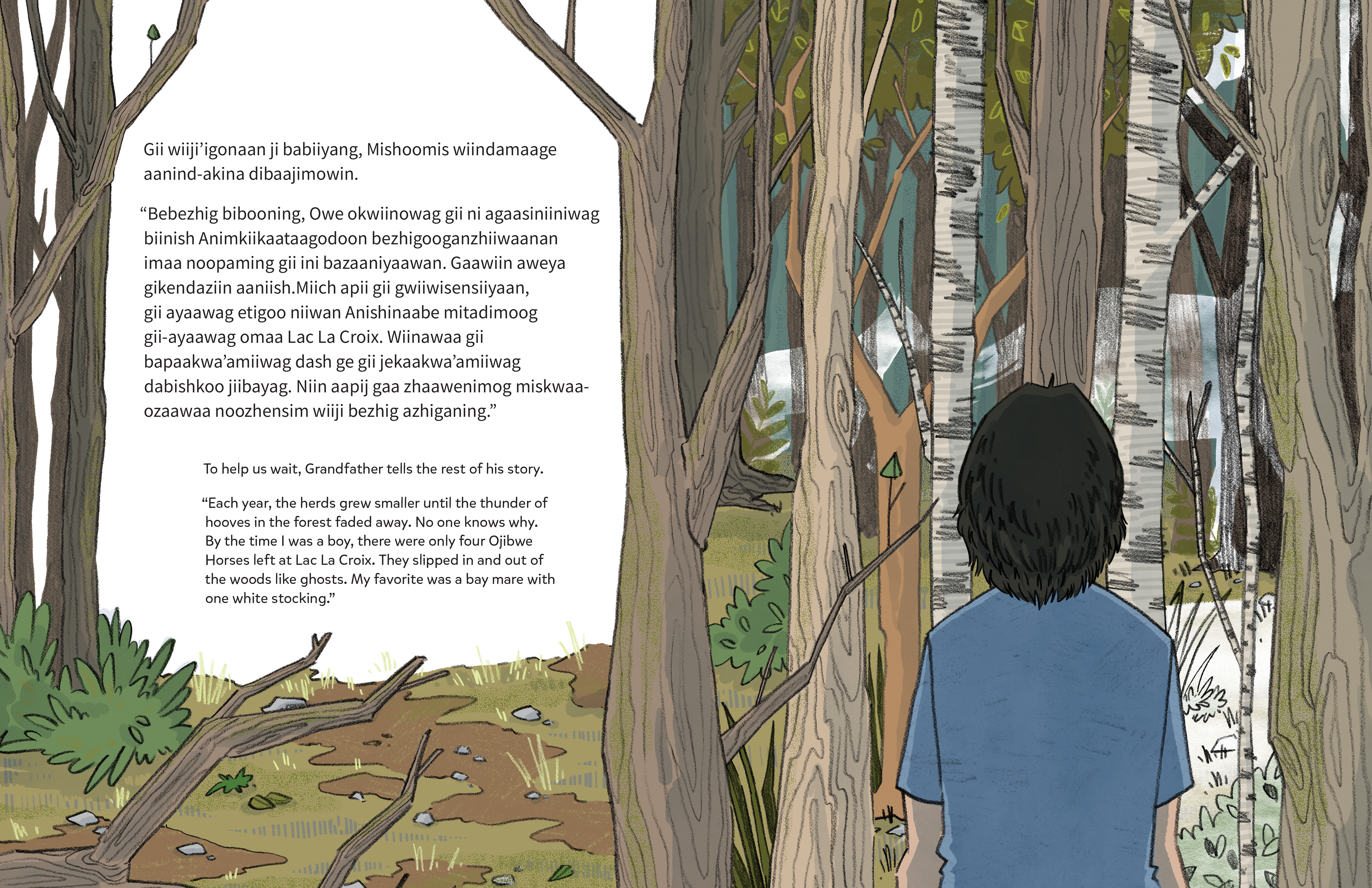 As they await the birth of a new foal, a man teaches his grandchild about the Ojibwe Horses that used to roam the forests of northwestern Ontario. The horses once ran wild and free, but when Grandfather was a boy, they almost disappeared. Now he is the caretaker of his own small herd, keeping the breed alive for future generations and teaching his grandchild about the loving bond between human and animals. This dual language edition contains the story in both Anishinaabemowin (Ojibwe) and English.