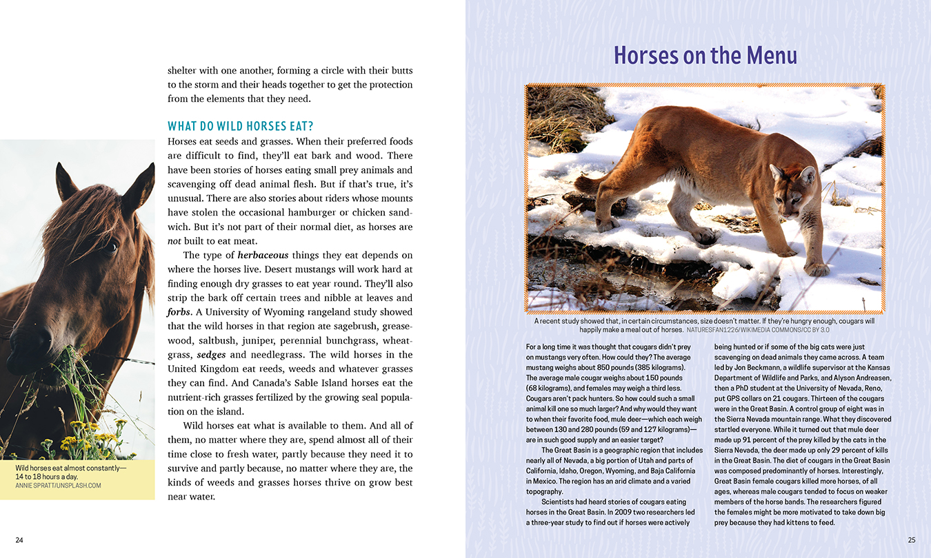 In this book, readers discover the history, biology and ecology of wild horses and the key role young people are playing in protecting wild horse populations to keep them running free for generations to come.