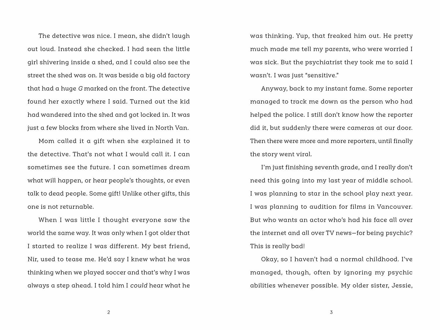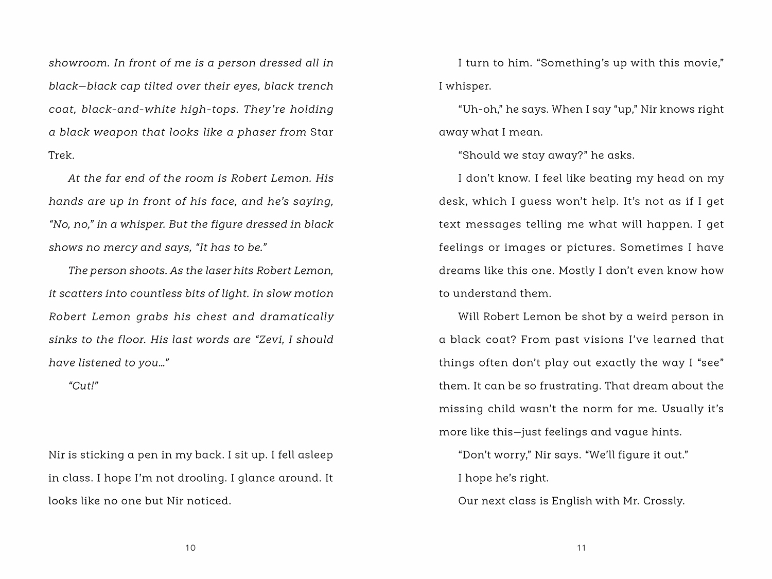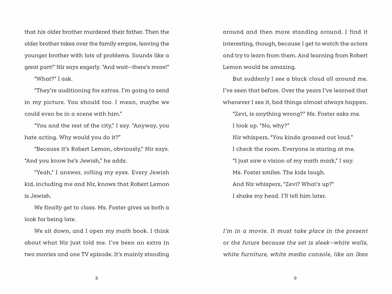 Sudden fame throws thirteen-year-old Zevi into the spotlight when the media discovers his secret abilities—and it’s ruining his life! He wants fame as an actor, not as a psychic. So when Robert Lemon, a famous actor, comes to town to film a movie, Zevi hopes this is his chance to turn things around. Until he begins to sense that the star’s life is in danger. When “accidents” start befalling Robert Lemon on the movie set, it’s up to Zevi to use his gift to save the famous actor.