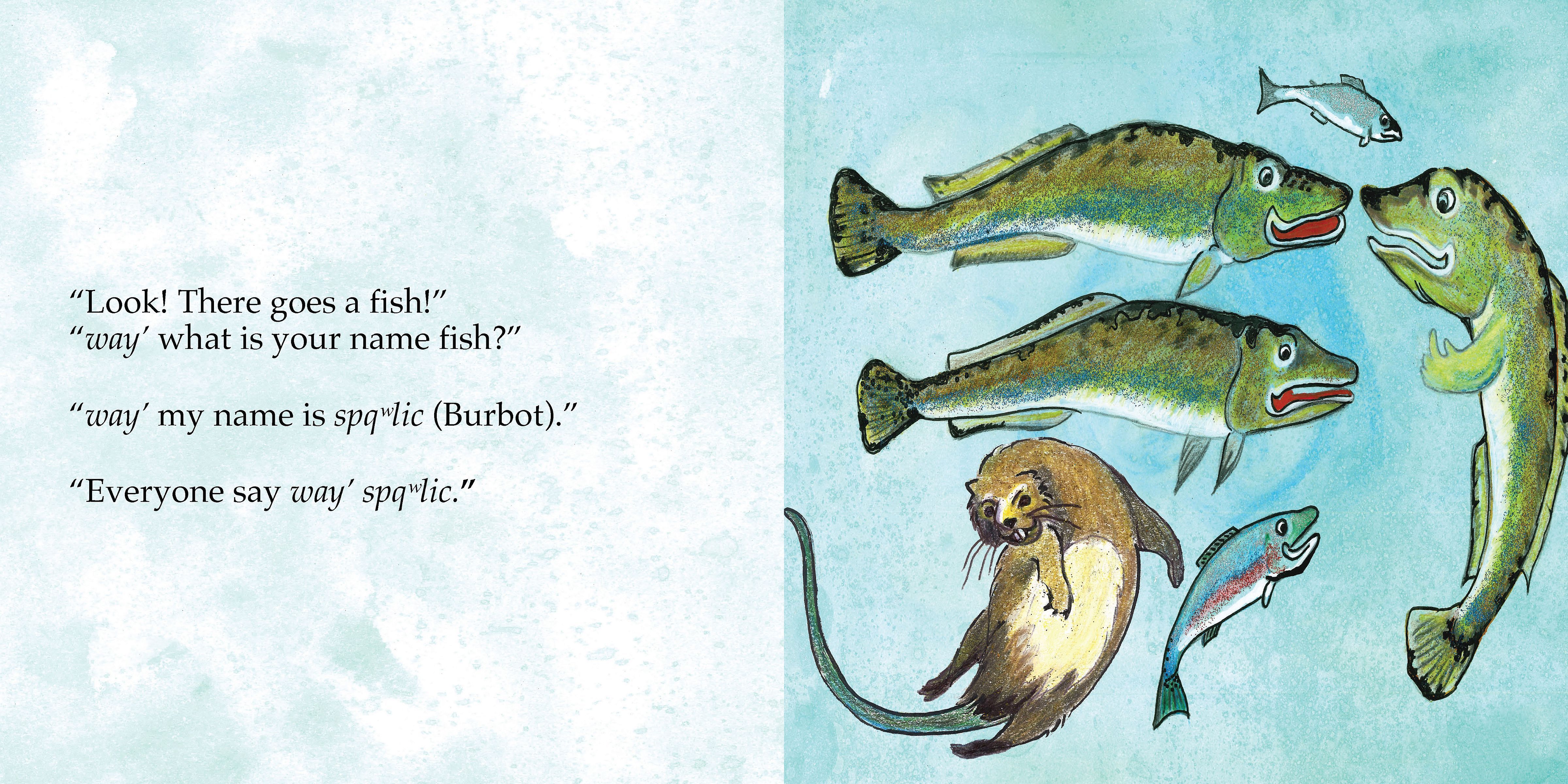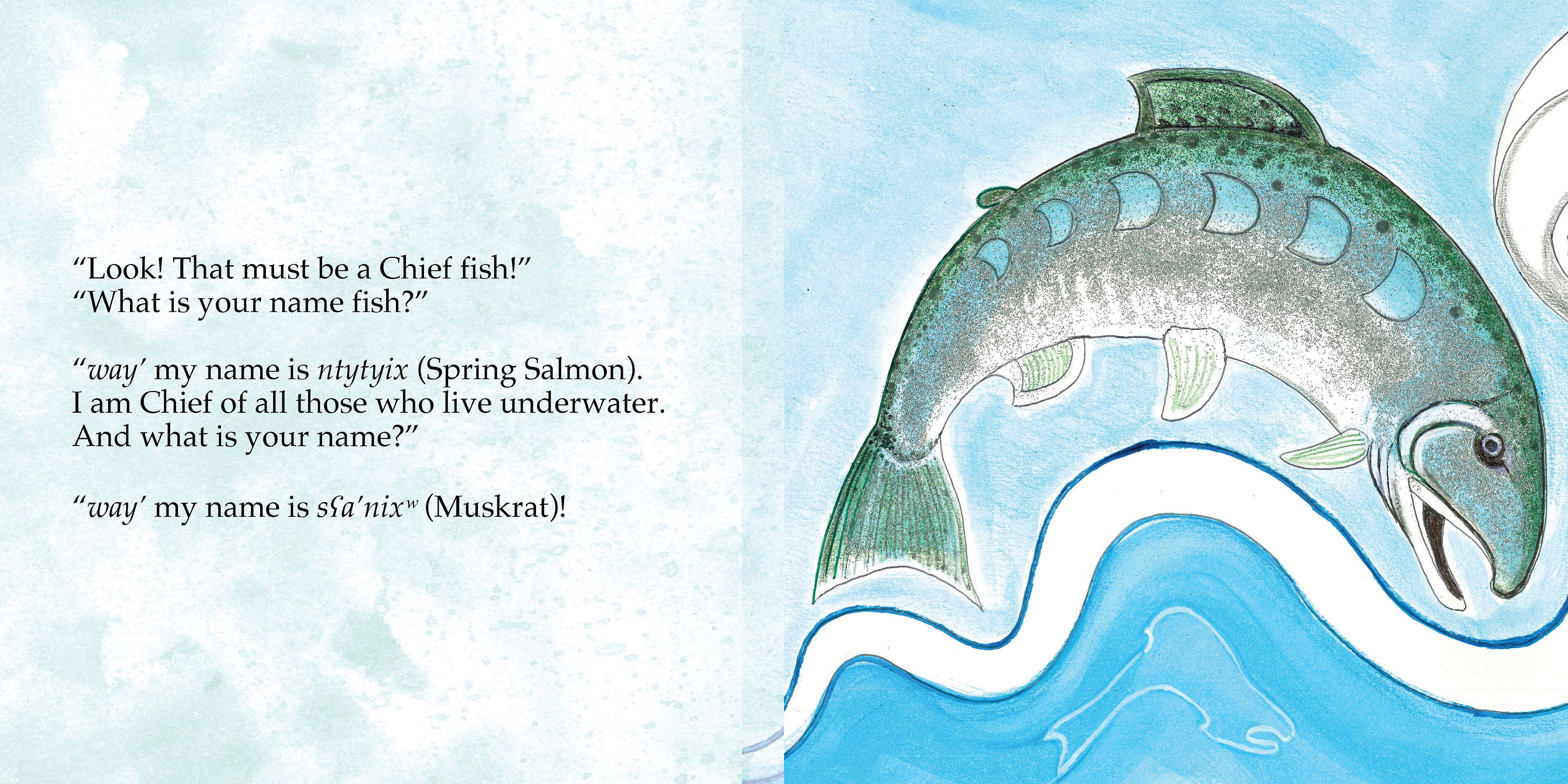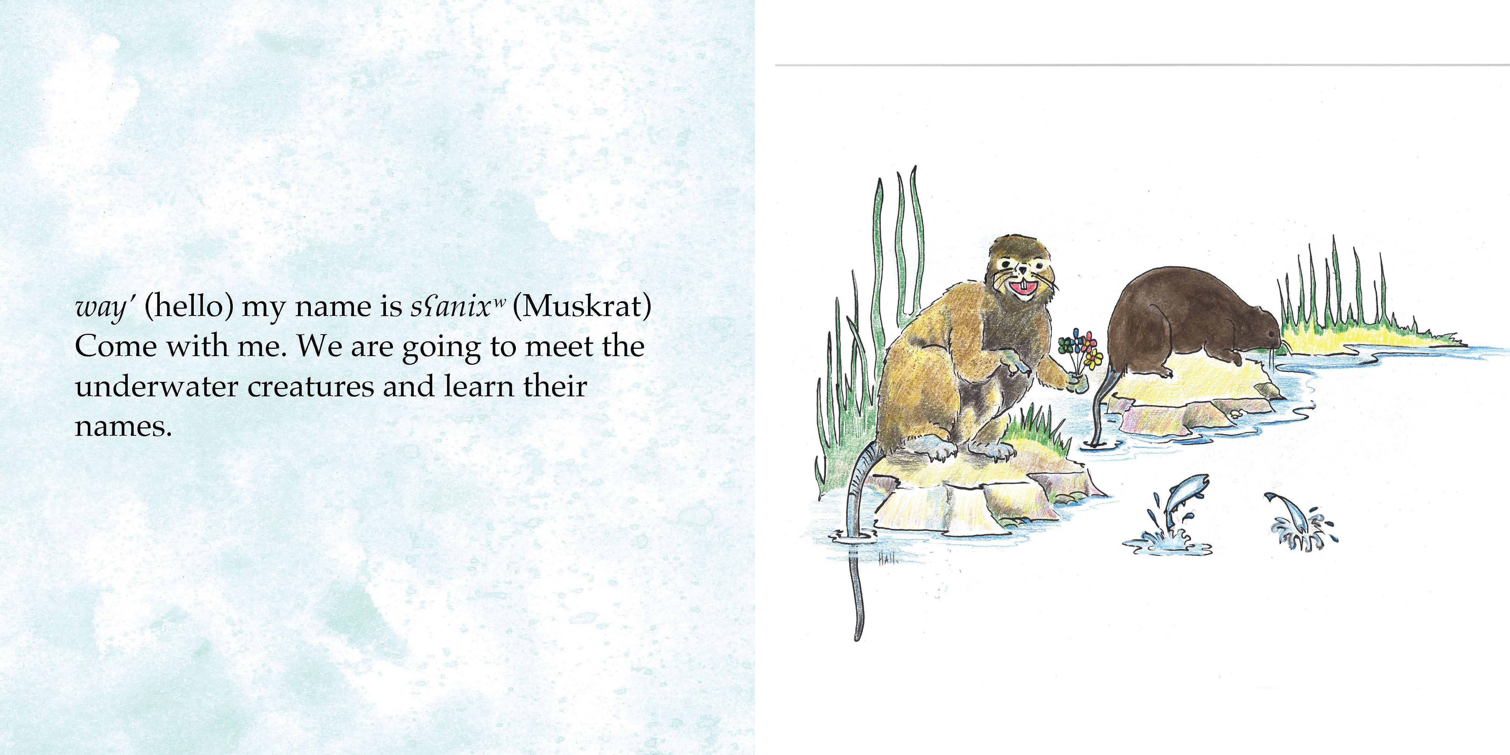 kəxntim sʕanixʷ k̕əl nixʷtitkʷ acxʷəl̕xʷalt / We Go With Muskrat to Those Living Underwater is an interactive story with sʕanixʷ (Muskrat) in the lead, allowing readers to learn both the n’syilxwcn and English names of underwater creatures living in the Okanagan Valley. The book seamlessly combines beautiful imagery with amusing descriptions as Muskrat introduces a diverse set of underwater creatures.