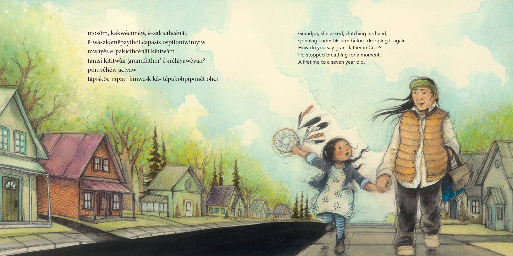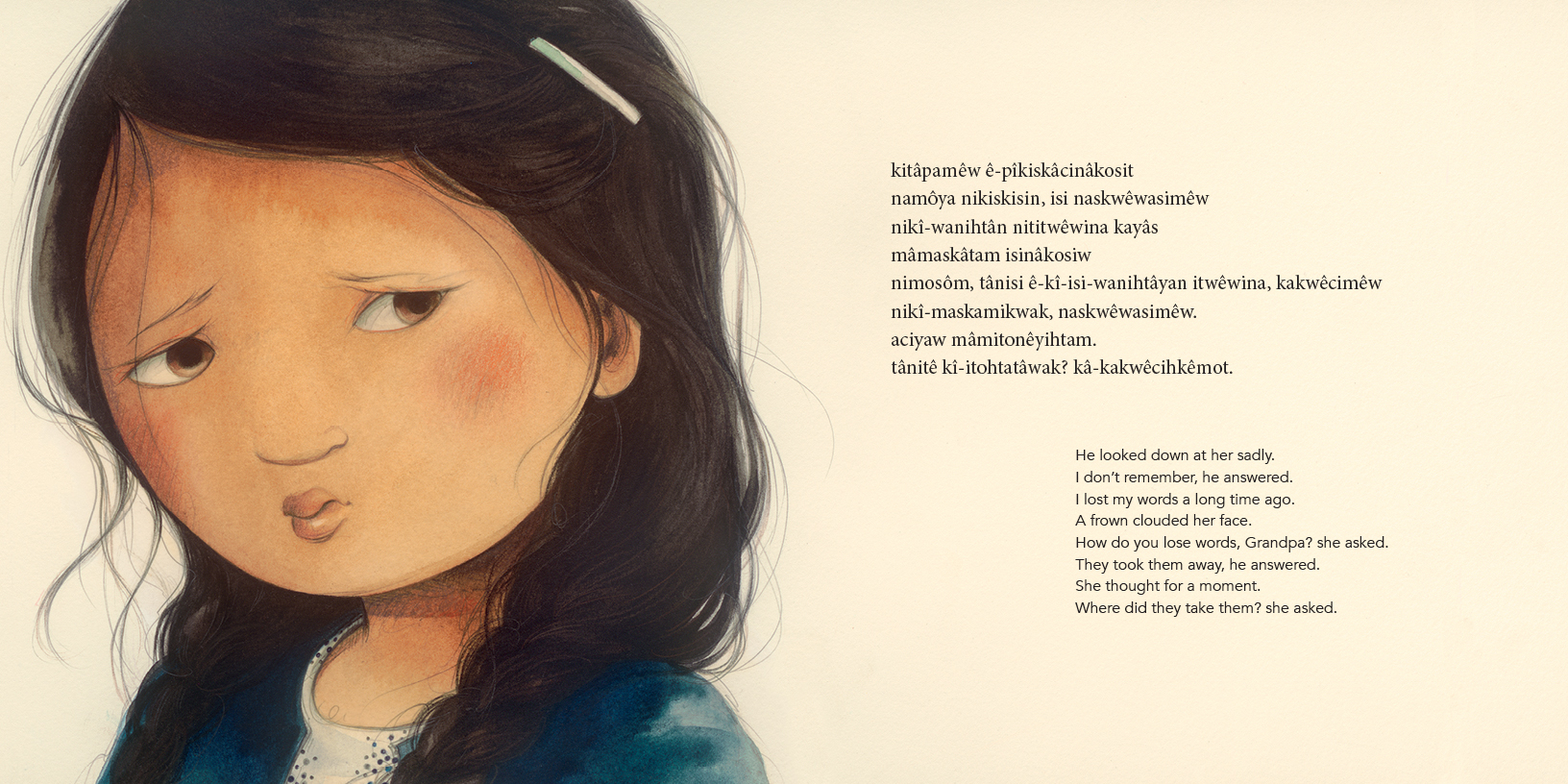 The dual language edition, in Plains Cree and English, of Stolen Words, the award-winning story of the beautiful relationship between a little girl and her grandfather. When she asks her grandfather how to say something in Cree, he tells her that his language was stolen from him when he was a boy. The little girl then sets out to help her grandfather find his language again. This sensitive and warmly illustrated picture book explores the intergenerational impact of the residential school system that separated young Indigenous children from their families. The story recognizes the pain of those whose culture and language were taken from them, how that pain is passed down, and how healing can also be shared.