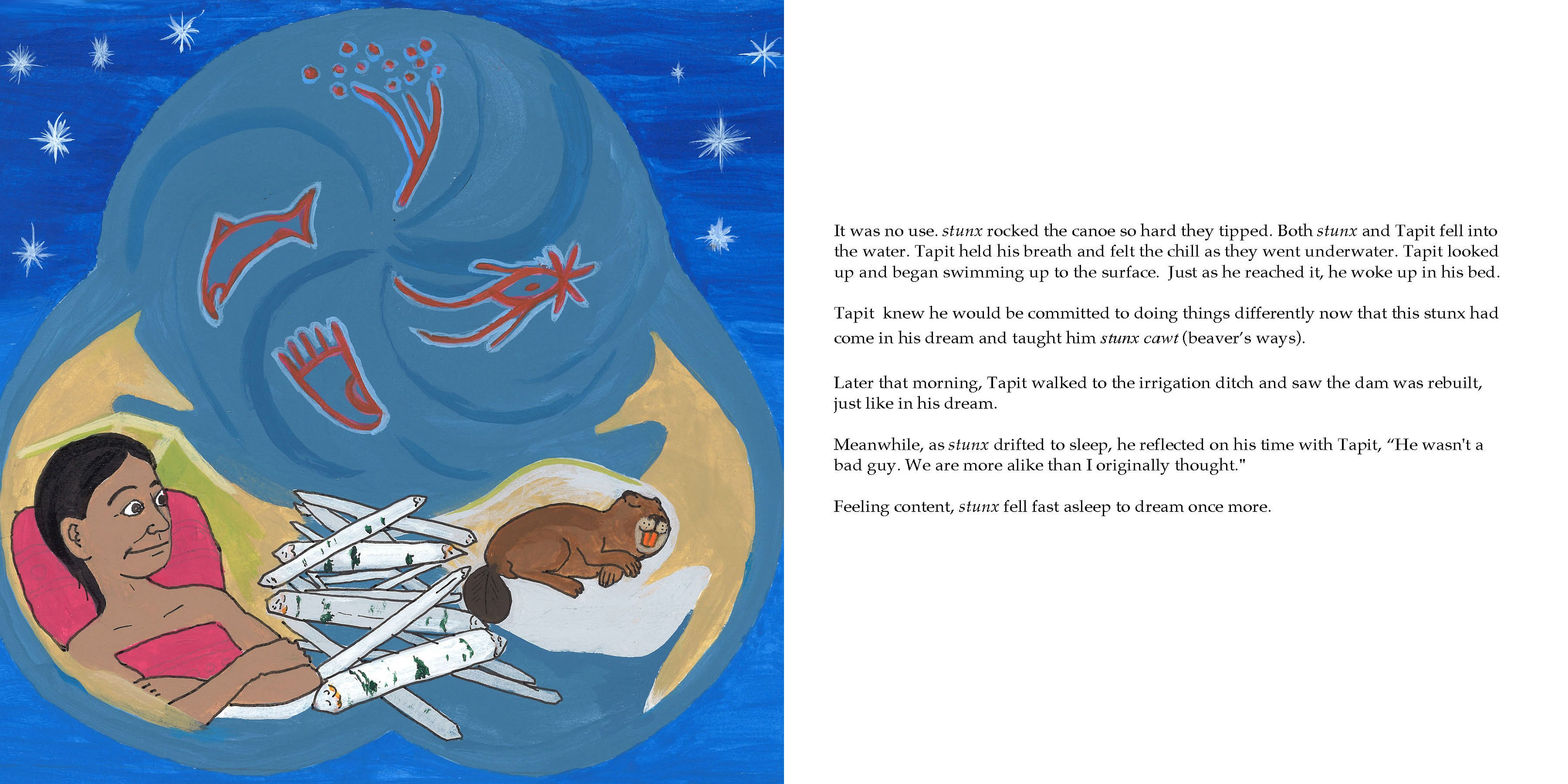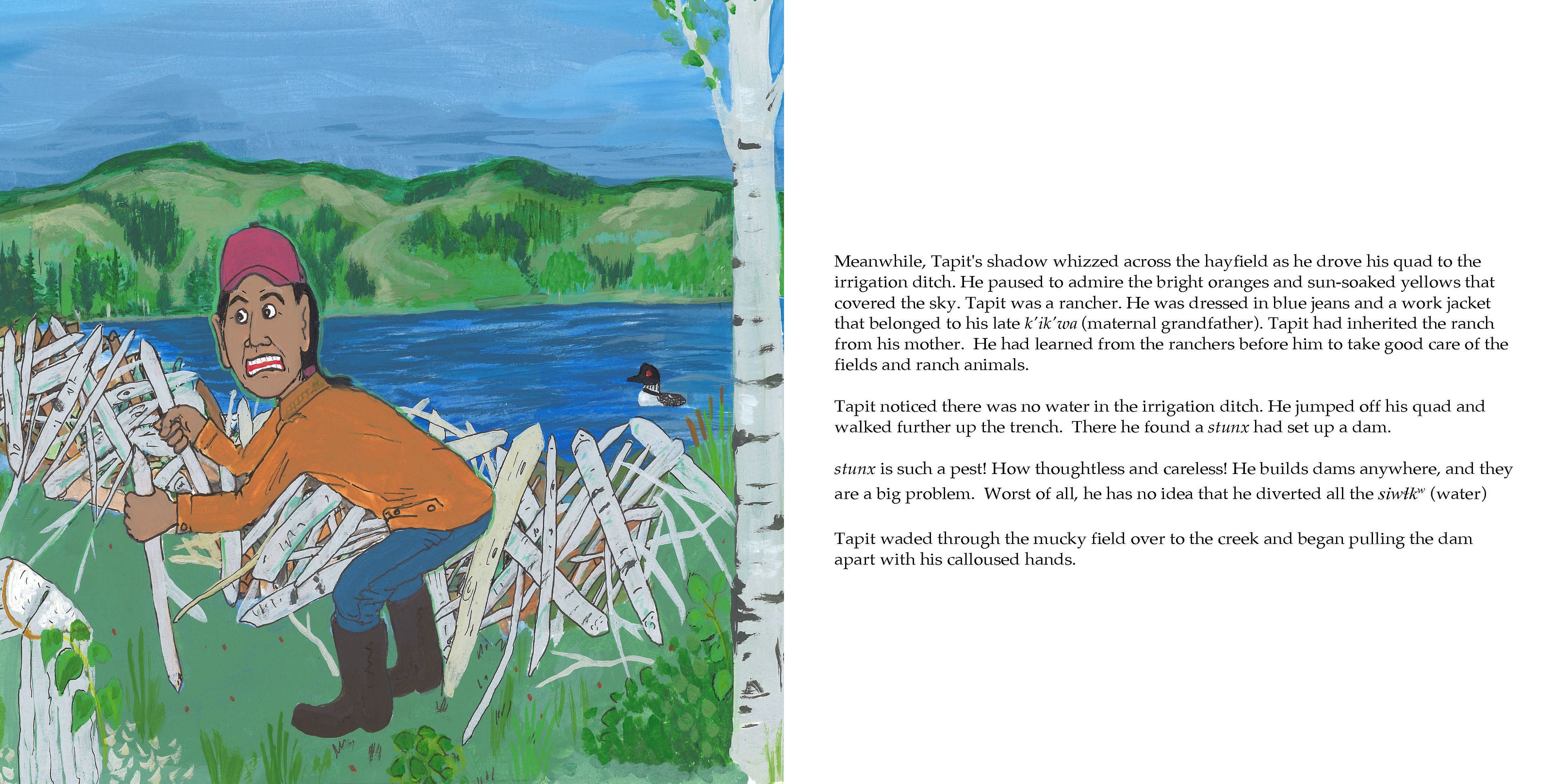 kʷu‿c̕əx̌ʷəntim təl stunx isck’ʷuls / Lessons From Beaver’s Work teaches children through storytelling to hold reverence for all life forms. The book depicts a conflict between Tapit, a rancher, and stunx (beaver), as they both try to meet their water needs. The touching humanity of stunx (Beaver) softens Tapit’s outlook, as he reminds Tapit that he is not the only one that depends on water.